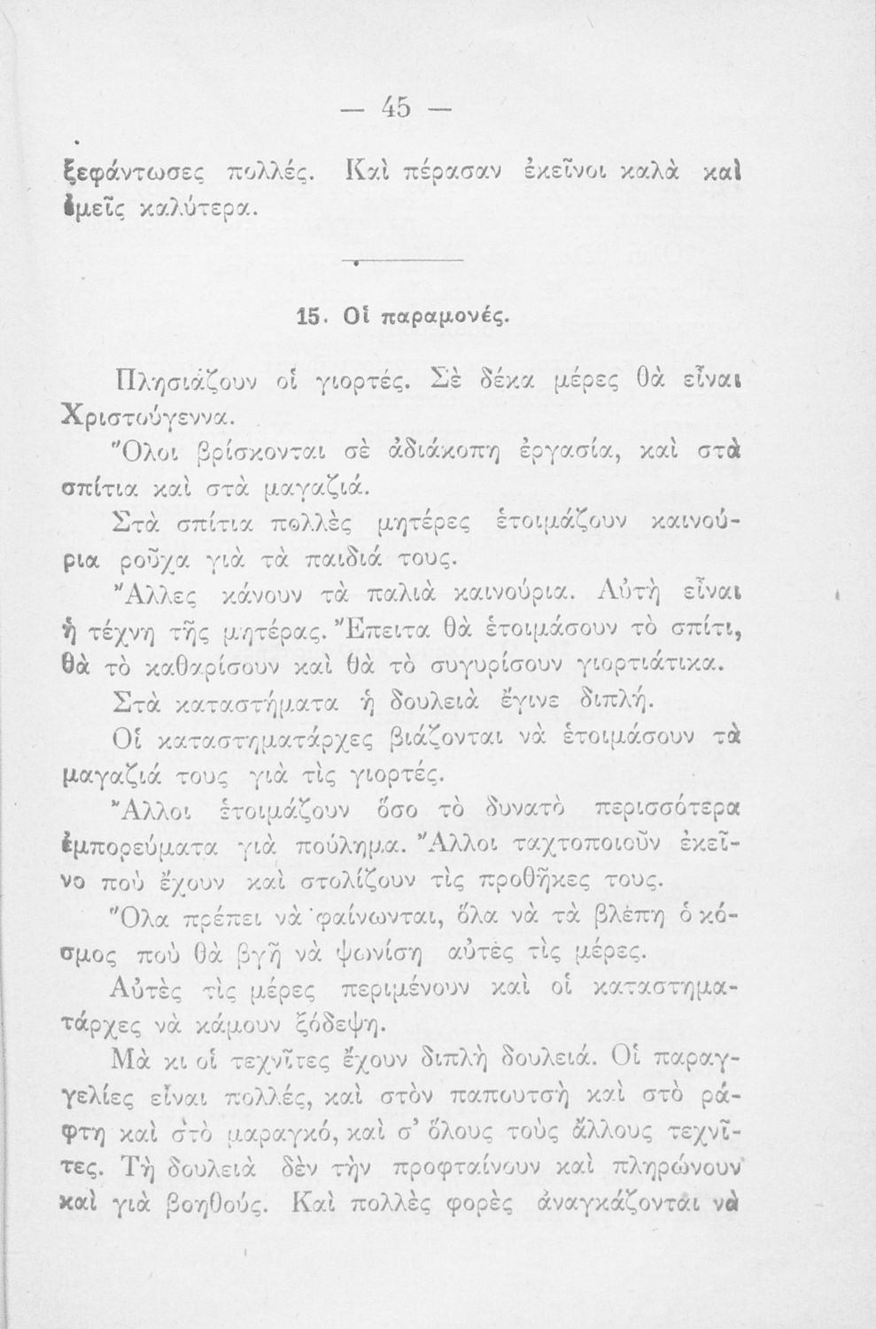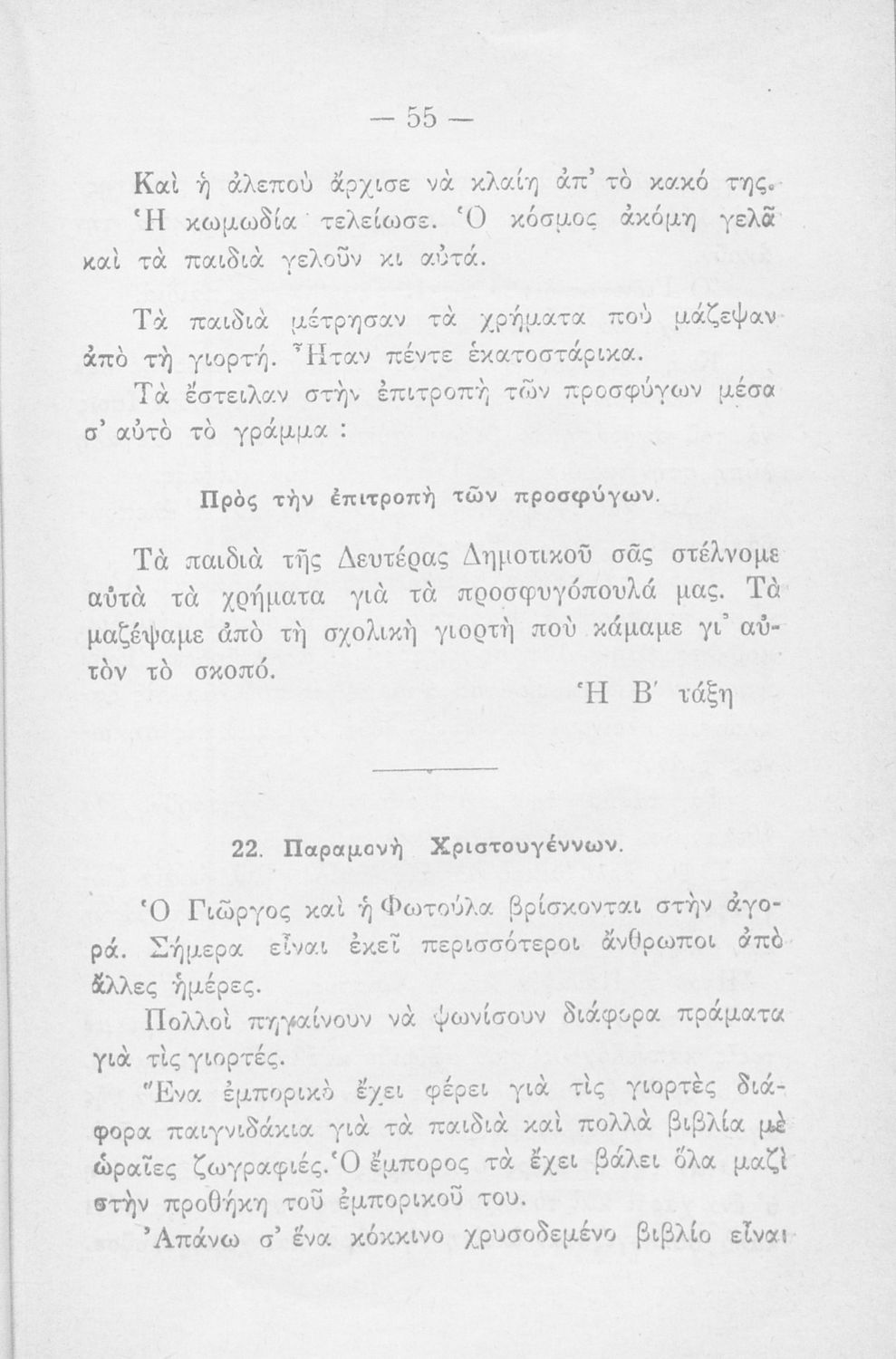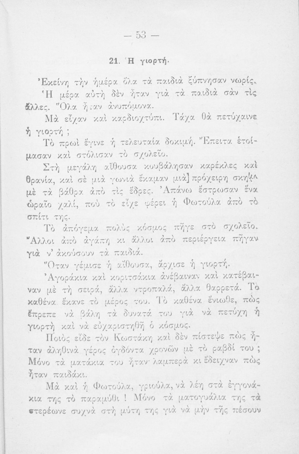Αναγνωστικό Β' Δημοτικού που περιλαμβάνει μικρά διηγήματα και ποιήματα με περιεχόμενο από την οικογενειακή και κοινωνική ζωή, την ελληνική φύση, την ελληνική ιστορία και μυθολογία και την υγιεινή.