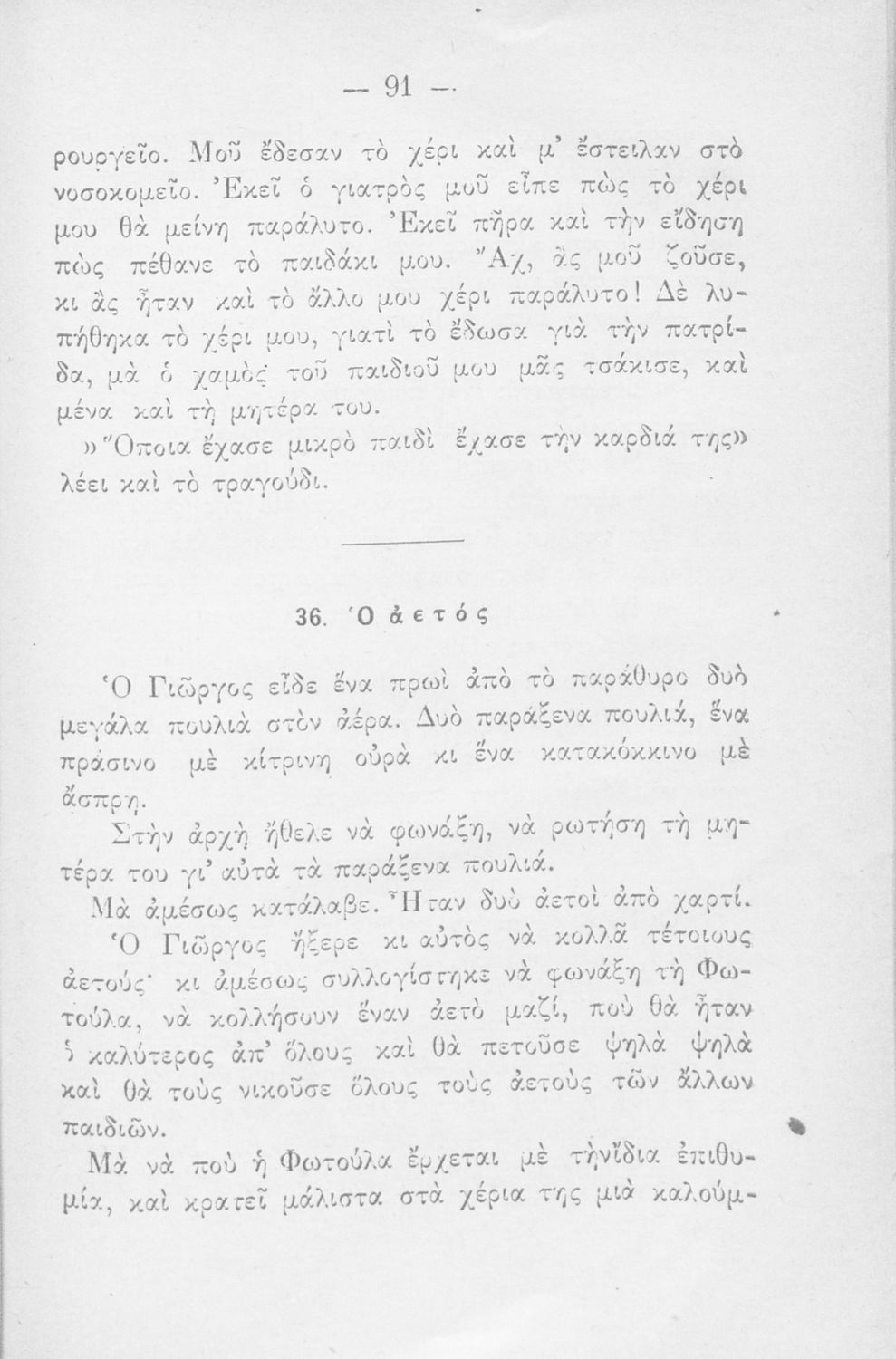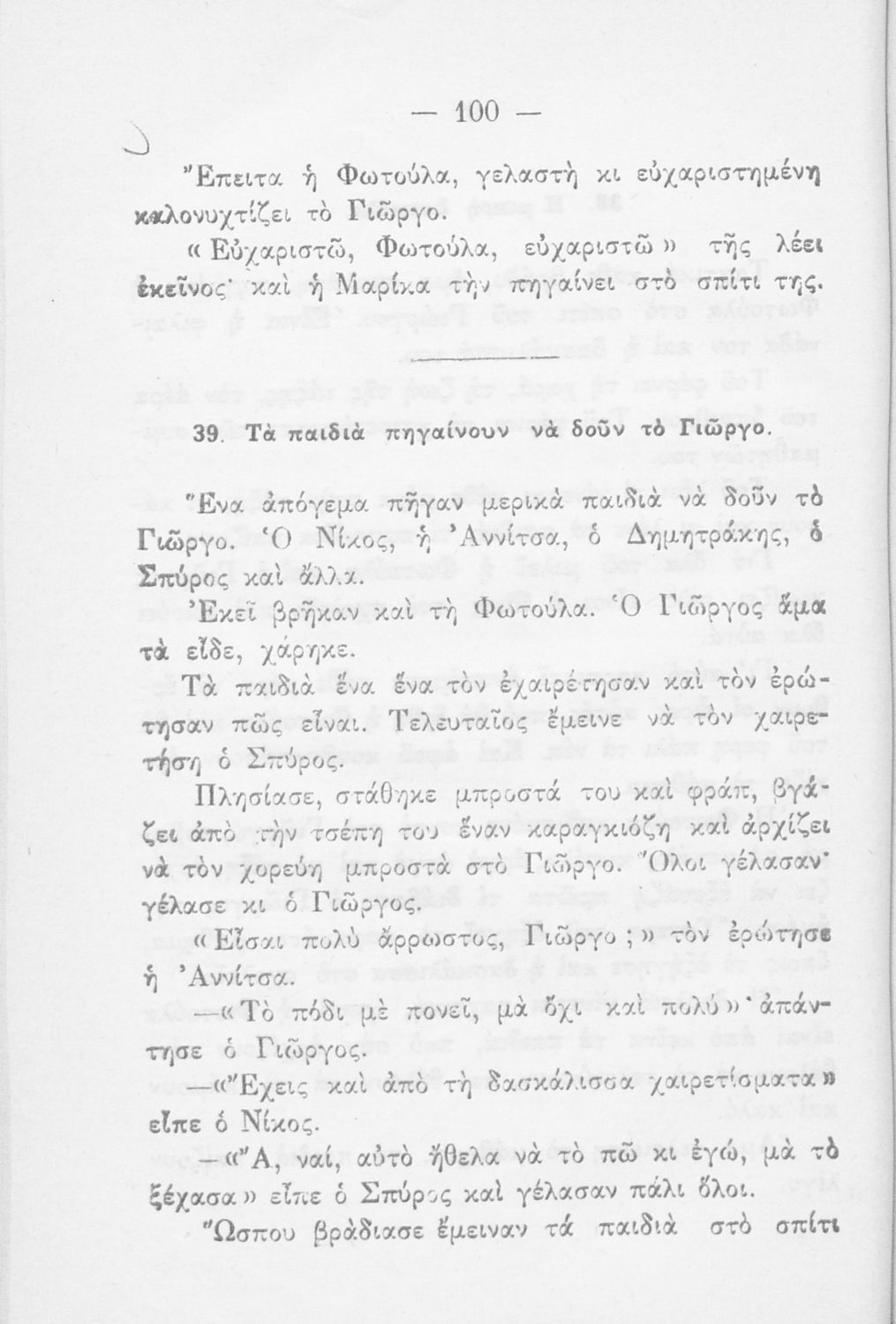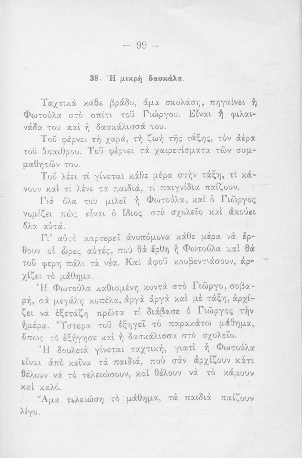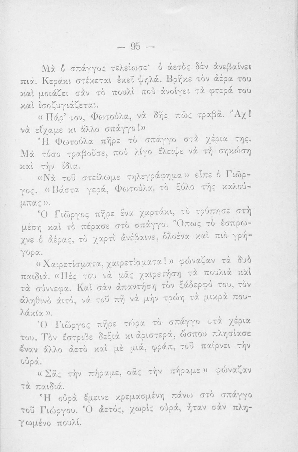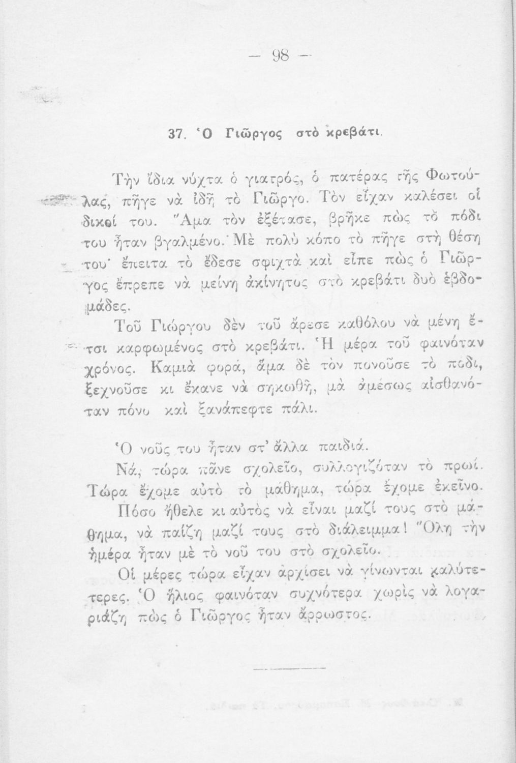 Αναγνωστικό Β΄ Δημοτικού που αποτελείται από πεζά γραμμένα σε καθαρεύουσα και ποιήματα σε δημοτική εμπνευσμένα από την οικογένεια, τη θρησκεία, την πατρίδα, την ελληνική φύση και ύπαιθρο, την αγάπη για τα ζώα,
