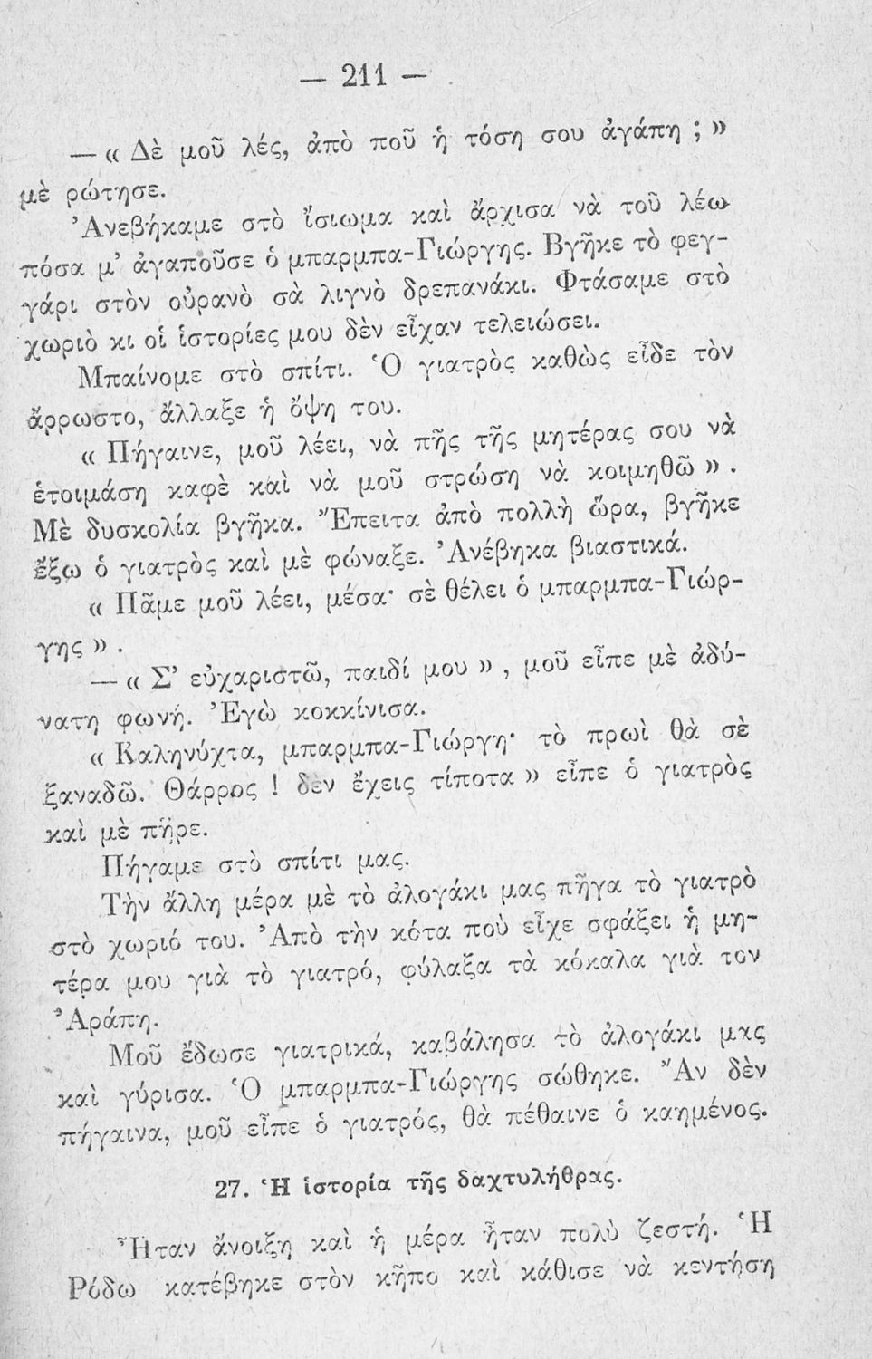 520 ## _aΑναγνωστικό Δ΄ Δημοτικού που περιλαμβάνει ποιήματα και πεζά εμπνευσμένα από την καθημερινότητα της ελληνικής ζωής, τη ζωή στην ύπαιθρο, την εθνική και κοινωνική ζωή, την αρχαία ελληνική ιστορία, και τα ζώα και τα φυτά.