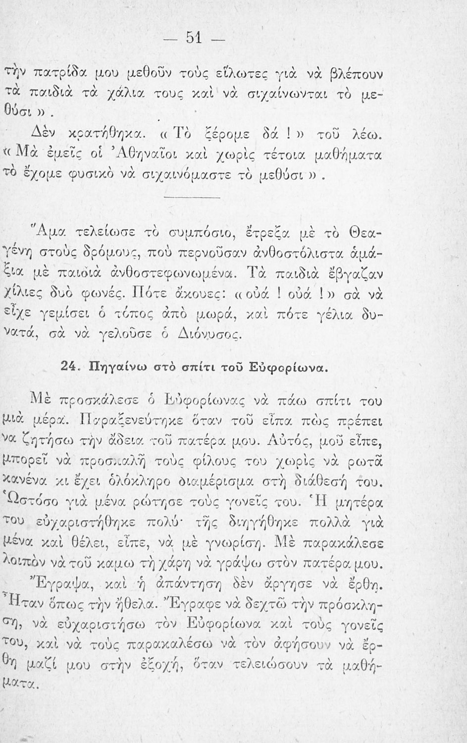 Αναγνωστικό Δ΄ Δημοτικού που περιλαμβάνει θέματα από την θρησκευτική, οικογενειακή και σχολική ζωή του παιδιού, την ελληνική μυθολογία και ιστορία και τη ζωή των ζώων.