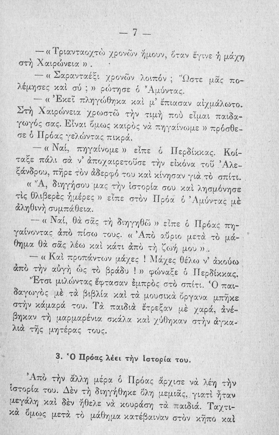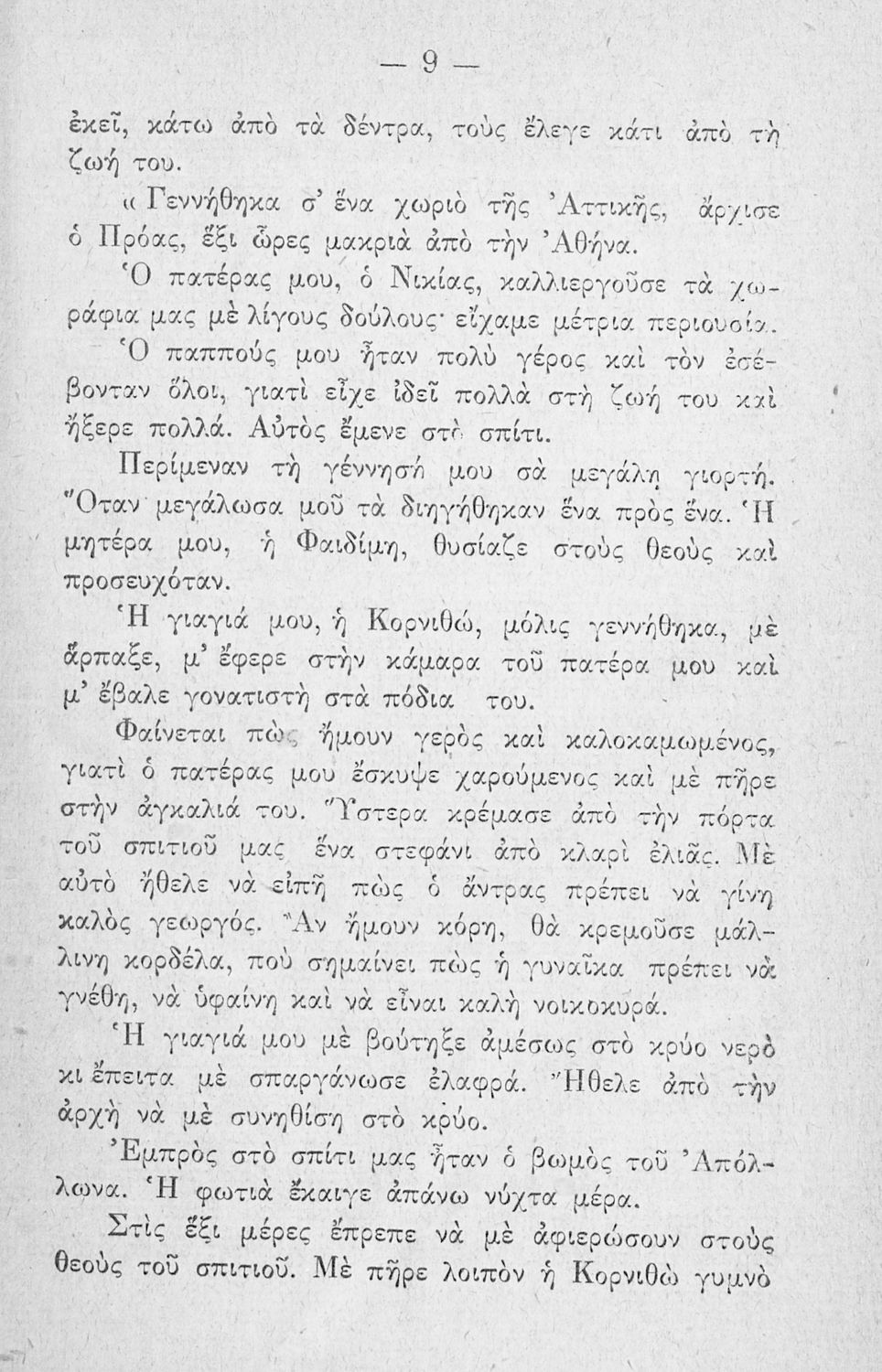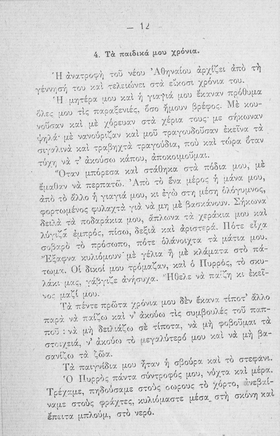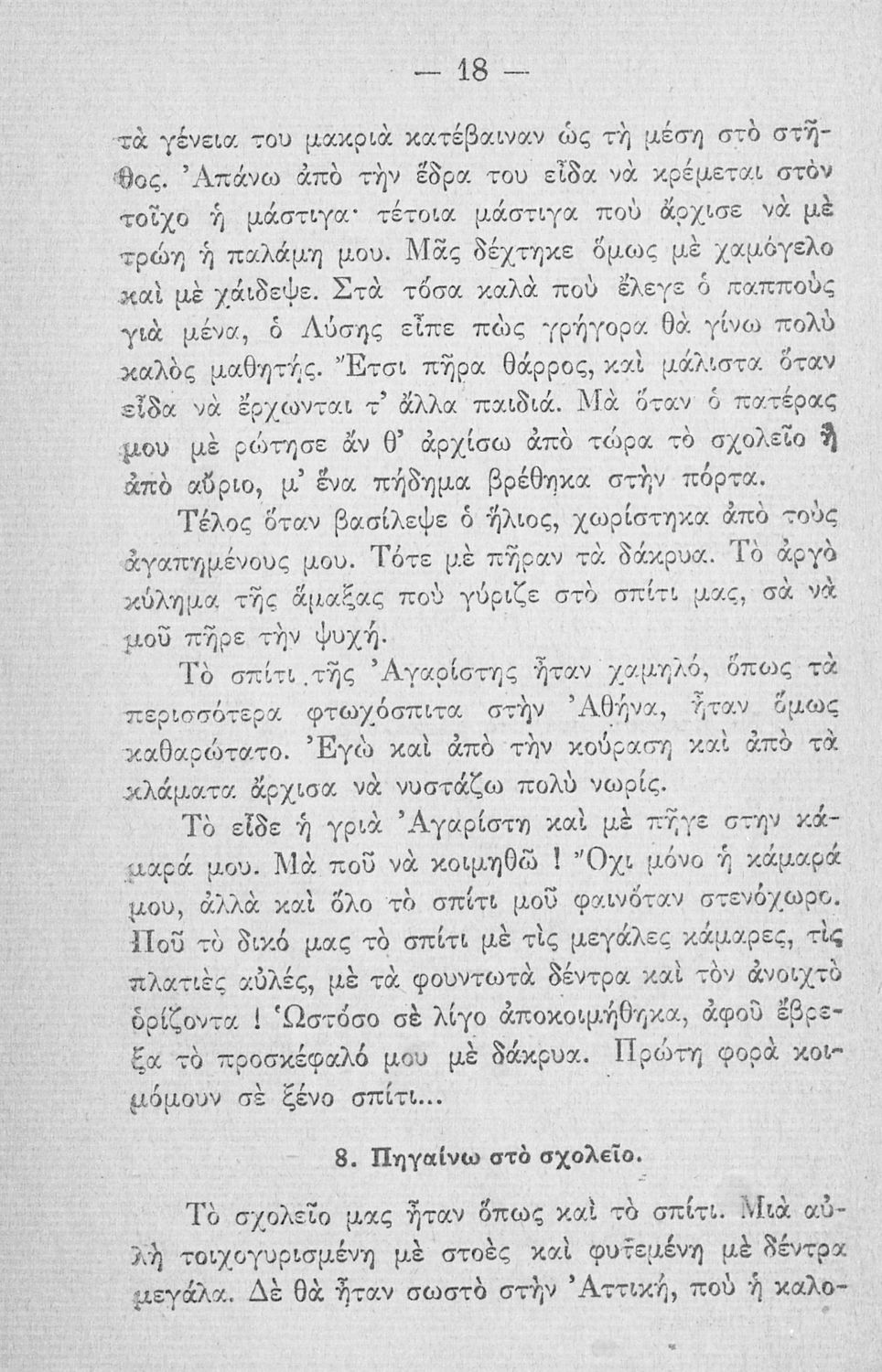 Αναγνωστικό Δ΄ Δημοτικού που περιέχει πεζά και ποιήματα με περιεχόμενο διδακτικό και ηθικοπλαστικό εμπνευσμένα από την ελληνική ιστορία και μυθολογία, και την αγροτική και κοινωνική ζωή.