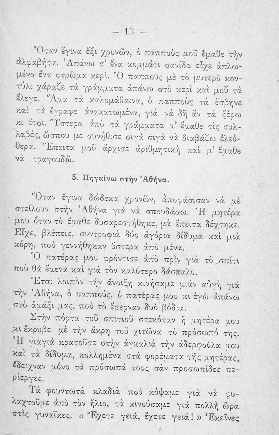 Αναγνωστικό Ε΄ Δημοτικού που περιέχει πεζά και ποιήματα εμπνευσμένα από τη θρησκευτική, εθνική, κοινωνική ζωή καθώς και από τις ασχολίες των Ελλήνων, την αρχαία και σύγχρονη ελληνική ιστορία και τον πολιτισμό.