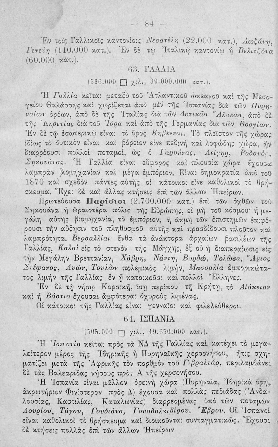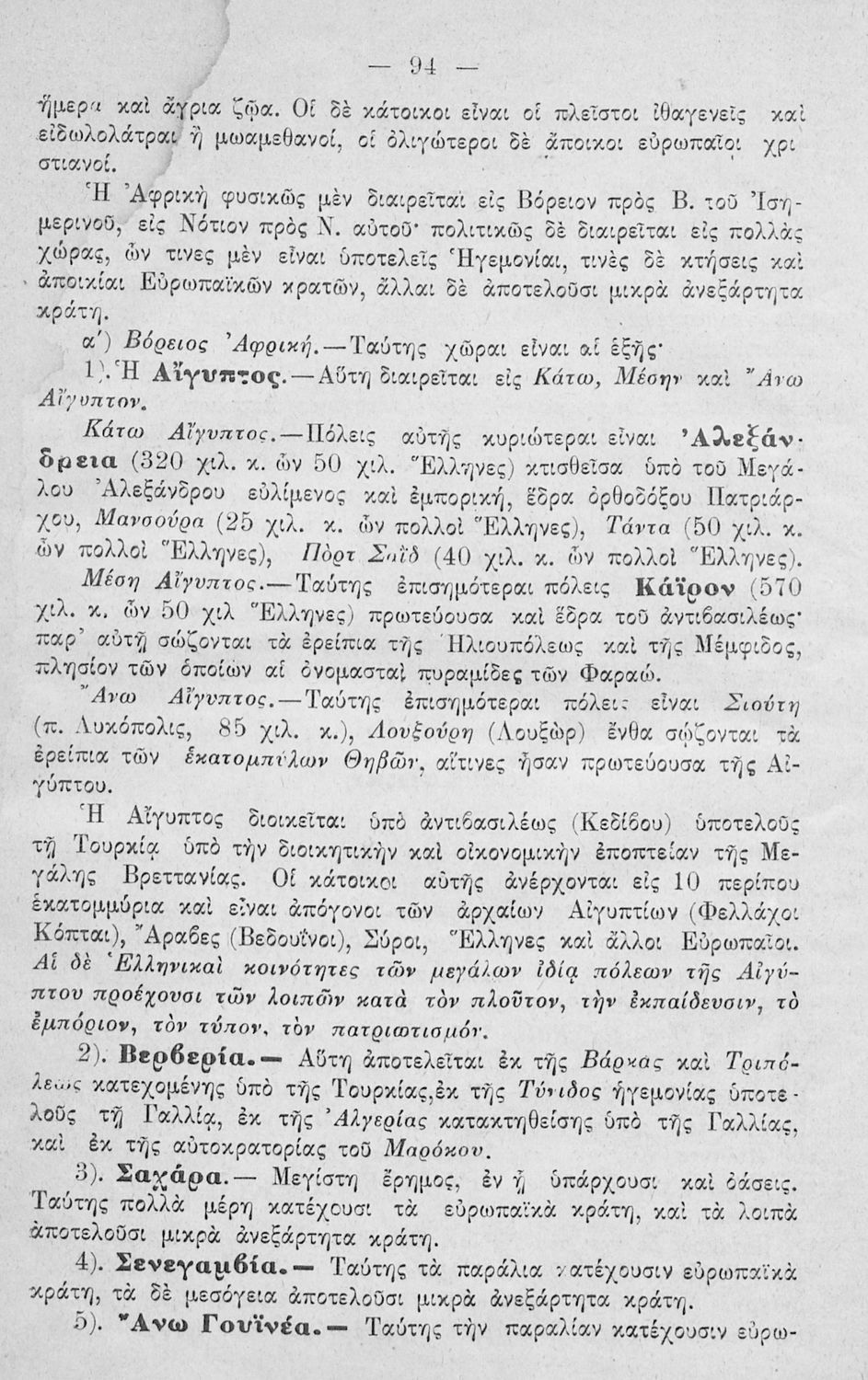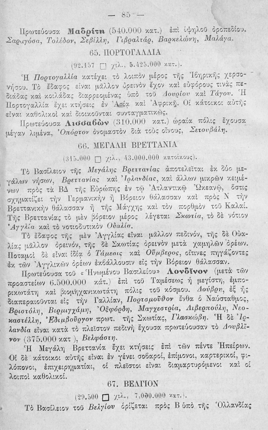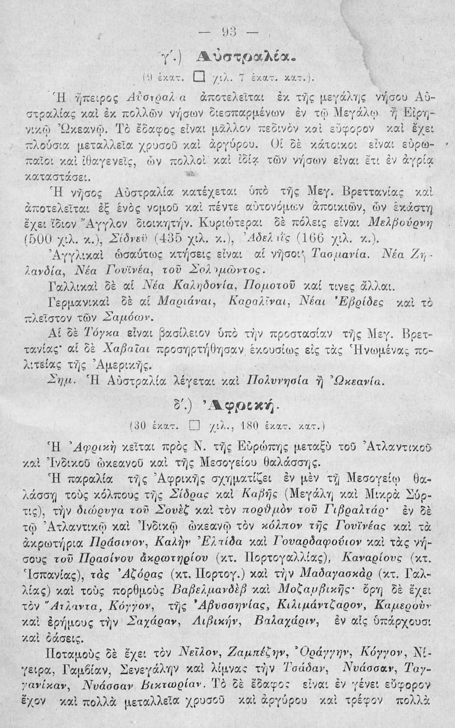 Βαθμίδα εκπαίδευσης: Πρωτοβάθμια Μάθημα: Γεωγραφία Γλώσσα: Καθαρεύουσα Παρουσίαση περιεχομένου: Σχολικό εγχειρίδιο Γεωγραφίας Δημοτικού που περιλαμβάνει εισαγωγή στη φυσική γεωγραφία της Γης, και εστιάζει στα γεωμορφολογικά, πληθυσμιακά και πολιτικά χαρακτηριστικά της Ελλάδας και χωρών της Ευρώπης. |