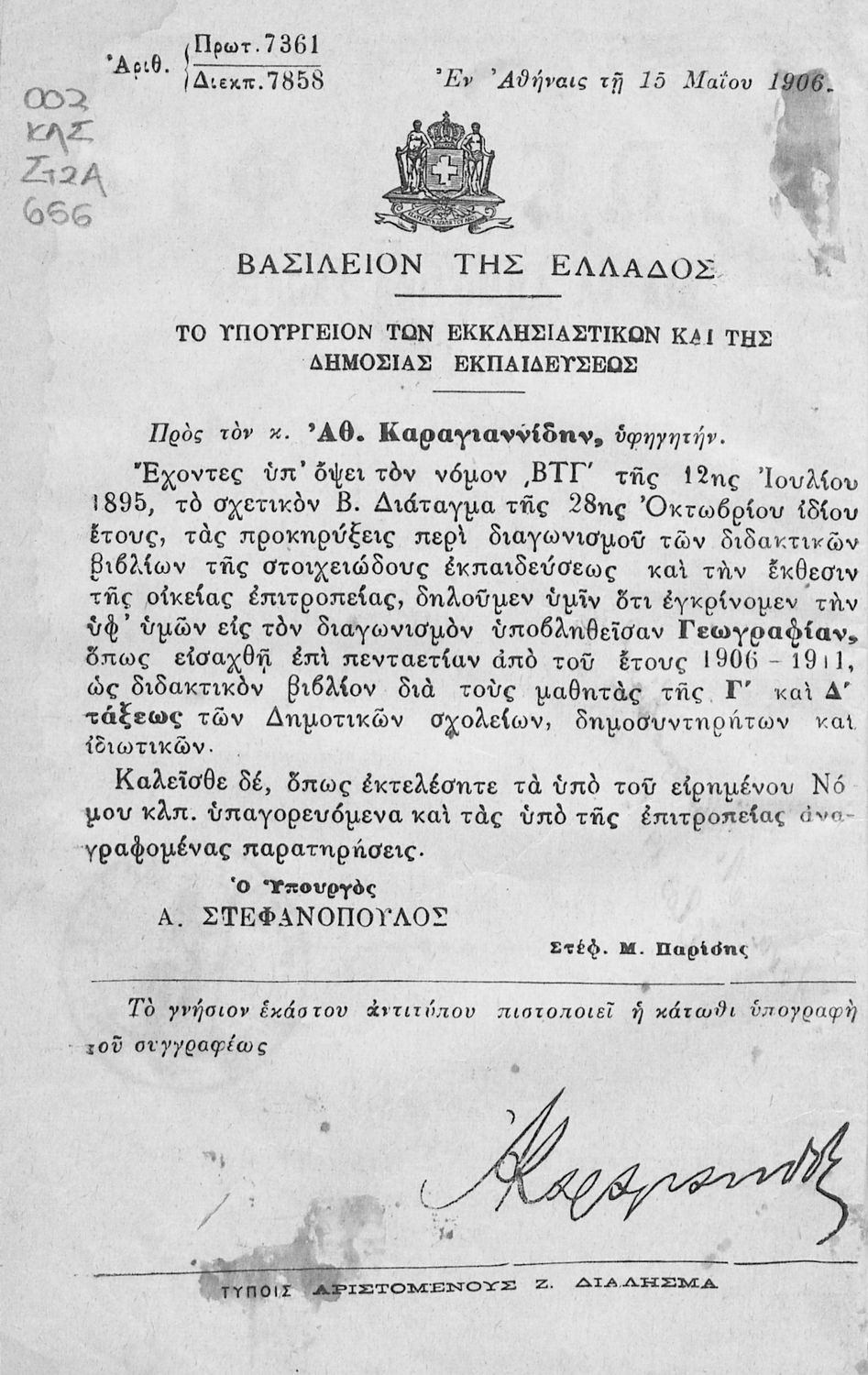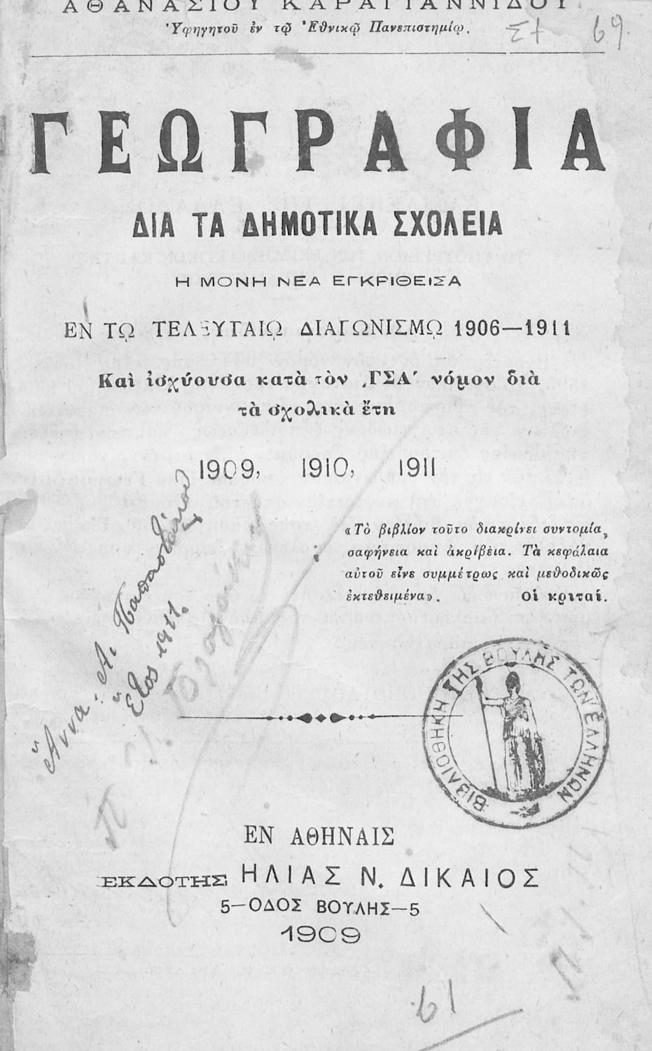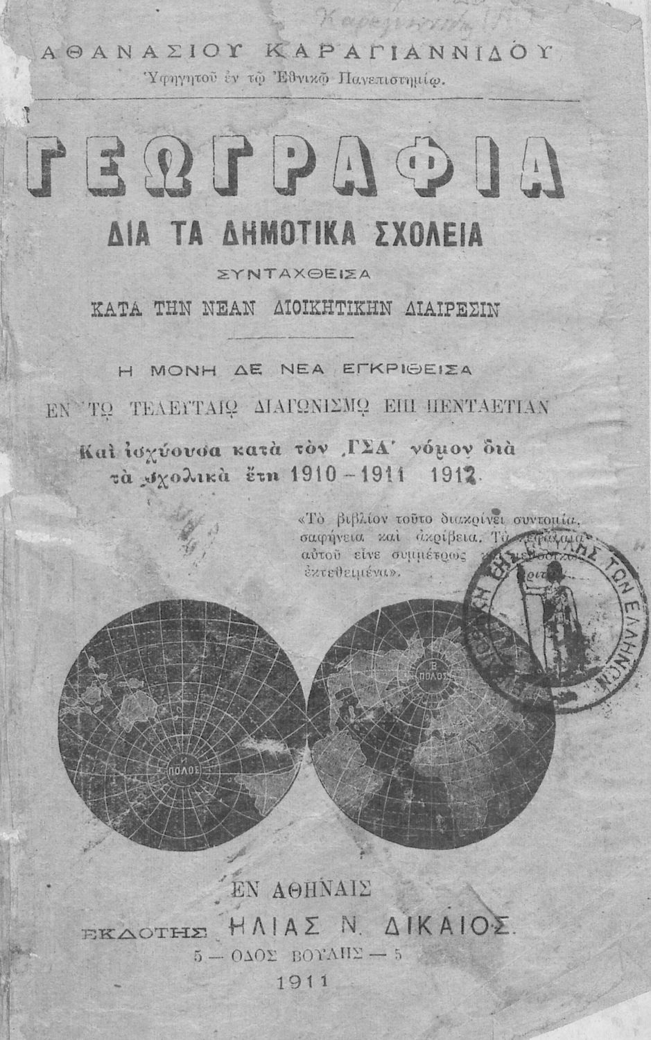 Εκδότης: Ηλίας Ν. Δίκαιος Έτος έκδοσης: 1911 Τόπος έκδοσης: Αθήνα Υπουργική απόφαση / Σύμβαση: 7361/15-5-1906 Έτος έγκρισης: 1906 |