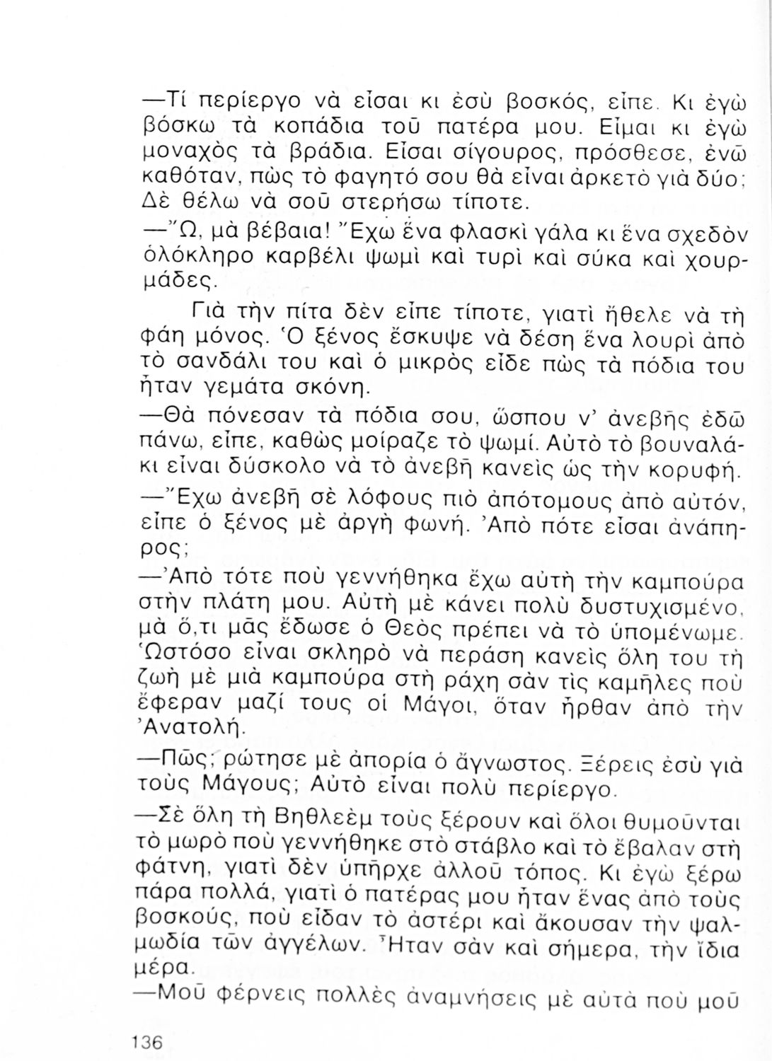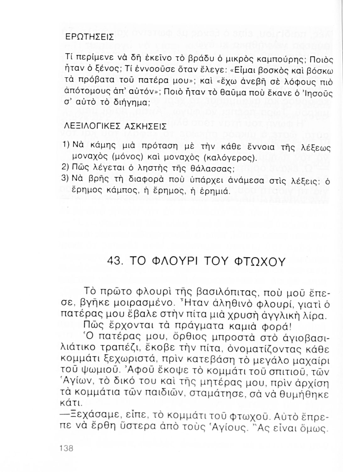 Αναγνωστικό Γ΄ Δημοτικού που περιλαμβάνει ποιήματα και πεζά με θέματα όπως η καλή και κακή συναναστροφή, η φρόνηση, η οκνηρία, η φιλανθρωπία και η πίστη στο Θεό