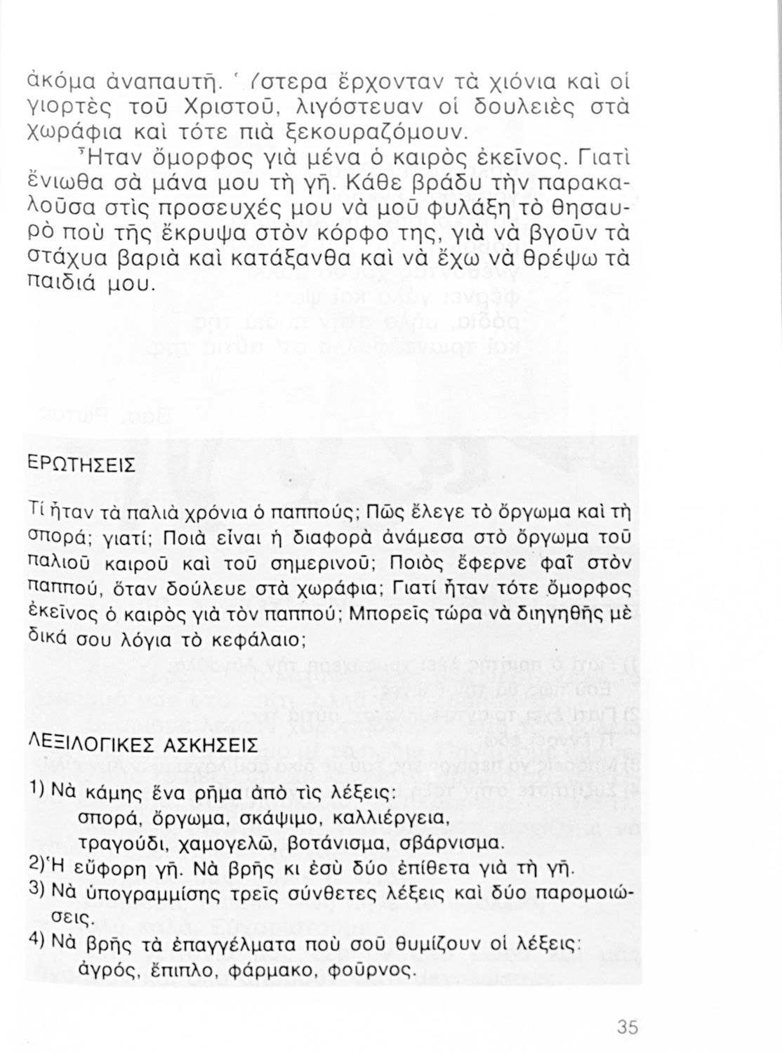 Αναγνωστικό της Γ΄ Δημοτικού που περιέχει πεζά και ποιήματα εμπνευσμένα από την κοινωνική και οικογενειακή ζωή του τόπου. Περιλαμβάνει ερωτήσεις κατανόησης και λεξιλογικές ασκήσεις.