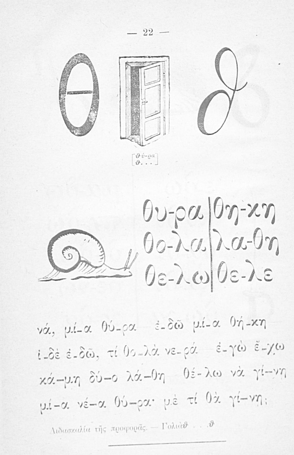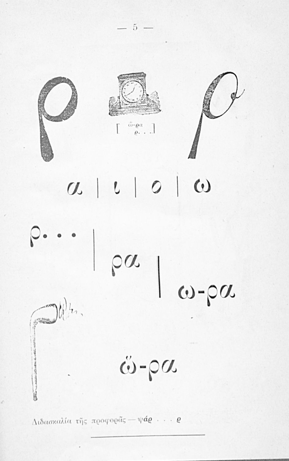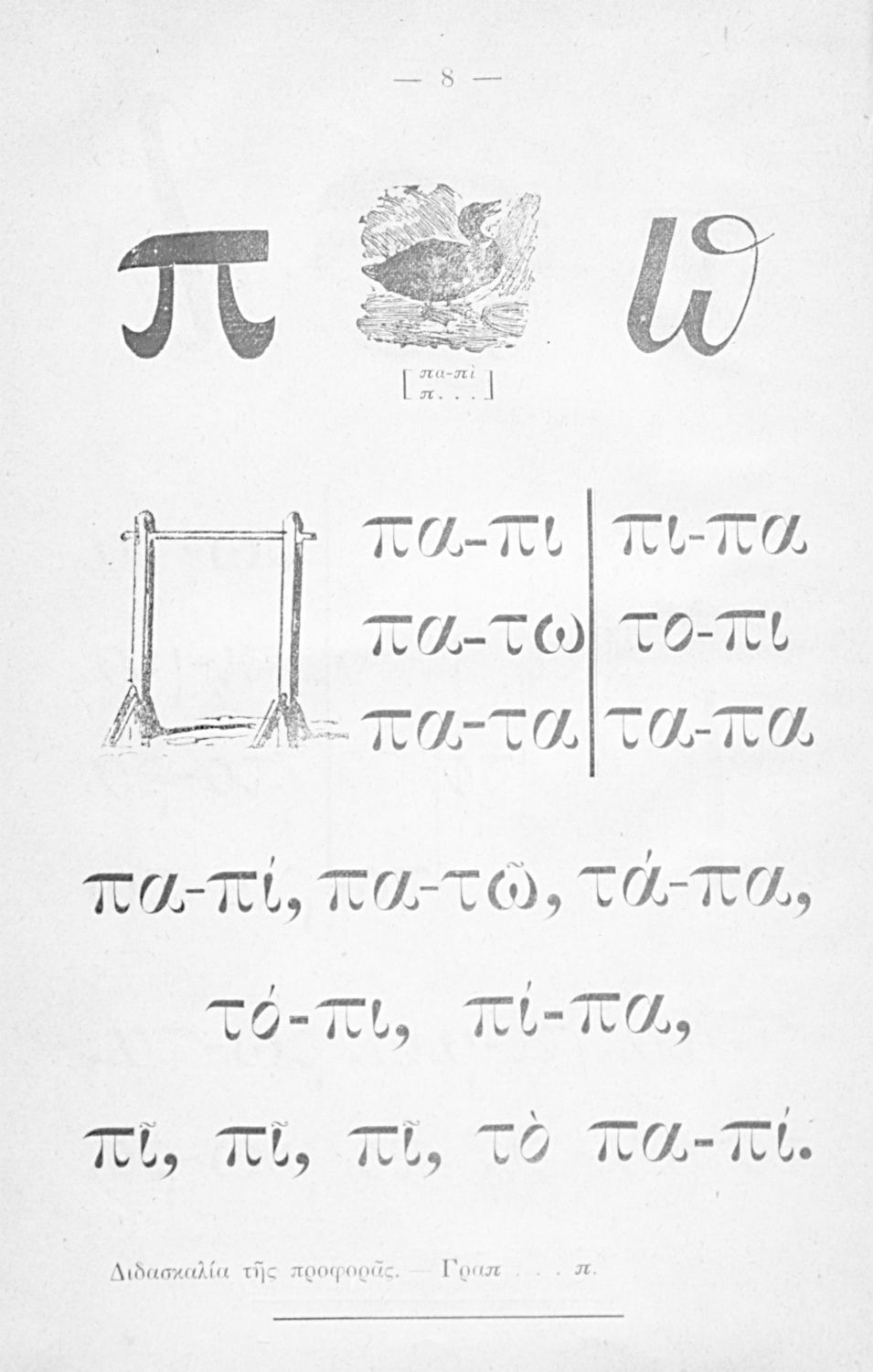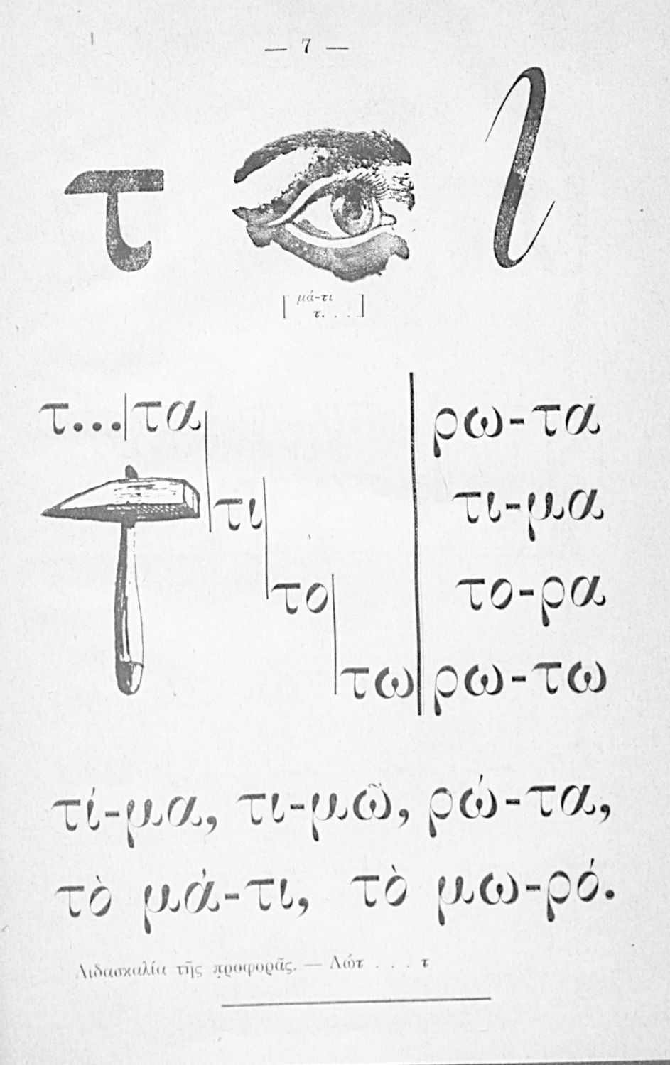 Βαθμίδα εκπαίδευσης: Πρωτοβάθμια Τάξη: Α' Δημοτικού Μάθημα: Νέα Ελληνικά Γλώσσα: Δημοτική Παρουσίαση περιεχομένου: Αναγνωστικό [Α΄ ] Δημοτικού που περιέχει τα γράμματα, συλλαβές και λέξεις καθώς και ασκήσεις συλλαβισμού. Ο συγγραφέας ήταν δημοδιδάσκαλος και υπάλληλος στο Ελληνικό Προξενείο στο Μοναστήρι (Μπίτολα). |