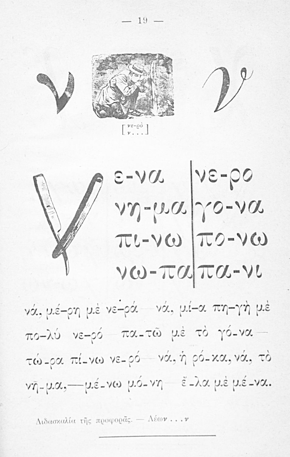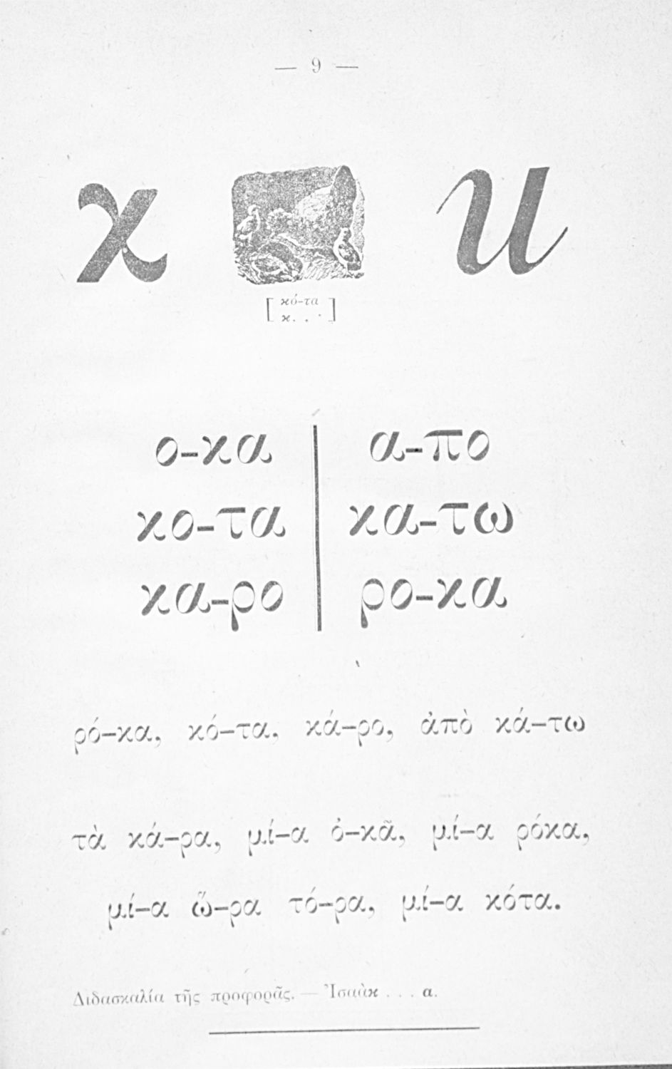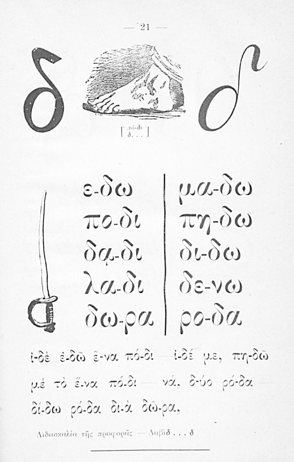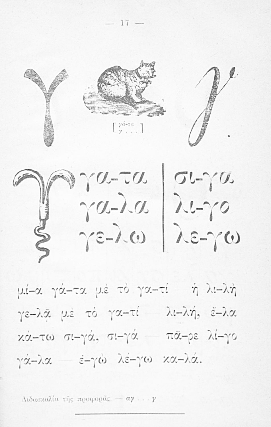 Βαθμίδα εκπαίδευσης: Πρωτοβάθμια Τάξη: Α' Δημοτικού Μάθημα: Νέα Ελληνικά Γλώσσα: Δημοτική Παρουσίαση περιεχομένου: Αναγνωστικό [Α΄ ] Δημοτικού που περιέχει τα γράμματα, συλλαβές και λέξεις καθώς και ασκήσεις συλλαβισμού. Ο συγγραφέας ήταν δημοδιδάσκαλος και υπάλληλος στο Ελληνικό Προξενείο στο Μοναστήρι (Μπίτολα). |