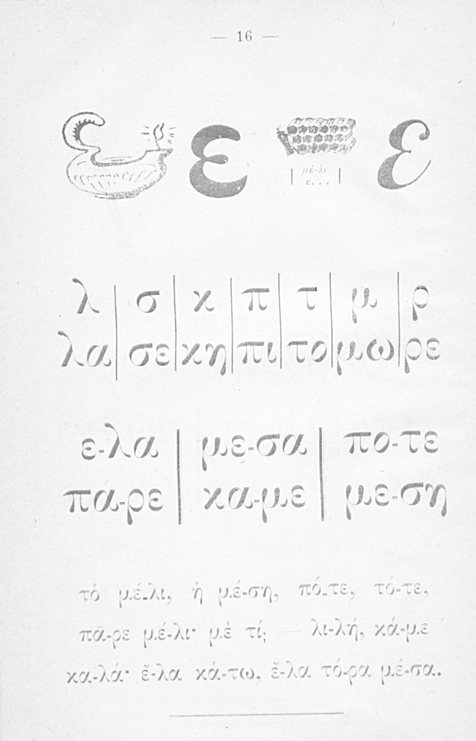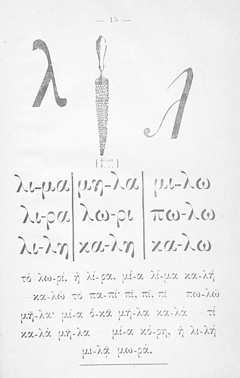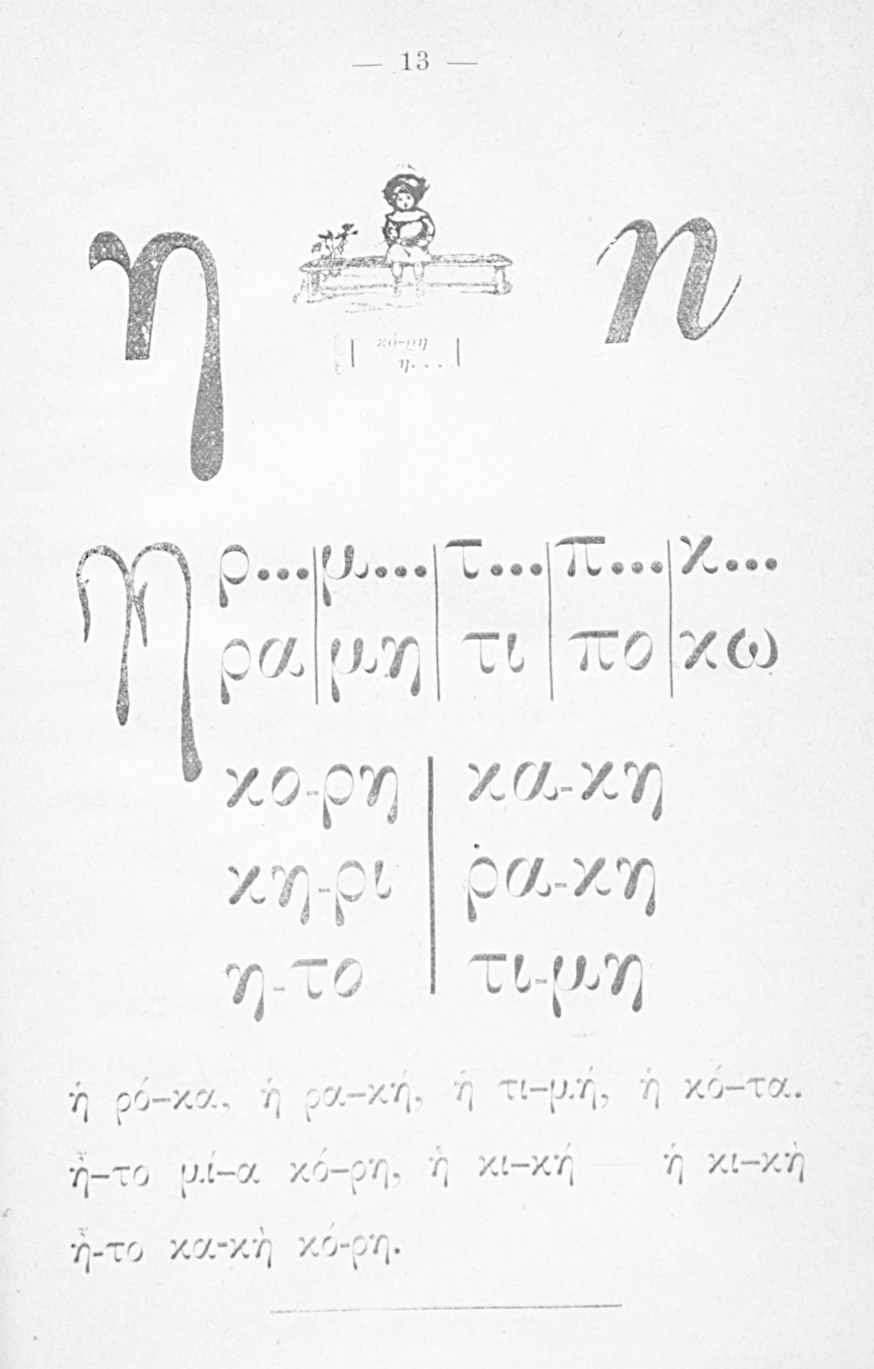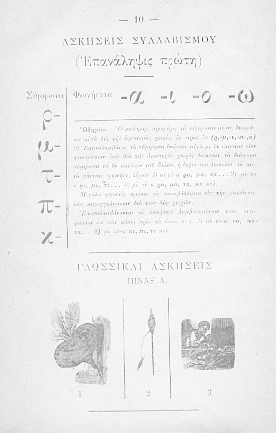 Βαθμίδα εκπαίδευσης: Πρωτοβάθμια Τάξη: Α' Δημοτικού Μάθημα: Νέα Ελληνικά Γλώσσα: Δημοτική Παρουσίαση περιεχομένου: Αναγνωστικό [Α΄ ] Δημοτικού που περιέχει τα γράμματα, συλλαβές και λέξεις καθώς και ασκήσεις συλλαβισμού. Ο συγγραφέας ήταν δημοδιδάσκαλος και υπάλληλος στο Ελληνικό Προξενείο στο Μοναστήρι (Μπίτολα). |