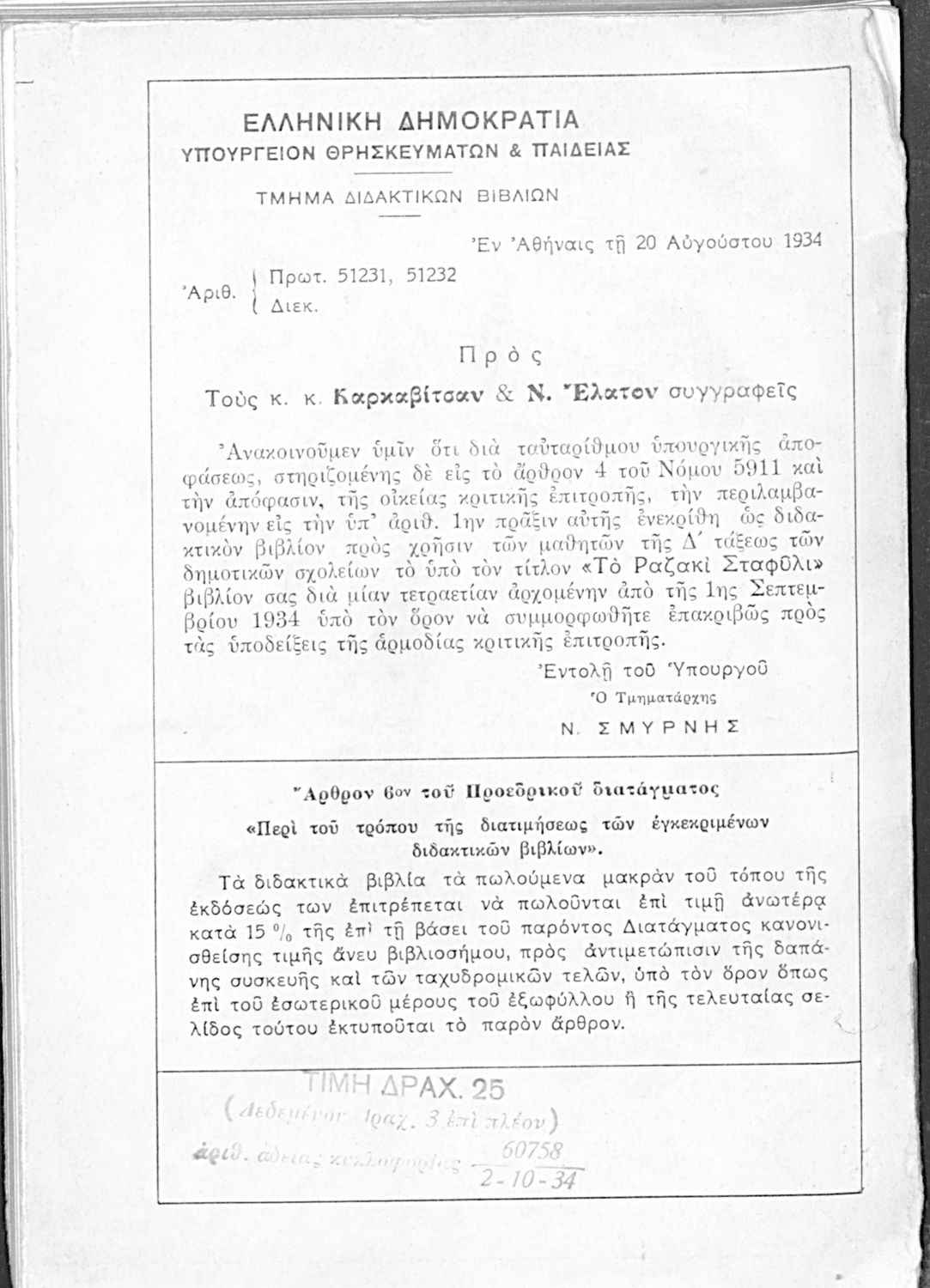 Υπουργική απόφαση / Σύμβαση: 51231/51232/20-8-1934