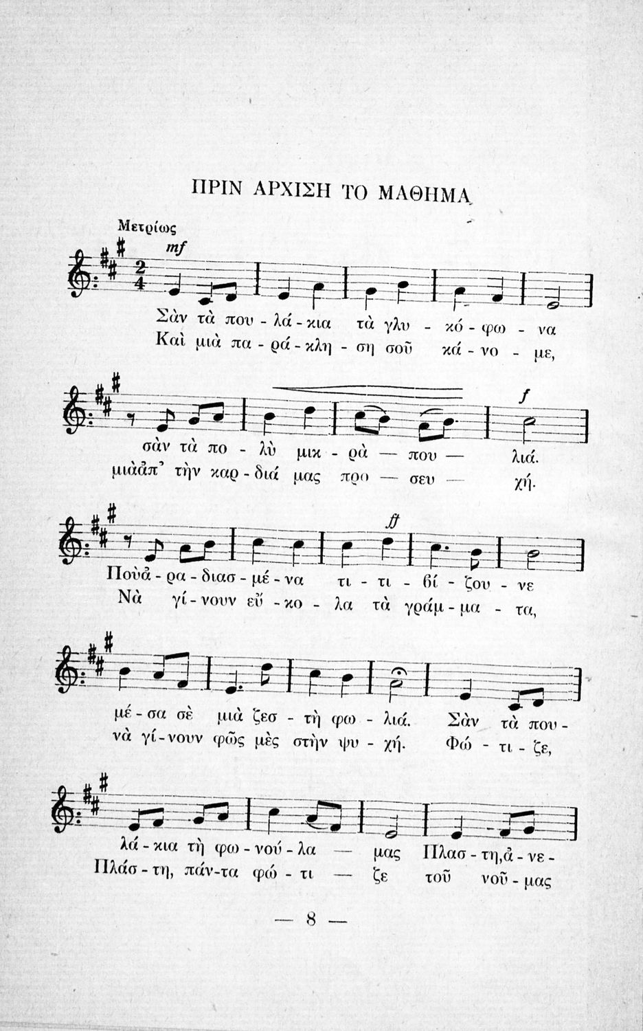 Βαθμίδα εκπαίδευσης: Πρωτοβάθμια Μάθημα: Νέα Ελληνικά Γλώσσα: Δημοτική Παρουσίαση περιεχομένου: Παιδαγωγικό βοήθημα που απευθύνεται στους εκπαιδευτικούς της Πρωτοβάθμιας Εκπαίδευσης και περιέχει τραγούδια, προσευχές, παιγνίδια και οδηγίες χρήσης τους. |
