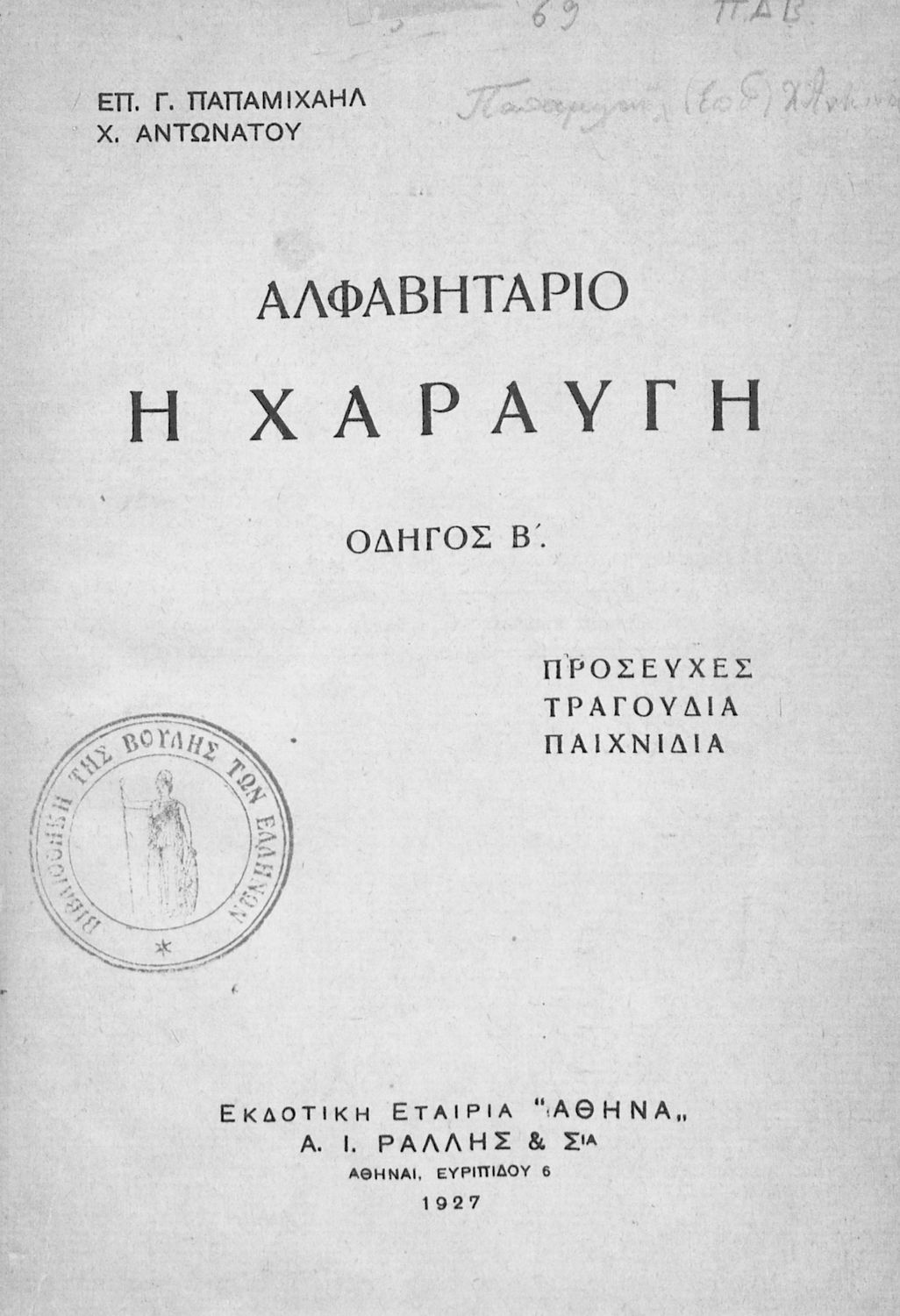 Εκδότης: Α.Ι. Ράλλης Έτος έκδοσης: 1927 Τόπος έκδοσης: Αθήνα |