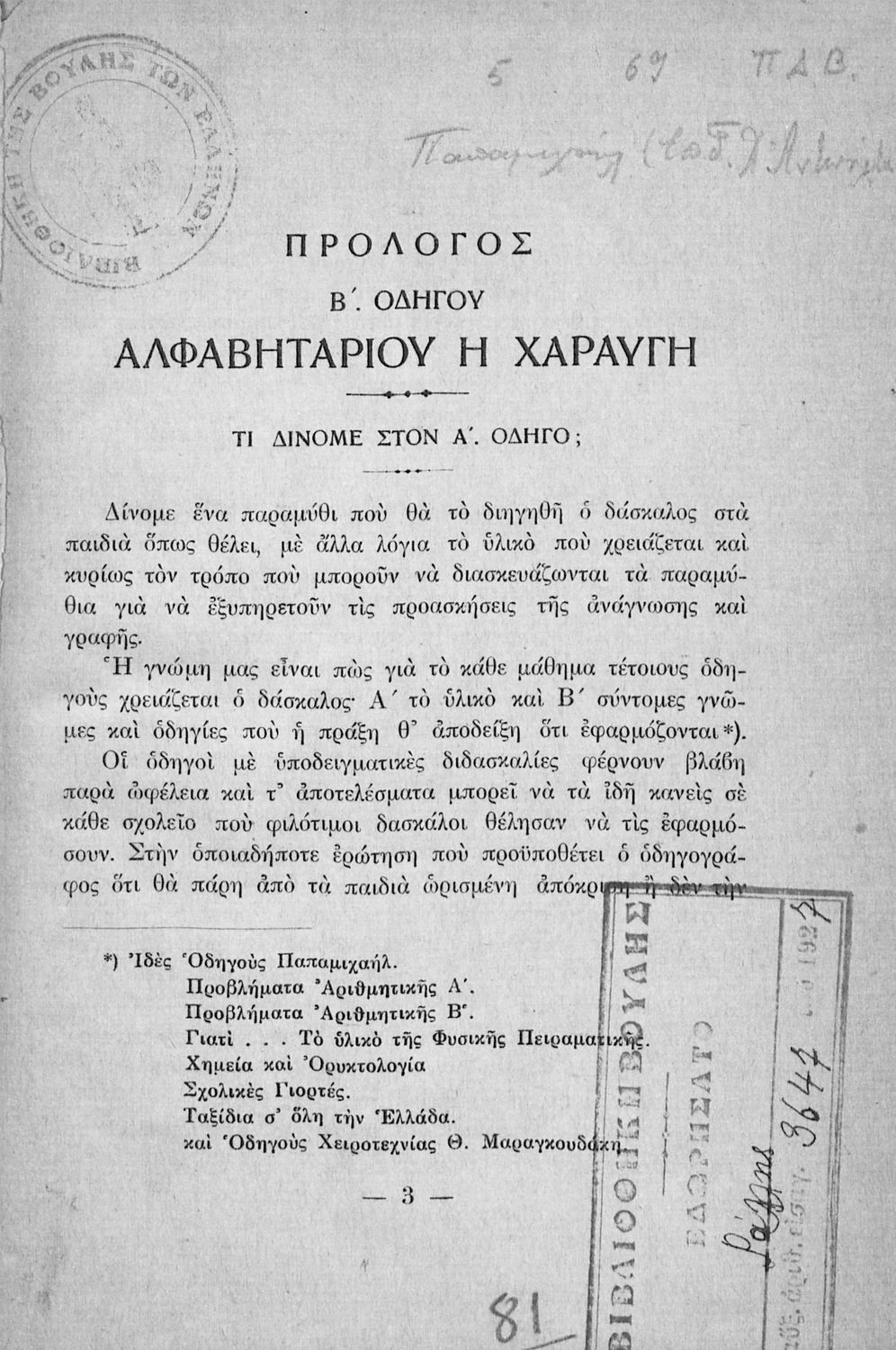 Κωδικός αναγνώρισης: 03-20563891 Τίτλος: Αλφαβητάριο Η Χαραυγή Οδηγός β΄ Συγγραφέας: Επ. Γ. Παπαμιχαήλ, Χ. Αντωνάτος Μέγεθος και υπόστρωμα: Παιδαγωγικό βοήθημα, 24 σελίδες. |