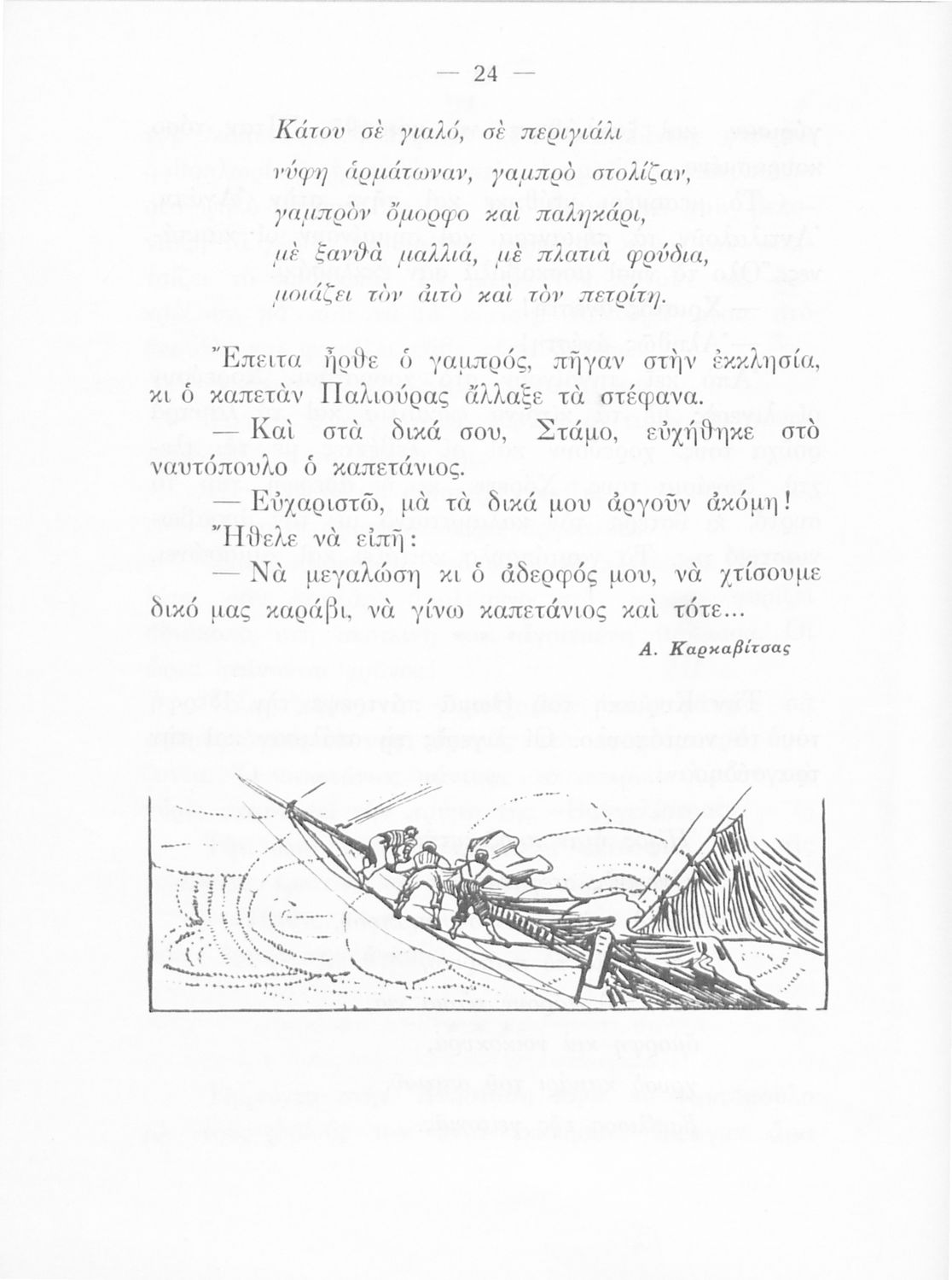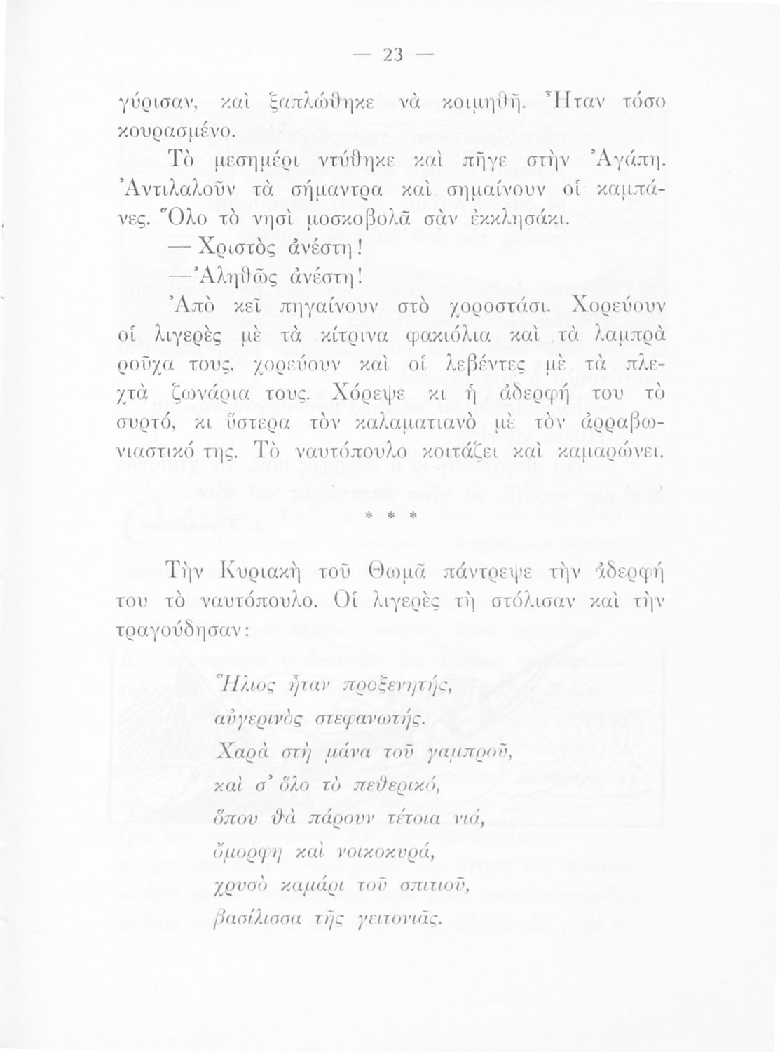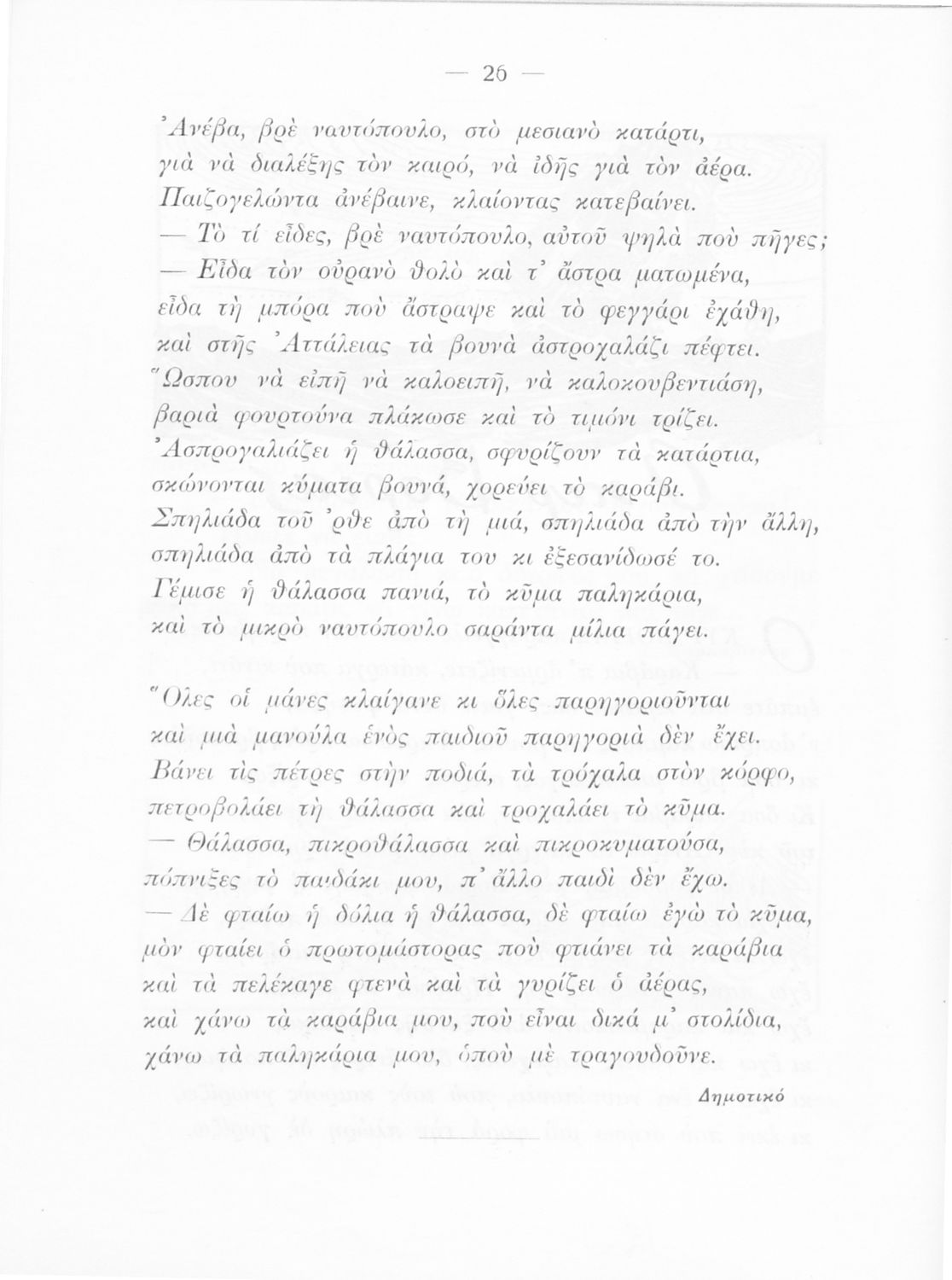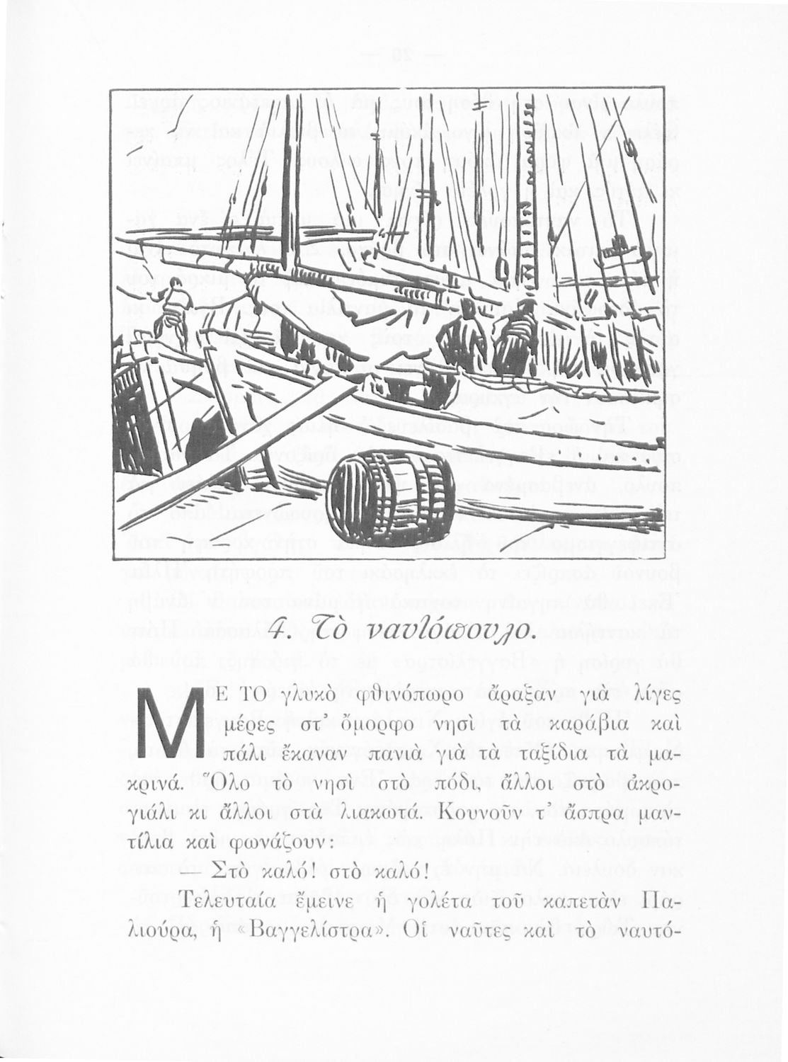 Αναγνωστικό για την Δ΄ τάξη του Δημοτικού. Περιλαμβάνει ένα κείμενο στο οποίο παρεμβάλλονται ποιήματα δημοτικά και Ελλήνων ποιητών.