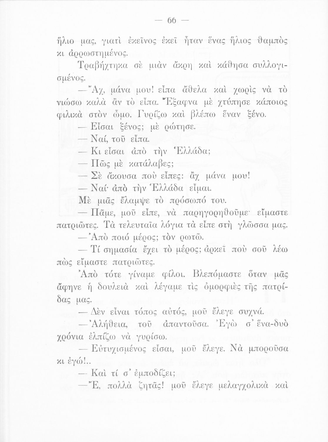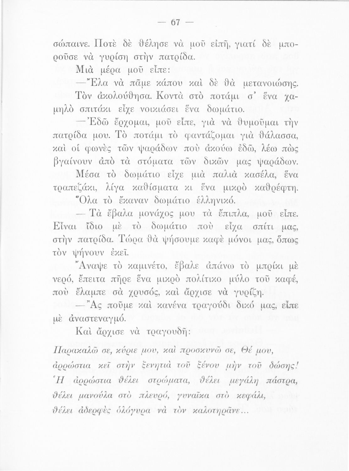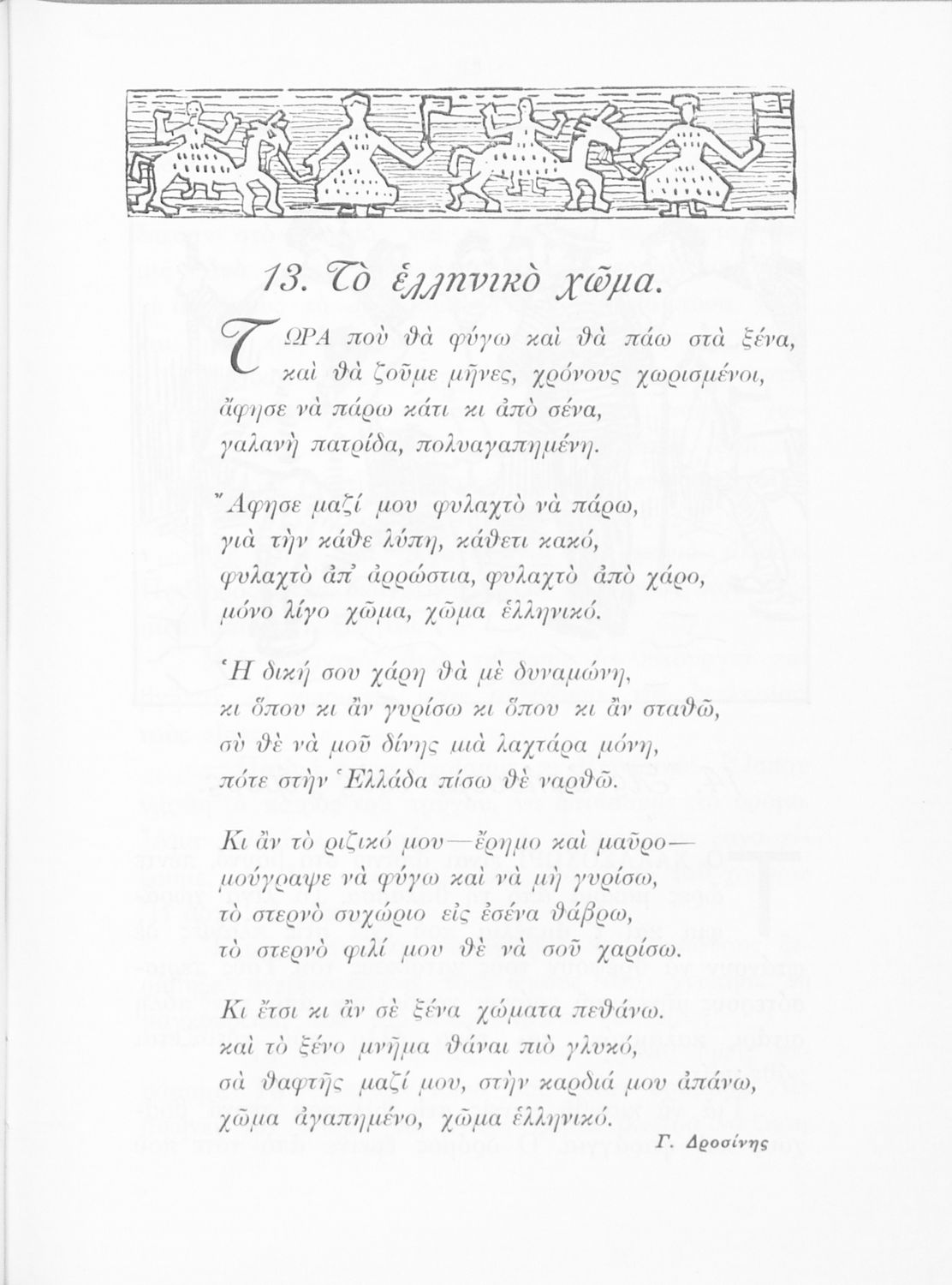 Αναγνωστικό για την Δ΄ τάξη του Δημοτικού. Περιλαμβάνει ένα κείμενο στο οποίο παρεμβάλλονται ποιήματα δημοτικά και Ελλήνων ποιητών.