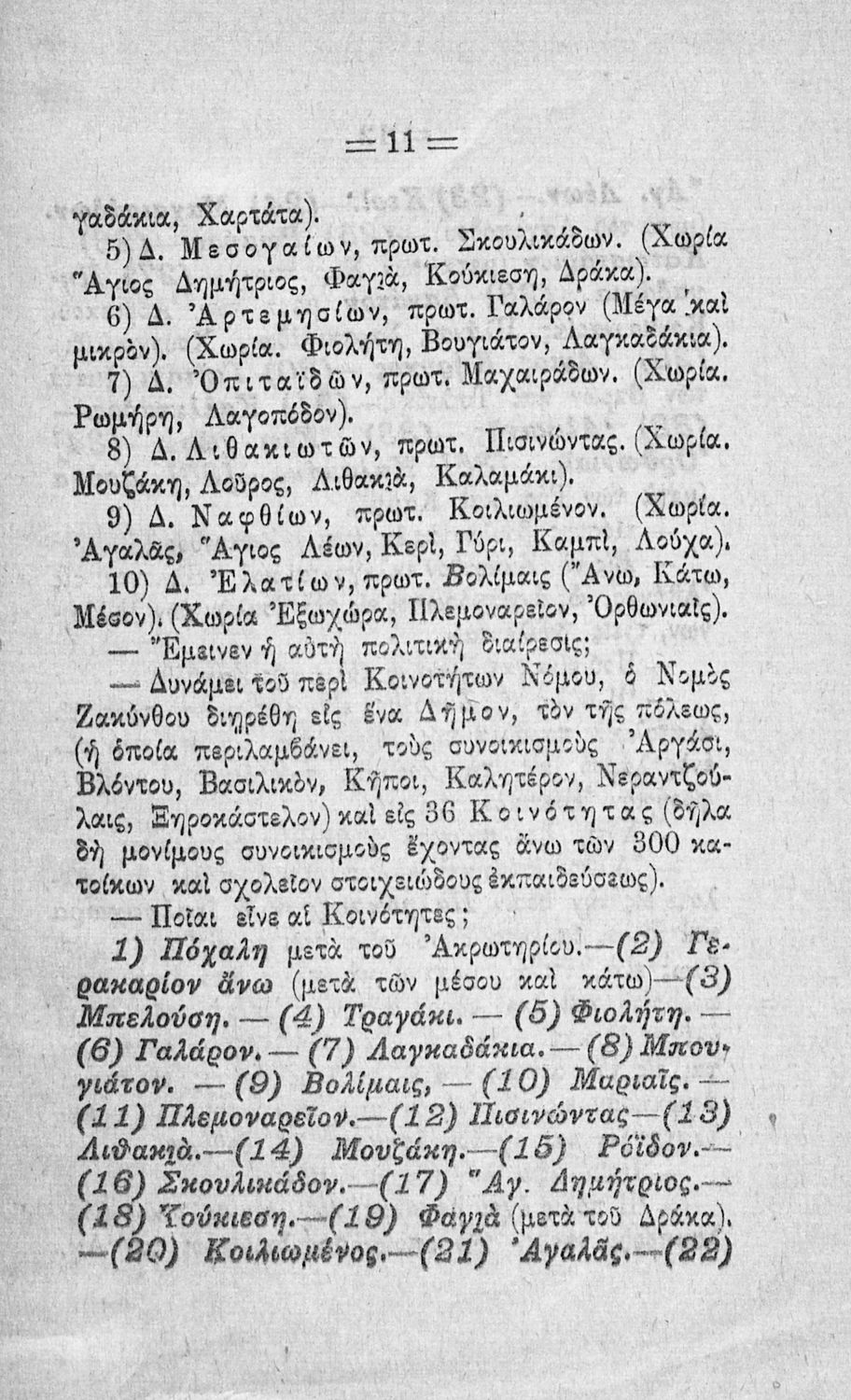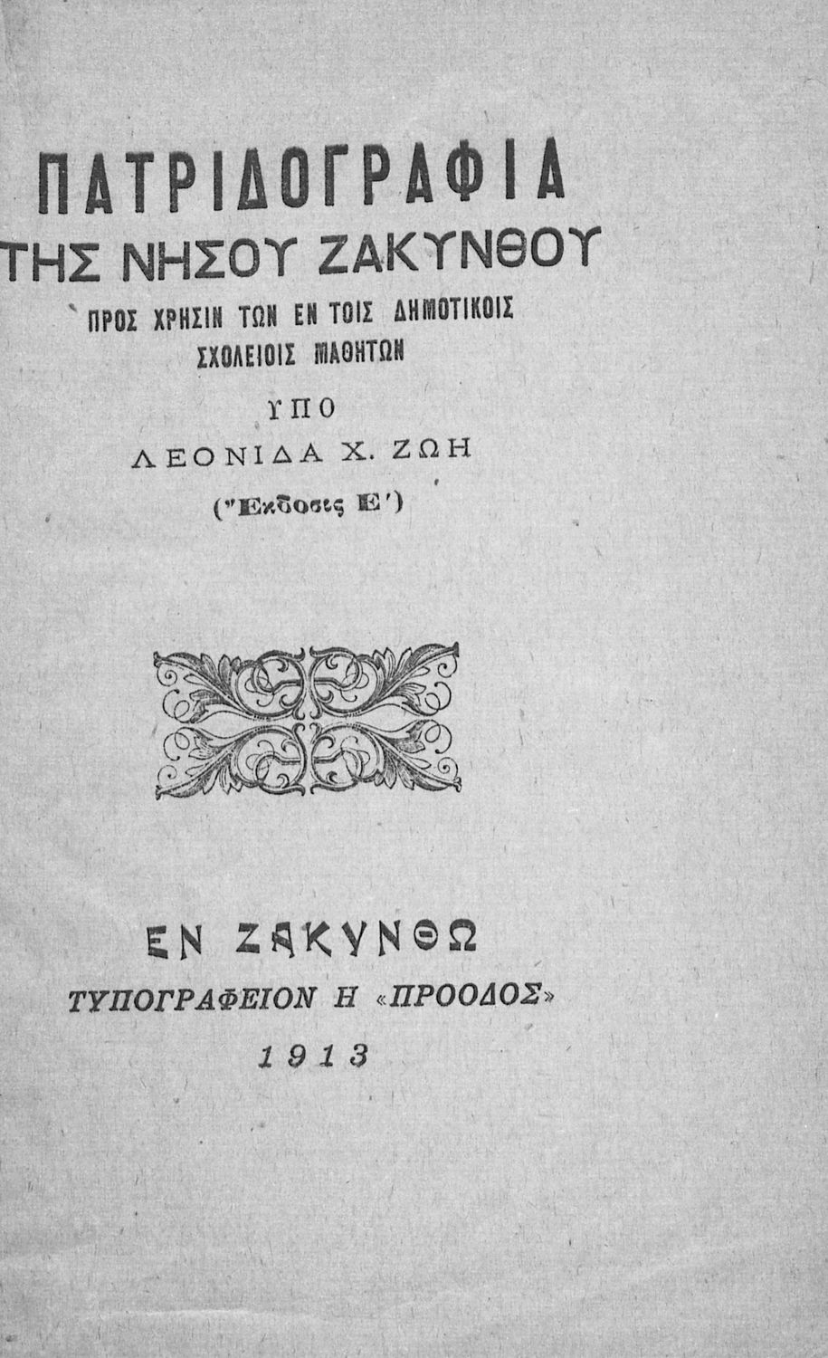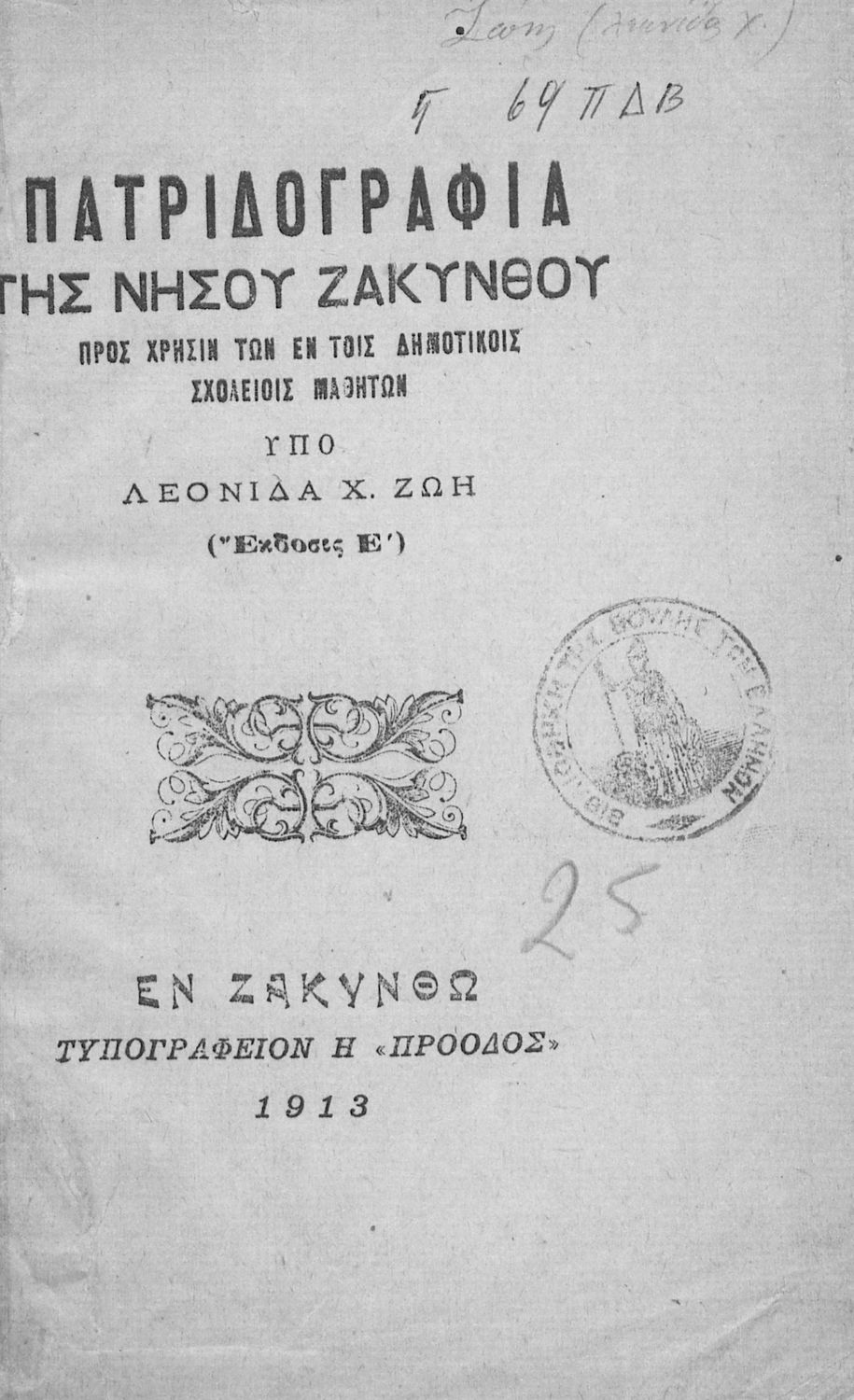 Κωδικός αναγνώρισης: 03-20563897 Τίτλος: Πατριδογνωσία της νήσου Ζακύνθου προς χρήσιν των εν τοις Δημοτικοίς Σχολείοις μαθητών Συγγραφέας: Λεωνίδας Χ. Ζώης Μέγεθος και υπόστρωμα: Σχολικό εγχειρίδιο, 14 σελίδες. |