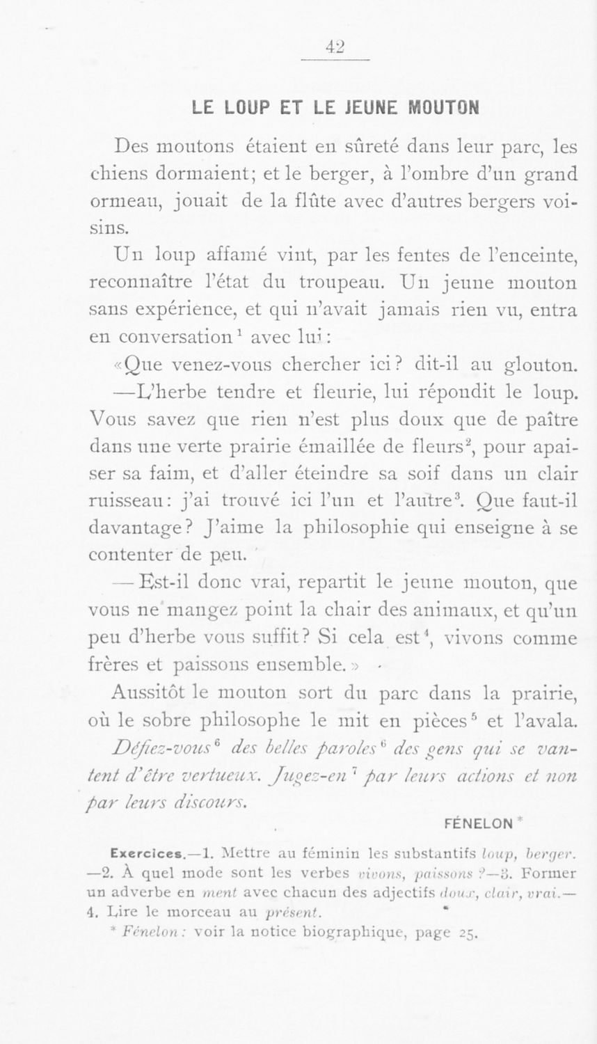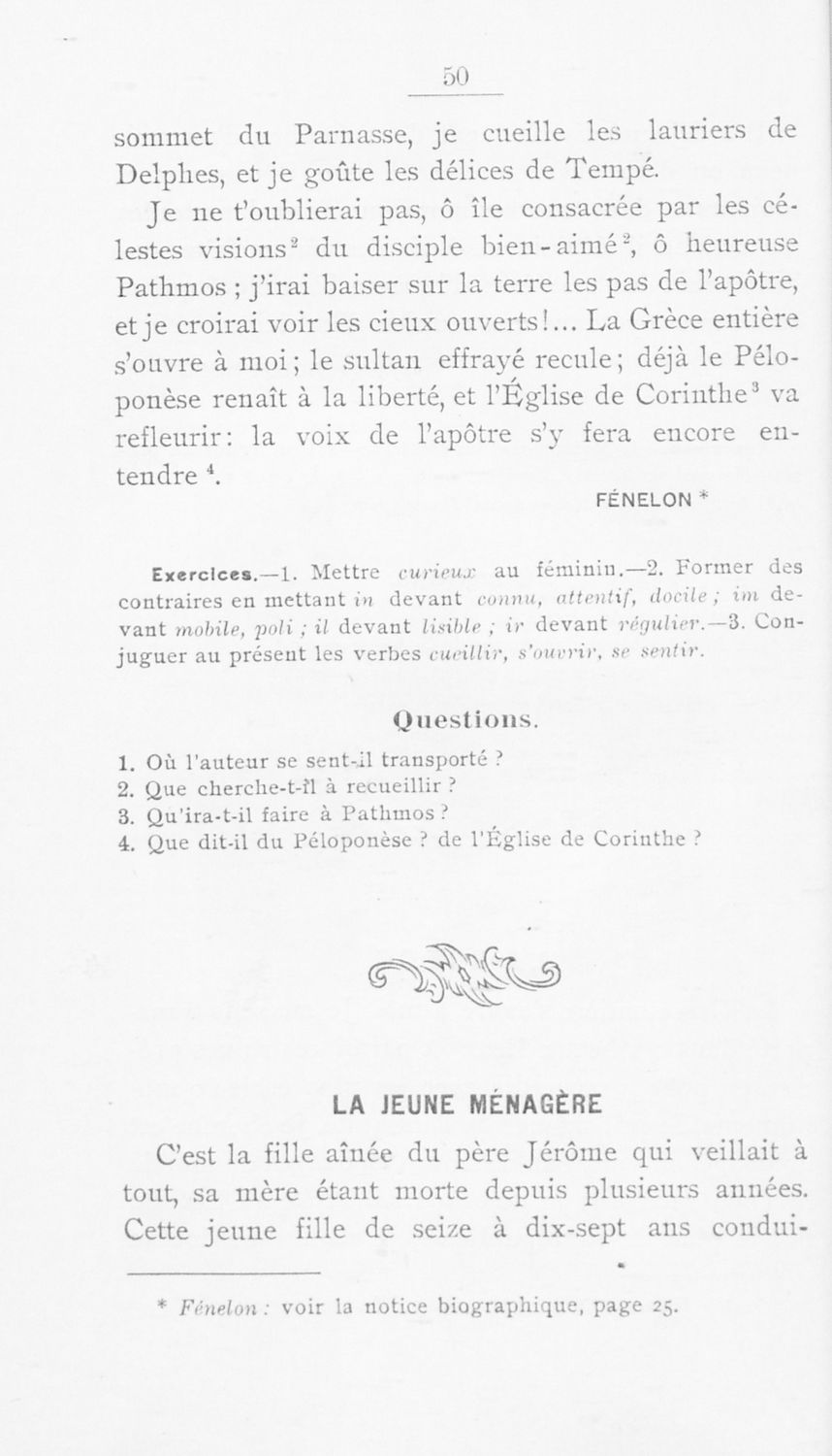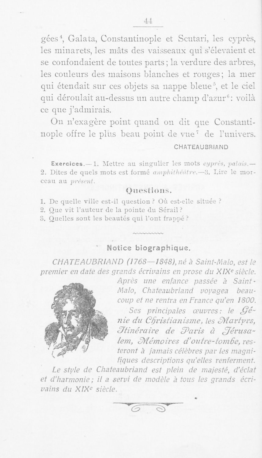 Σχολικό εγχειρίδιο Γαλλικών για τις Γ΄ Γυμνάσιου, Β΄ Διδασκαλείου Θηλέων και Α' Διδασκαλείου Αρρένων που περιέχει αποσπάσματα έργων Γάλλων συγγραφέων, και γλωσσικά και ερμηνευτικά σχόλια.