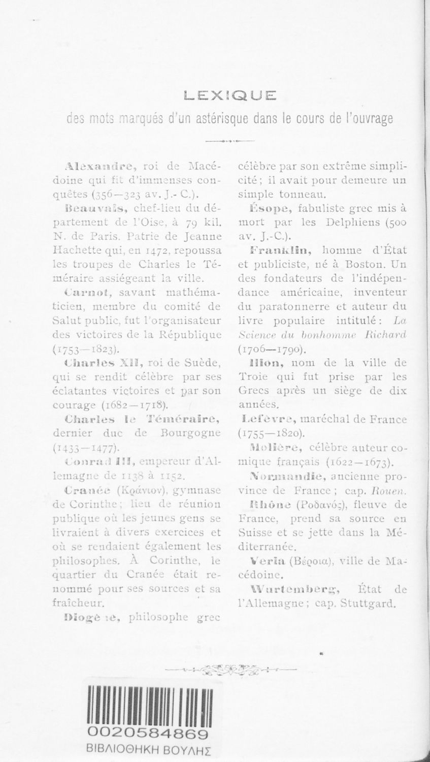 LDR 01295 2200193 4500 035 ## _a03-20584869 040 ## _aΒιβλιοθήκη της Βουλής των Ελλήνων 041 ## _ael 100 ## _aΘεοδ. Γ. Κύπριος 110 ## _a20584869 245 0# _aΓαλλική Χρηστομάθεια τόμος Α΄, δια την Α΄ Γυμνασίου και δια την Β΄ και Γ΄ τάξιν των Αστικών Σχολείων θηλέων 260 ## _aΑθήνα _bΙωάννης Δ. Κολλάρος, Βιβλιοπωλείο της "Εστίας" _c1916 300 ## _a102 _bΣκίτσα (ασπρόμαυρα) 520 ## _aΣχολικό εγχειρίδιο Γαλλικών Α΄ Γυμνασίου και Β΄ και Γ΄ Αστικού Σχολείου που περιλαμβάνει αποσπάσματα έργων επιφανών Γάλλων συγγραφέων, σύντομα βιογραφικά σημειώματα, επεξηγηματικά σχόλια, ασκήσεις και λεξιλόγιο. 521 ## _aΑ' Γυμνασίου / Β' Αστικού Σχολείου / Γ' Αστικού Σχολείου 522 ## _aΕλλάδα 546 ## _aΚαθαρεύουσα 563 ## _aΣκληρό Εξώφυλλο 650 #4 _aChateaubriand _aHugo _aLamartine
