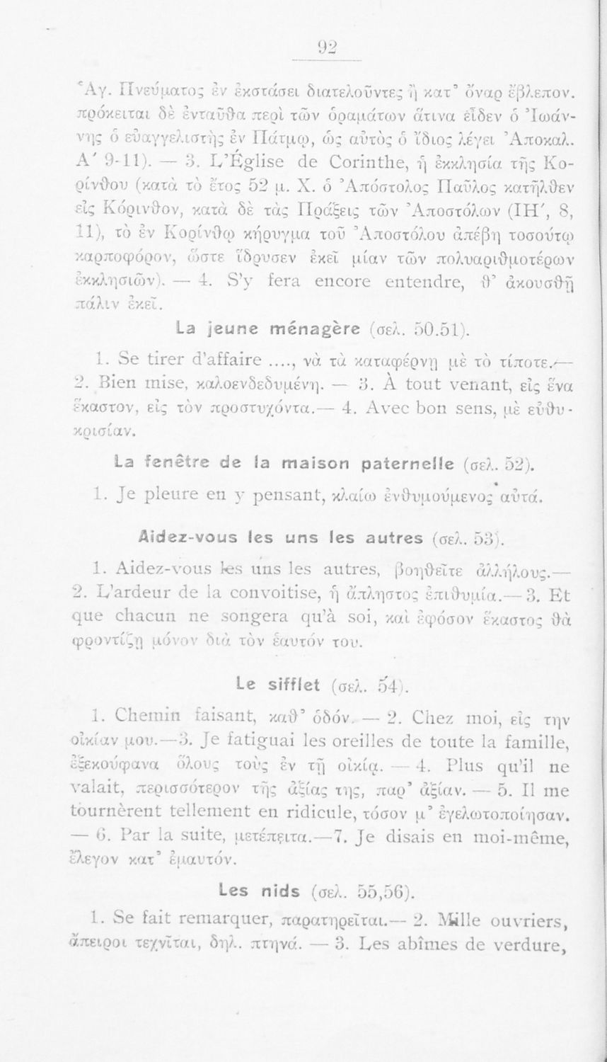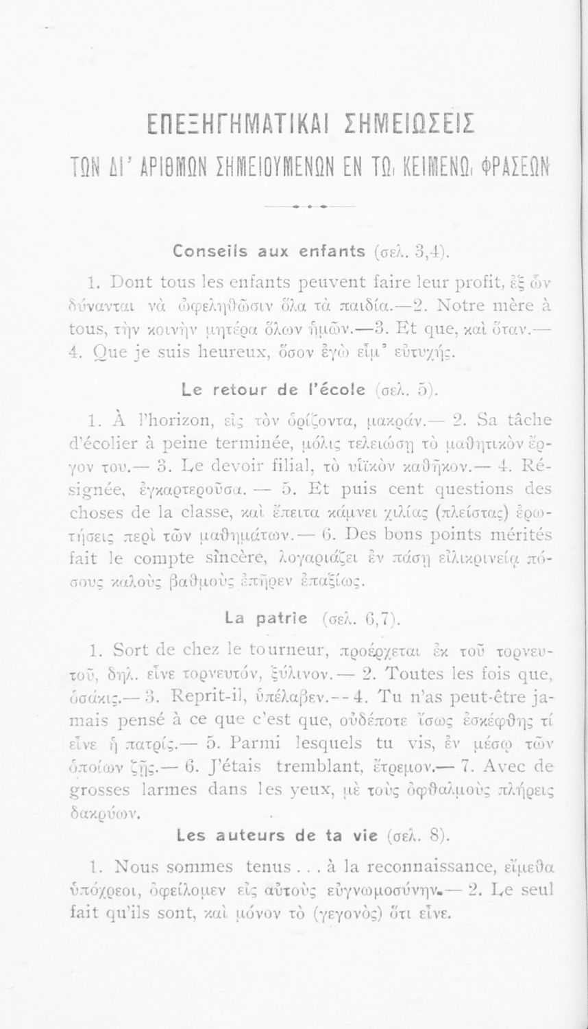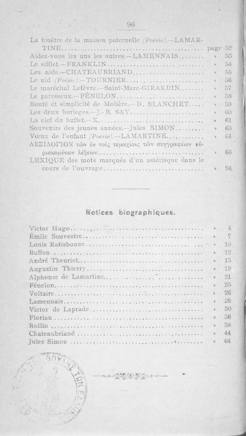 Σχολικό εγχειρίδιο Γαλλικών Α΄ Γυμνασίου και Β΄ και Γ΄ Αστικού Σχολείου που περιλαμβάνει αποσπάσματα έργων επιφανών Γάλλων συγγραφέων, σύντομα βιογραφικά σημειώματα, επεξηγηματικά σχόλια, ασκήσεις και λεξιλόγιο.