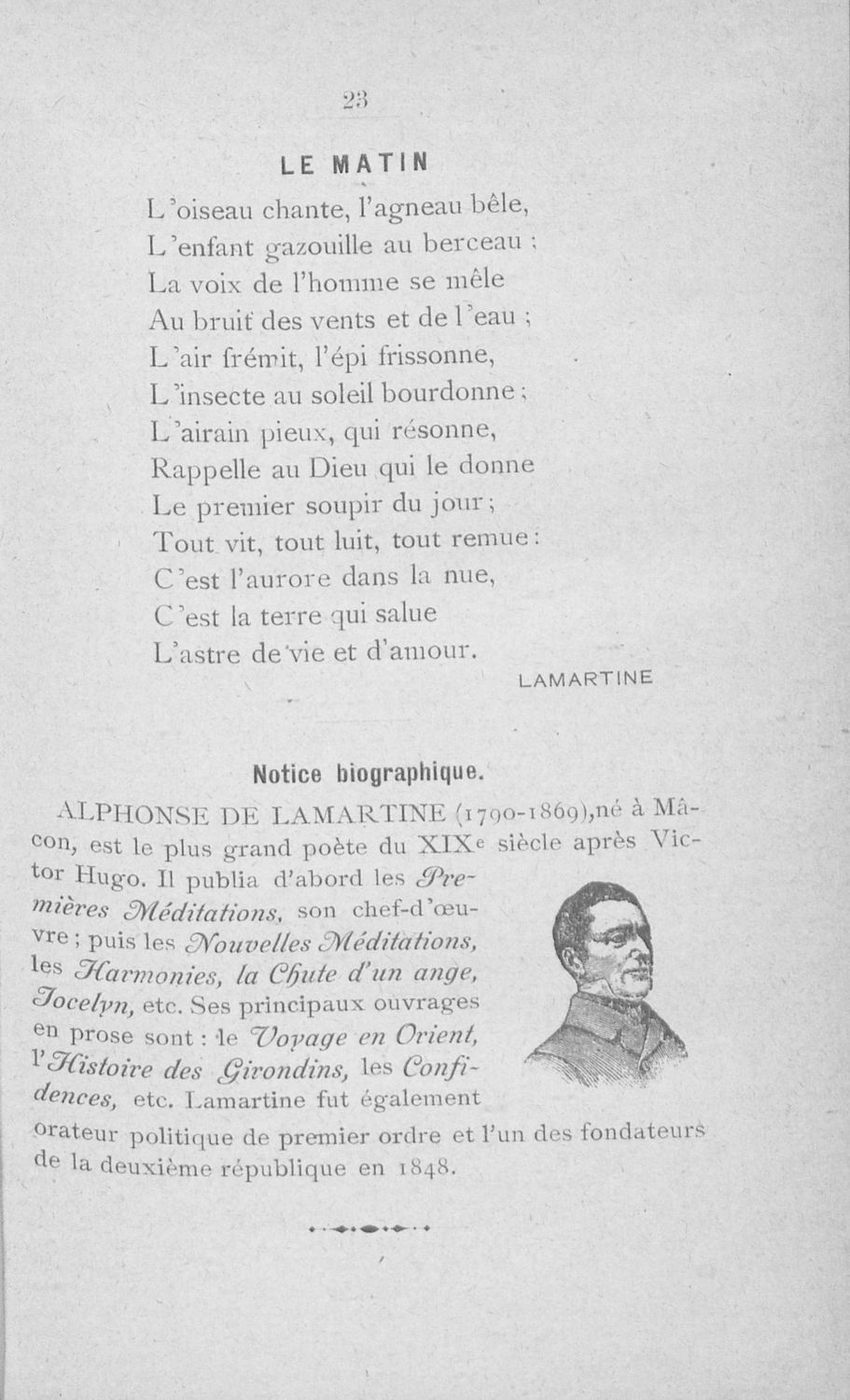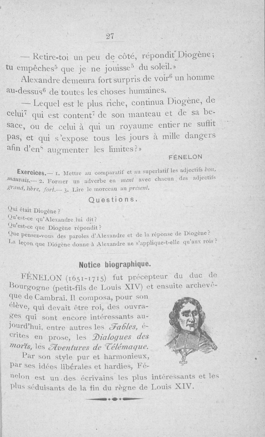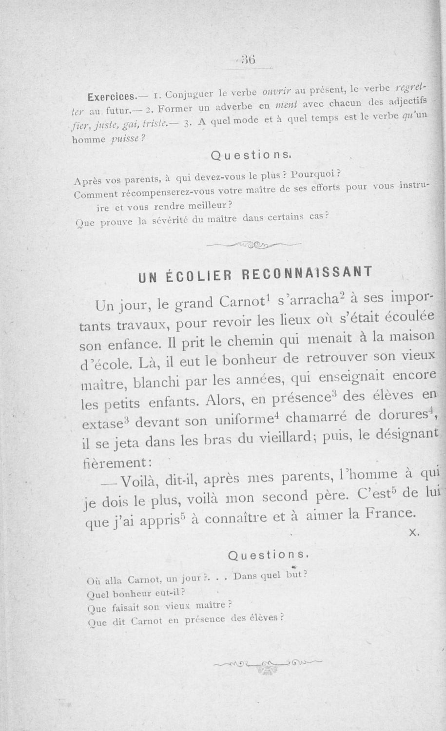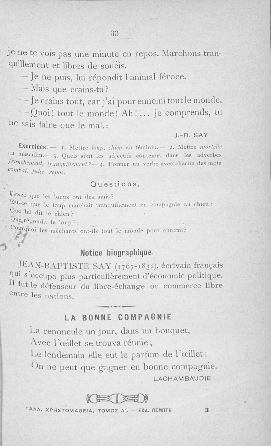 Βαθμίδα εκπαίδευσης: Δευτεροβάθμια Τάξη: Α' Γυμνασίου / Γ' Αστικού Σχολείου Μάθημα: Γαλλικά Γλώσσα: Καθαρεύουσα Παρουσίαση περιεχομένου: Σχολικό εγχειρίδιο Γαλλικών Α΄ Γυμνασίου και Γ΄ Αστικού Σχολείου που περιλαμβάνει αποσπάσματα έργων επιφανών Γάλλων συγγραφέων, σύντομα βιογραφικά σημειώματα, επεξηγηματικά σχόλια, ασκήσεις και λεξιλόγιο. |
