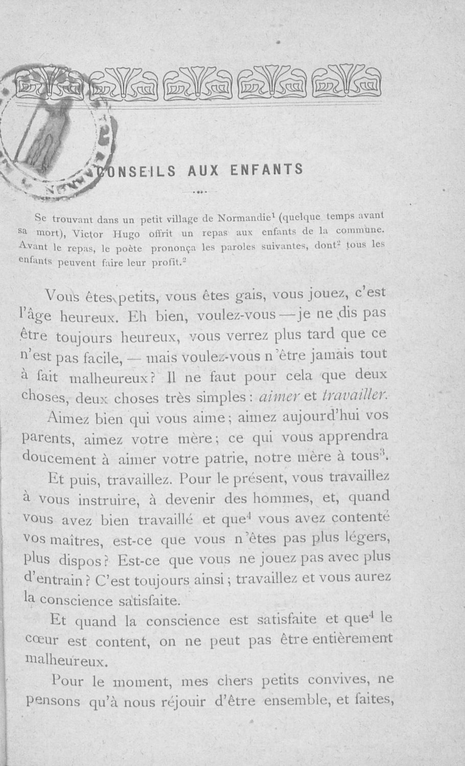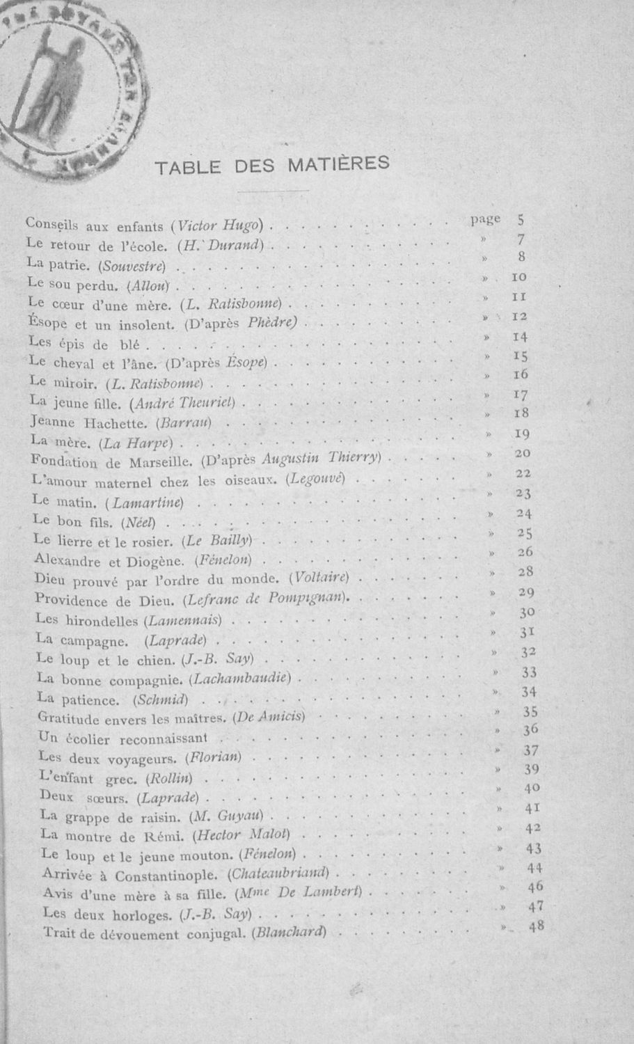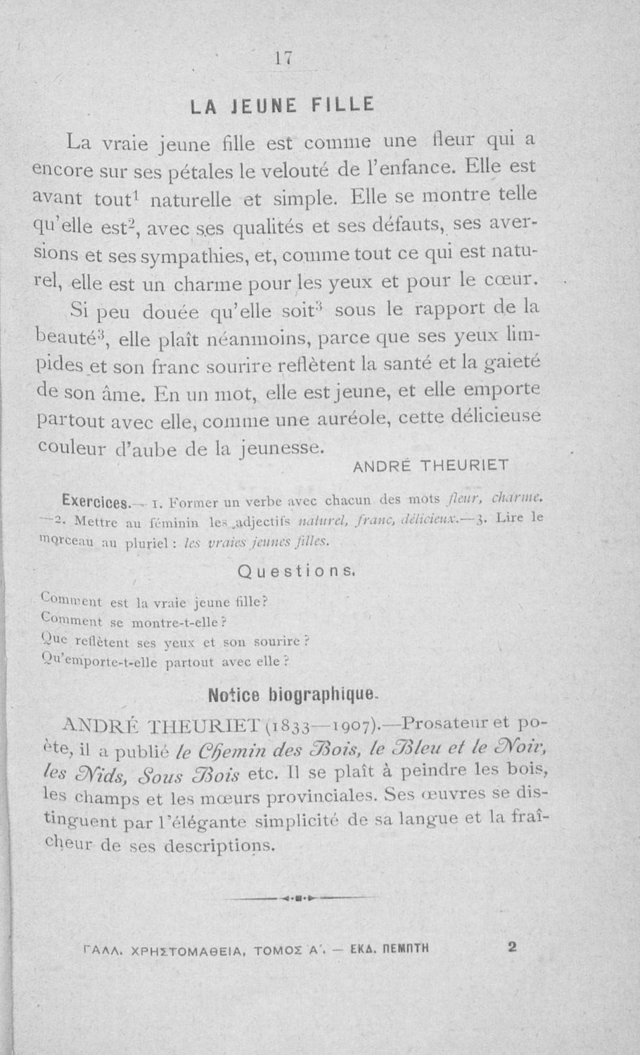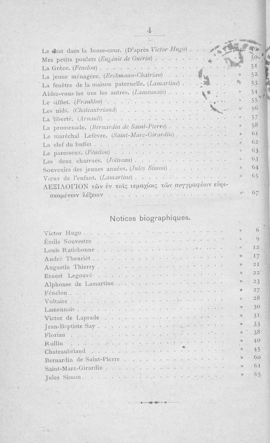 Σχολικό εγχειρίδιο Γαλλικών Α΄ Γυμνασίου και Γ΄ Αστικού Σχολείου που περιλαμβάνει αποσπάσματα έργων επιφανών Γάλλων συγγραφέων, σύντομα βιογραφικά σημειώματα, επεξηγηματικά σχόλια, ασκήσεις και λεξιλόγιο.