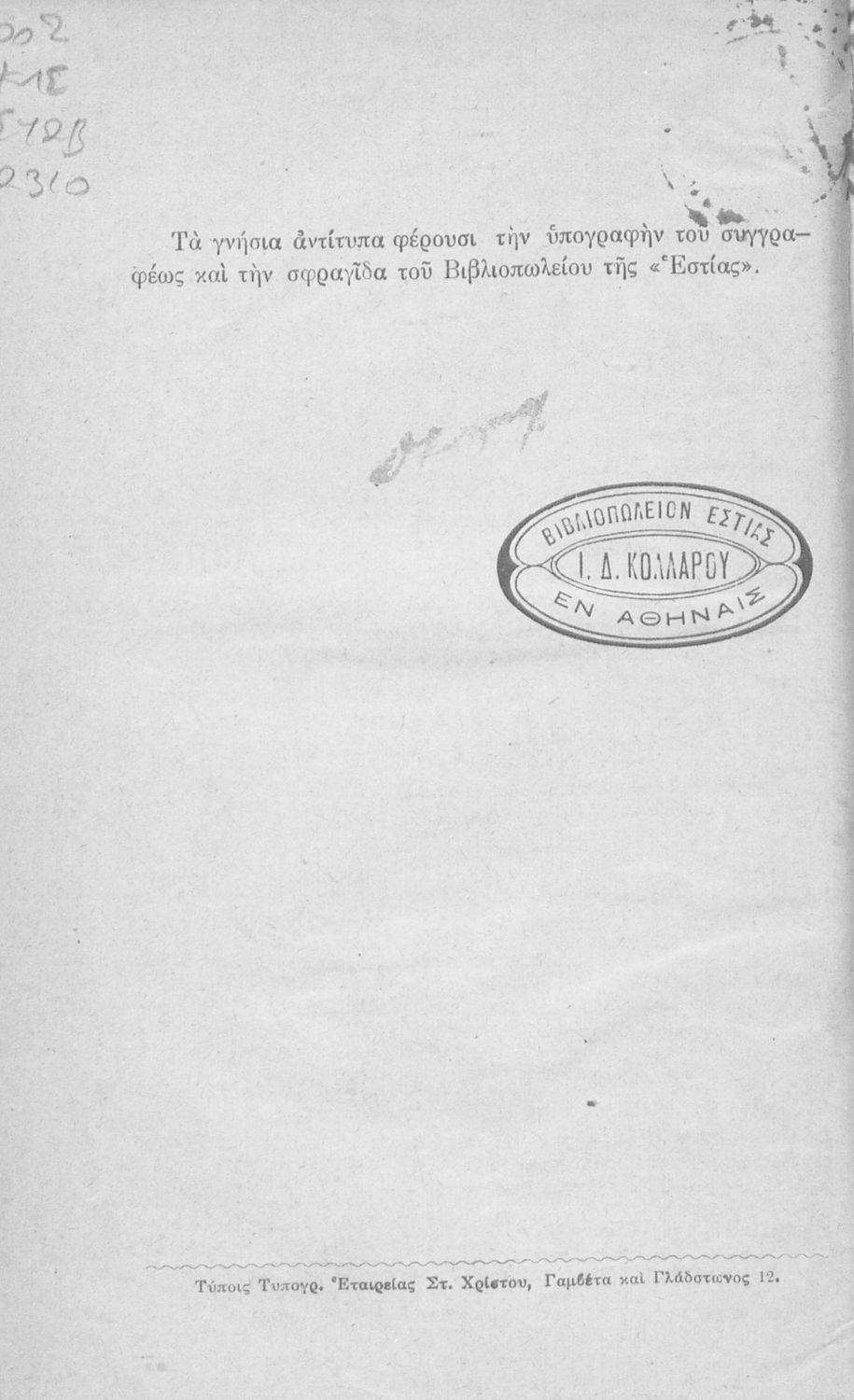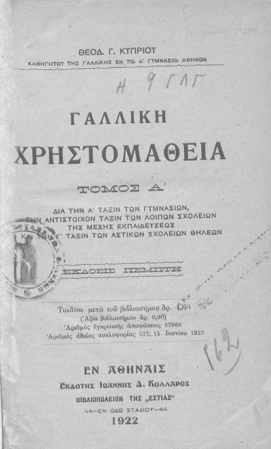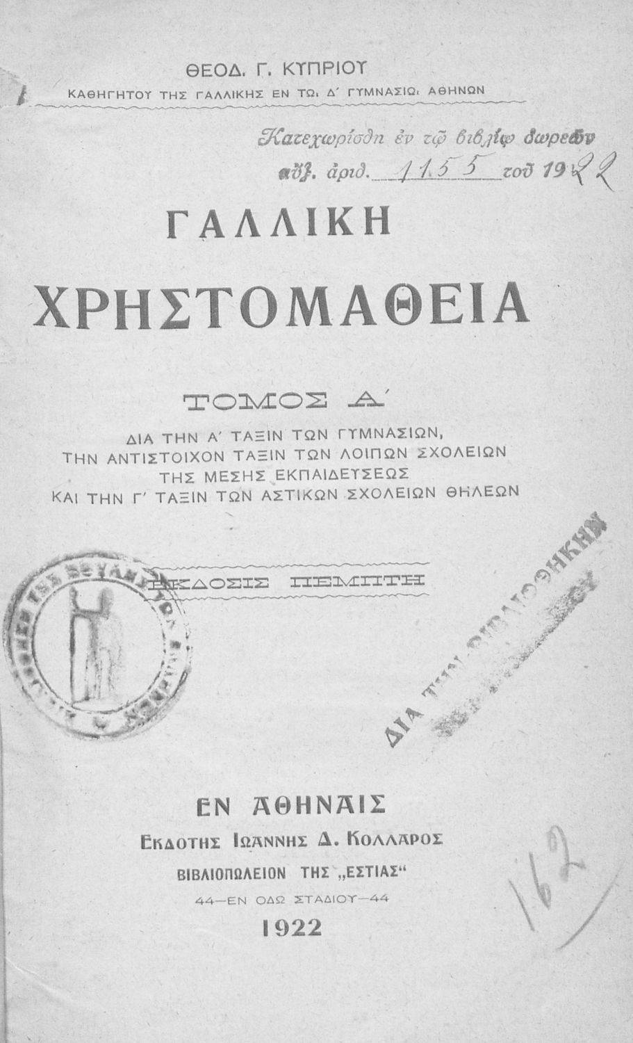 Εκδότης: Ιωάννης Δ. Κολλάρος, Βιβλιοπωλείο της "Εστίας" Έτος έκδοσης: 1922 Τόπος έκδοσης: Αθήνα Έκδοση: 5η Υπουργική απόφαση / Σύμβαση: 27966/ 28-9-1917 Έτος έγκρισης: 1922 |