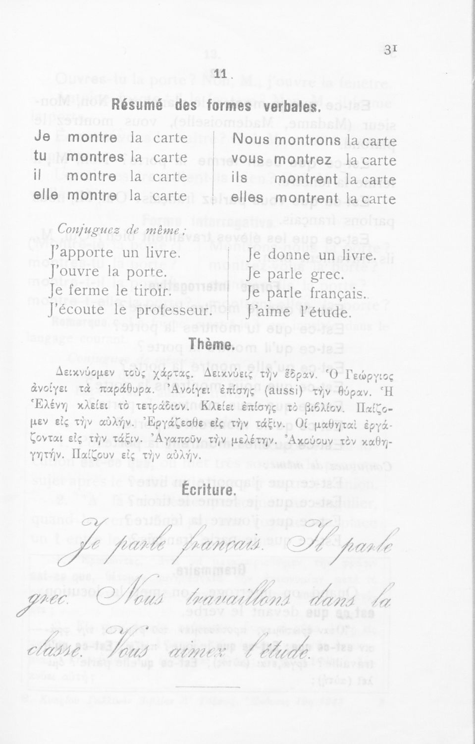 Παρουσίαση περιεχομένου: Σχολικό εγχειρίδιο Α΄ Τάξη Αστικών Σχολείων, Γ΄ Γυμνασίων Νέου Τύπου για το μάθημα των Γαλλικών. Περιέχει κείμενα, γραμματικές και λεξιλογικές παρατηρήσεις του συγγραφέα. Περιλαμβάνει και λεξιλόγιο.