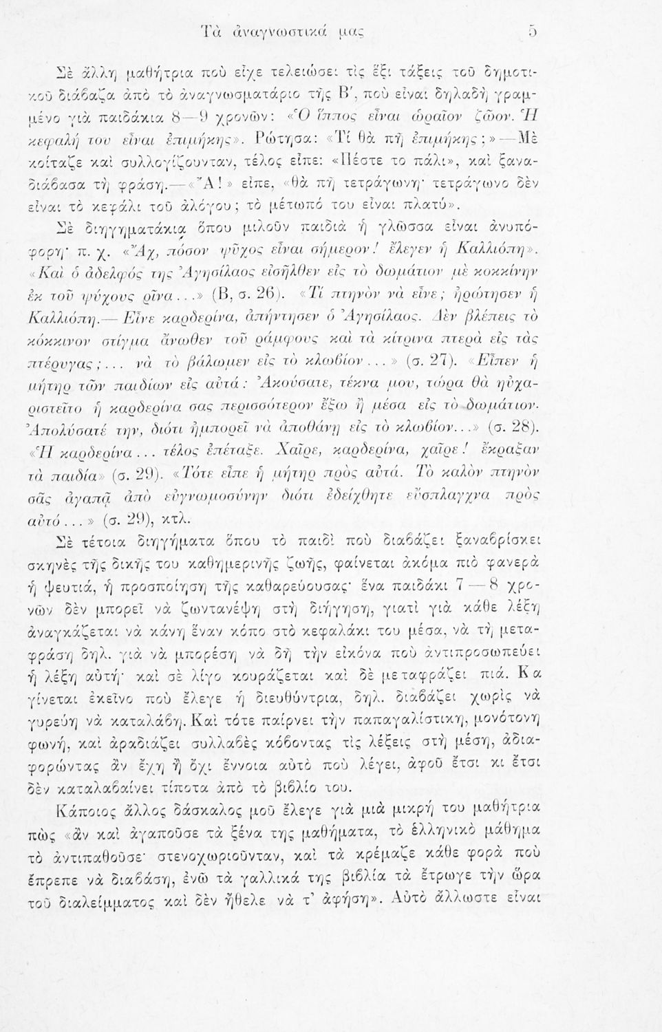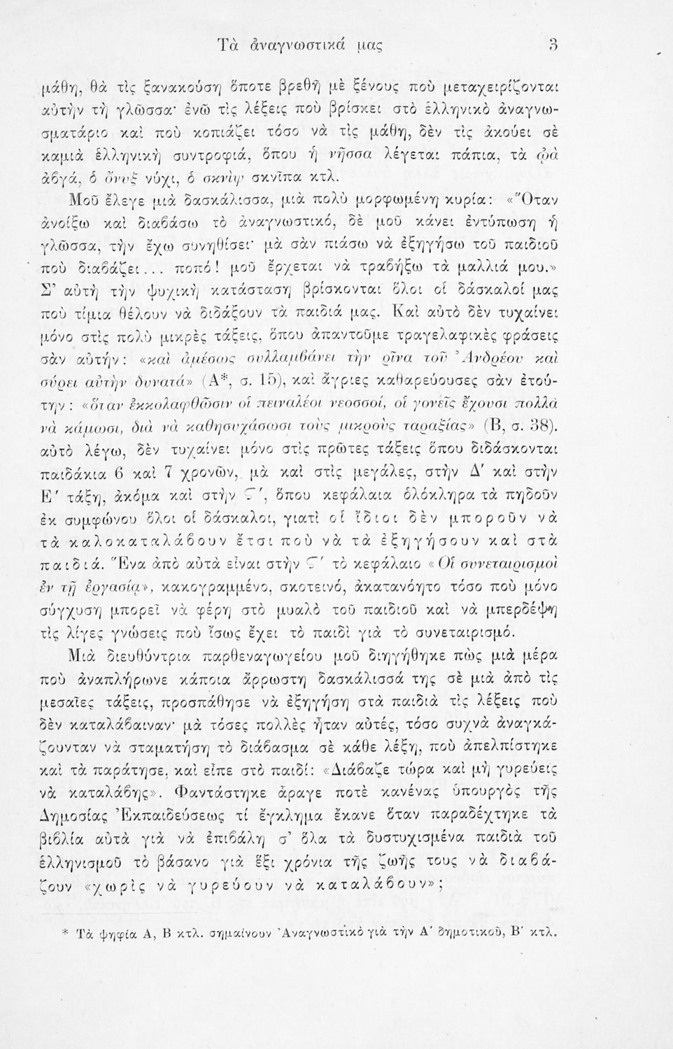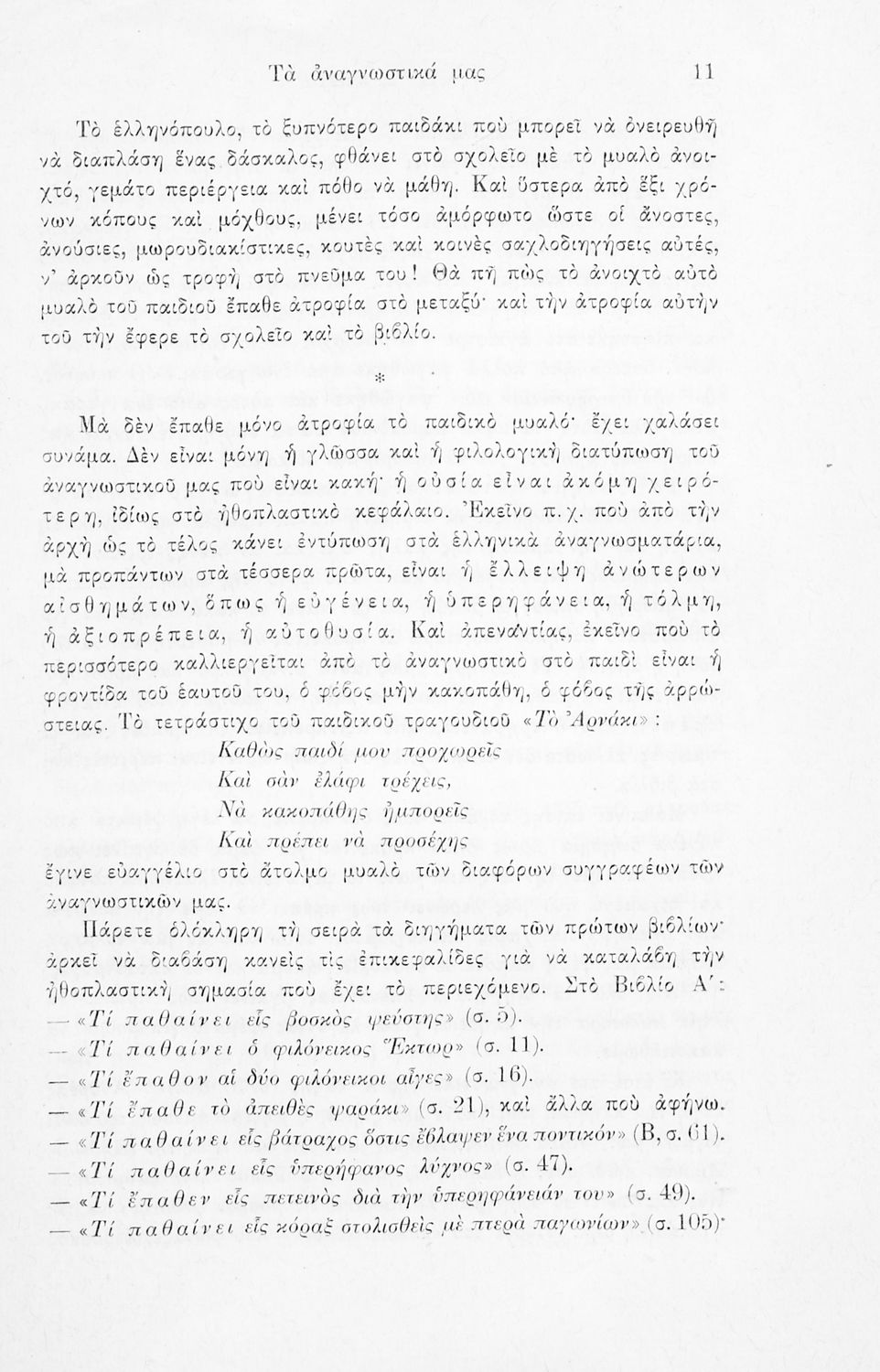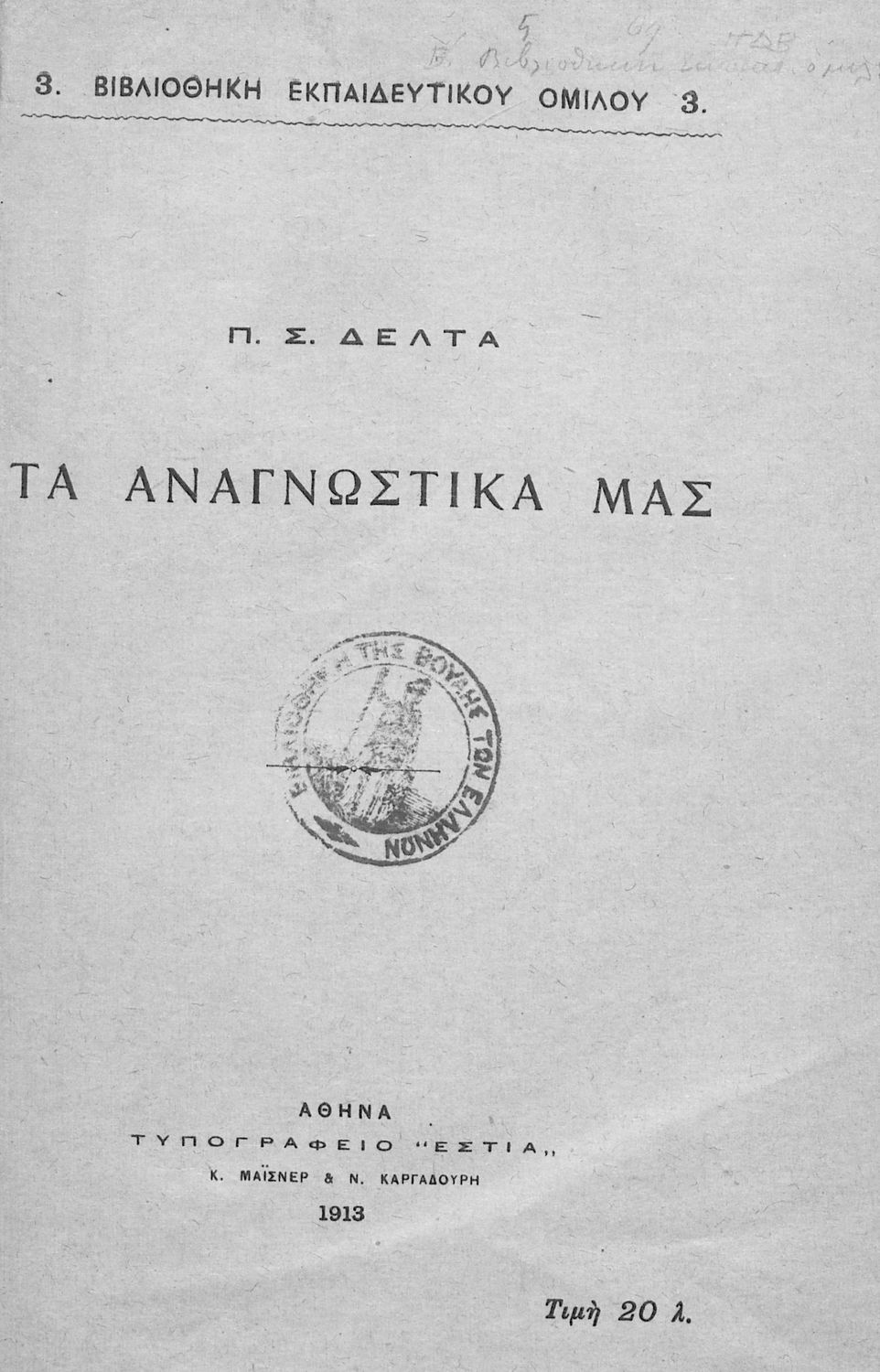 Άρθρο που πρωτοδημοσιεύτηκε στο Δελτίο του Εκπαιδευτικού Ομίλου (1913, 3, 232-256) και ασκεί δριμεία κριτική στα αναγνωστικά της εποχής τόσο στη μορφή, στο ύφος και στη γλώσσα όσο και στο περιεχόμενο και στη στοχοθεσία.