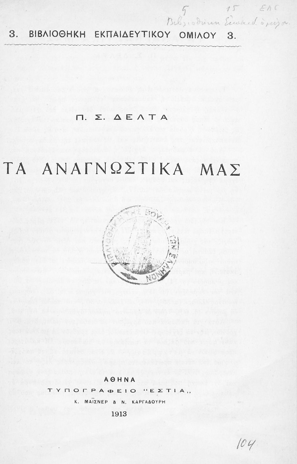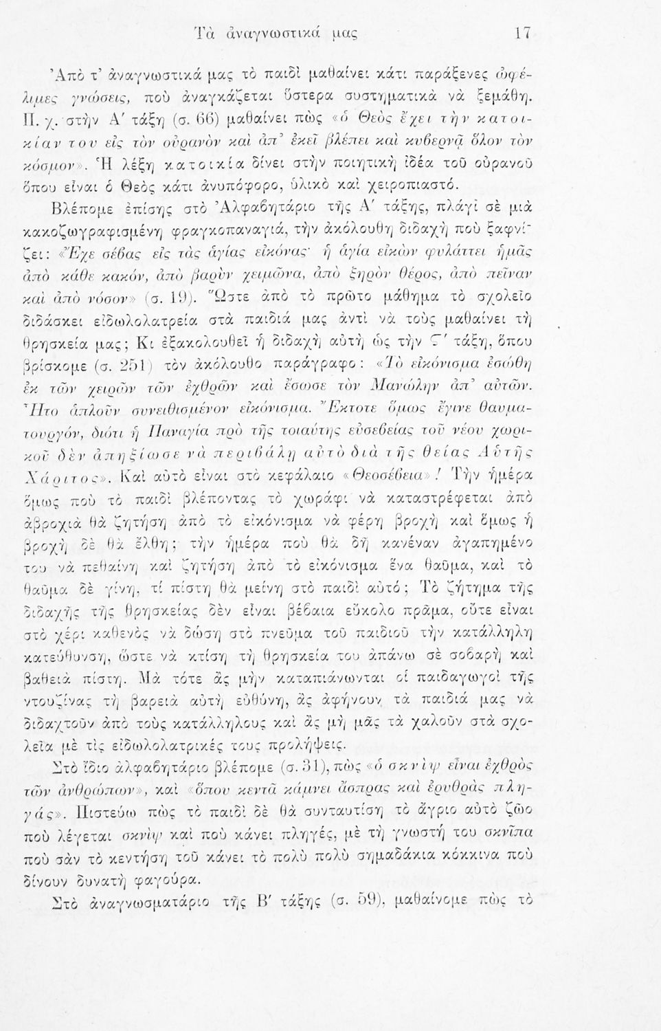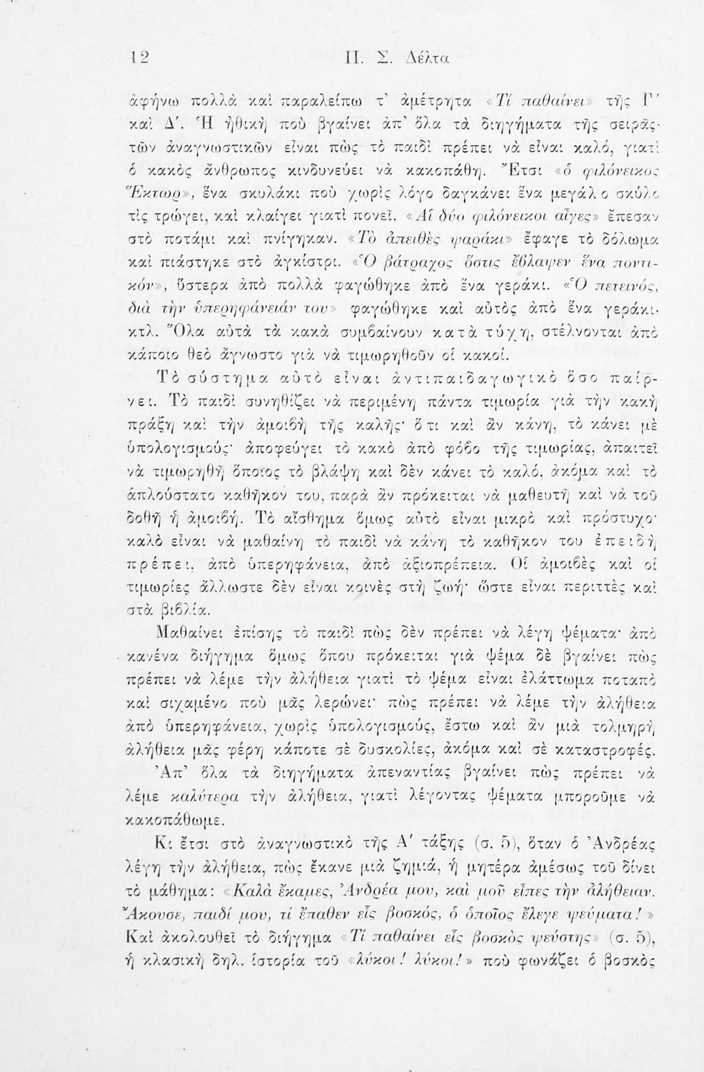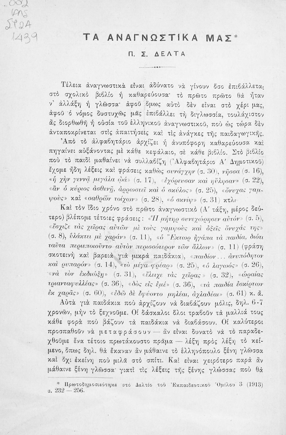 Άρθρο που πρωτοδημοσιεύτηκε στο Δελτίο του Εκπαιδευτικού Ομίλου (1913, 3, 232-256) και ασκεί δριμεία κριτική στα αναγνωστικά της εποχής τόσο στη μορφή, στο ύφος και στη γλώσσα όσο και στο περιεχόμενο και στη στοχοθεσία.