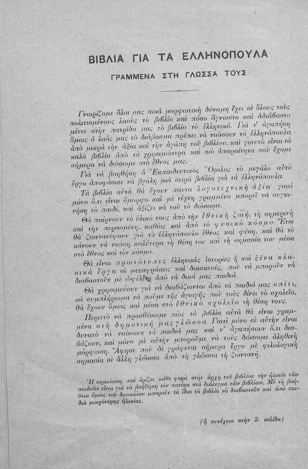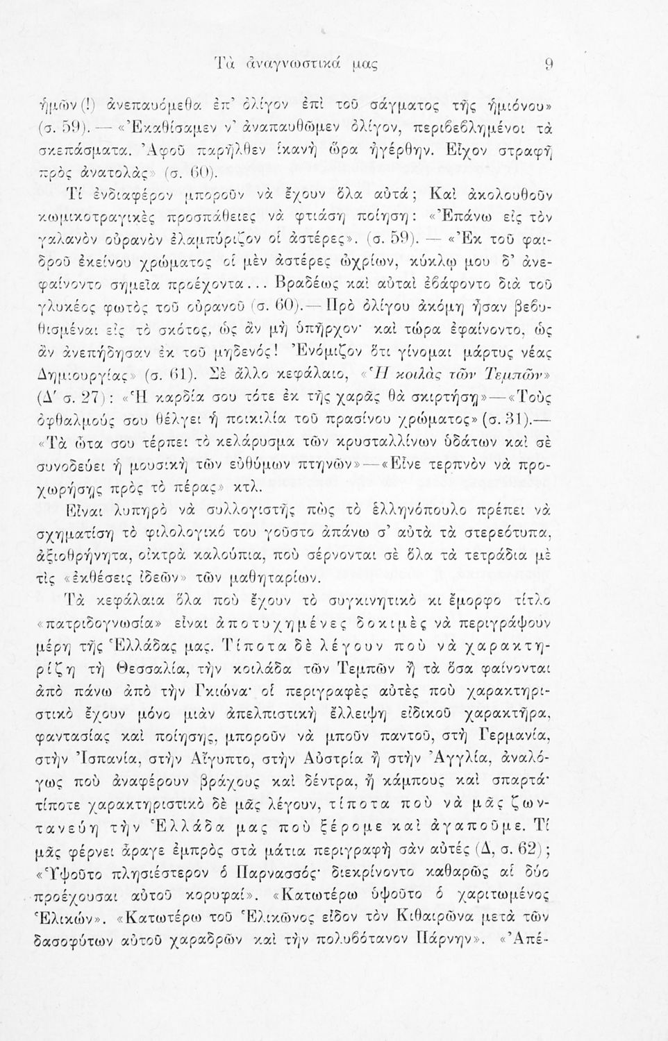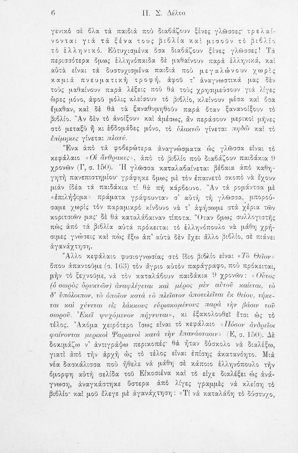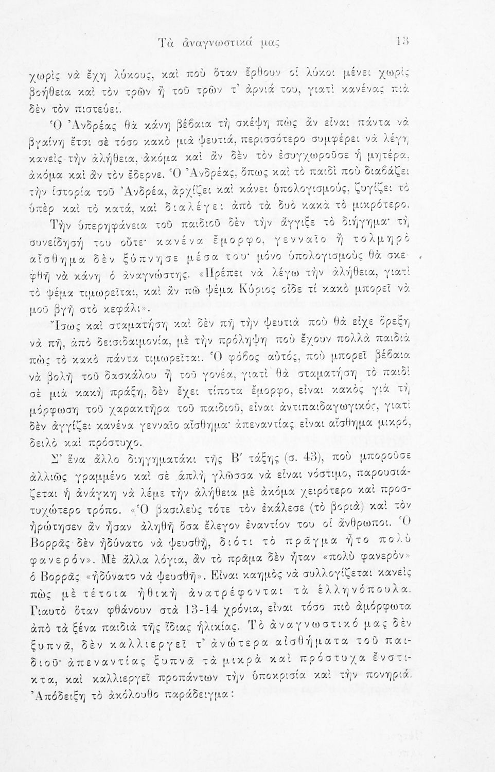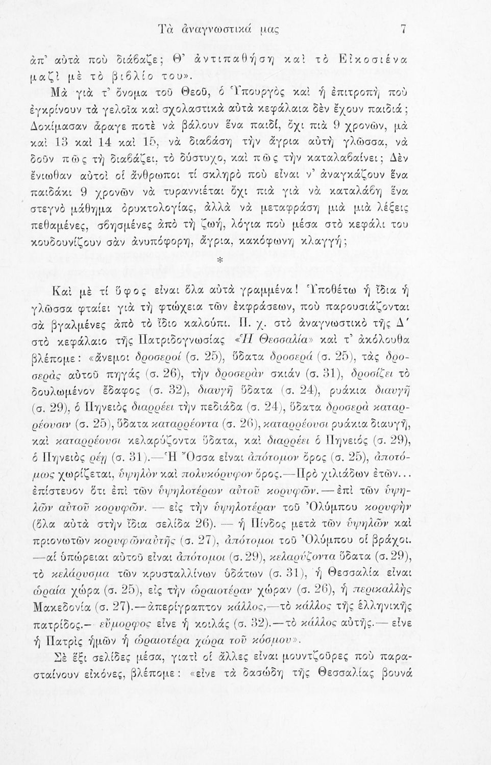 Άρθρο που πρωτοδημοσιεύτηκε στο Δελτίο του Εκπαιδευτικού Ομίλου (1913, 3, 232-256) και ασκεί δριμεία κριτική στα αναγνωστικά της εποχής τόσο στη μορφή, στο ύφος και στη γλώσσα όσο και στο περιεχόμενο και στη στοχοθεσία.