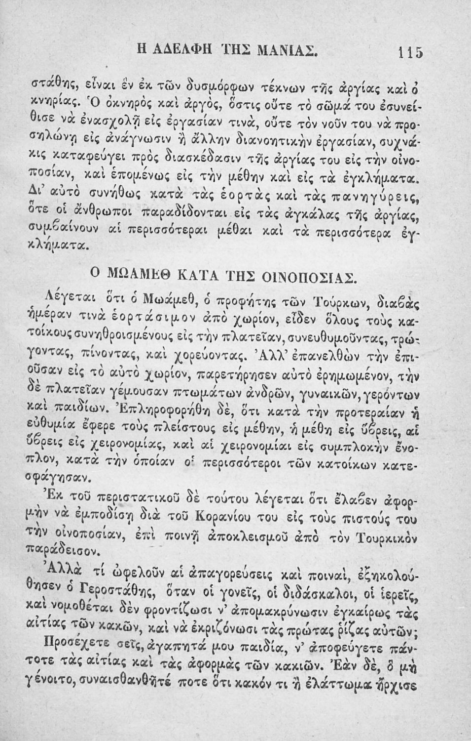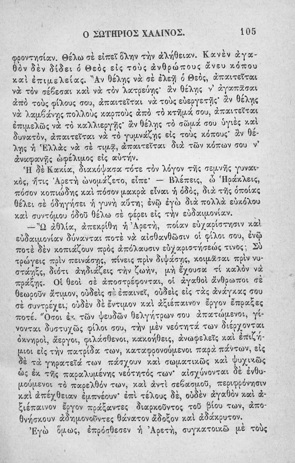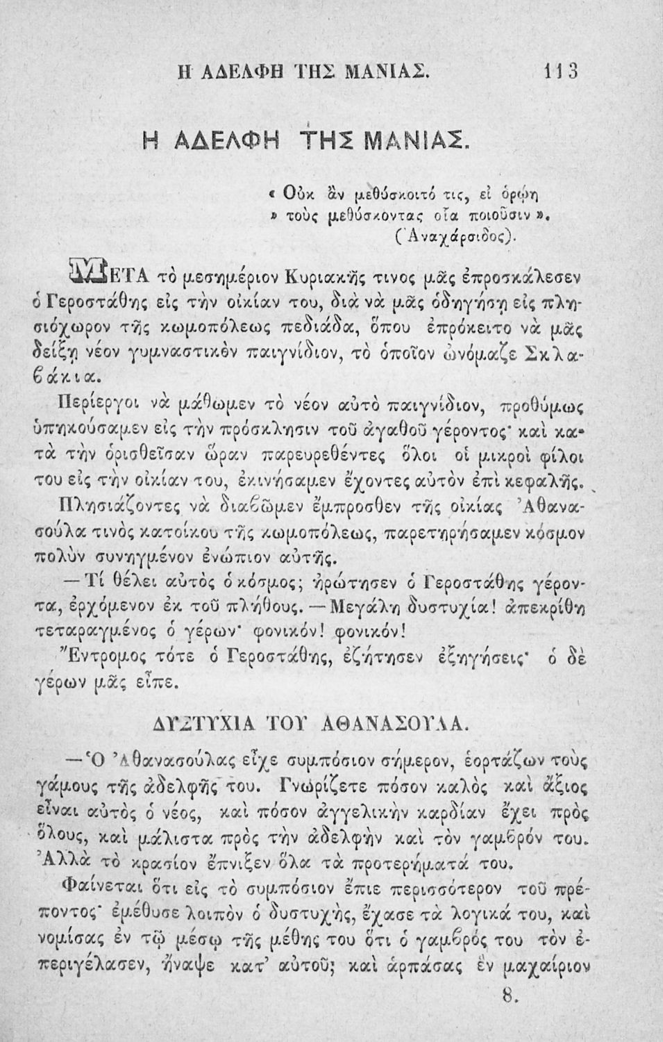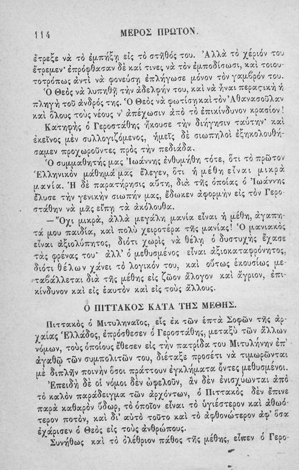 Αναγνωστικό των ανωτέρων τάξεων του Δημοτικού. Το βιβλίο χρησιμοποιήθηκε αρχικά ως ελεύθερο ανάγνωσμα για παιδιά, ενώ στη συνέχεια χρησιμοποιήθηκε ως Αναγνωστικό στο δεύτερο μισό του 19ου αιώνα. Περιέχει αφηγήσεις κυρίως από την αρχαία ελληνική ιστορία και από τη χριστιανική θρησκεία, οι οποίες αποσκοπούν στην εθνική και ηθική καλλιέργεια των μαθητών.
