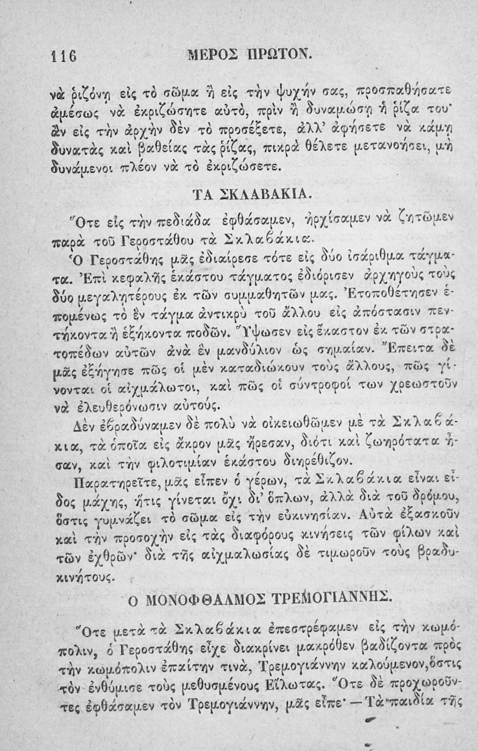 Αναγνωστικό των ανωτέρων τάξεων του Δημοτικού. Το βιβλίο χρησιμοποιήθηκε αρχικά ως ελεύθερο ανάγνωσμα για παιδιά, ενώ στη συνέχεια χρησιμοποιήθηκε ως Αναγνωστικό στο δεύτερο μισό του 19ου αιώνα. Περιέχει ...
