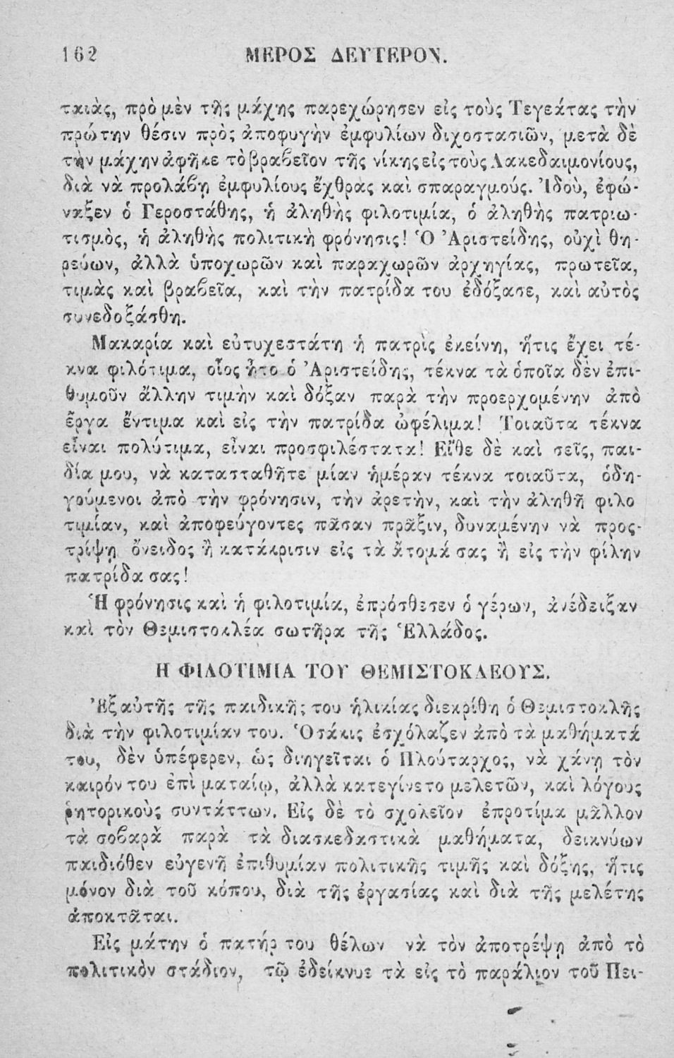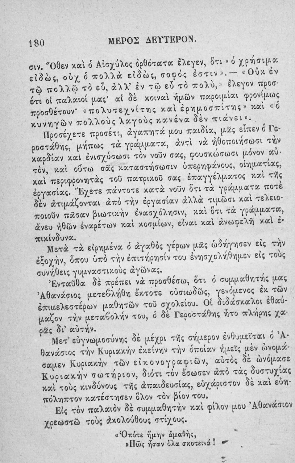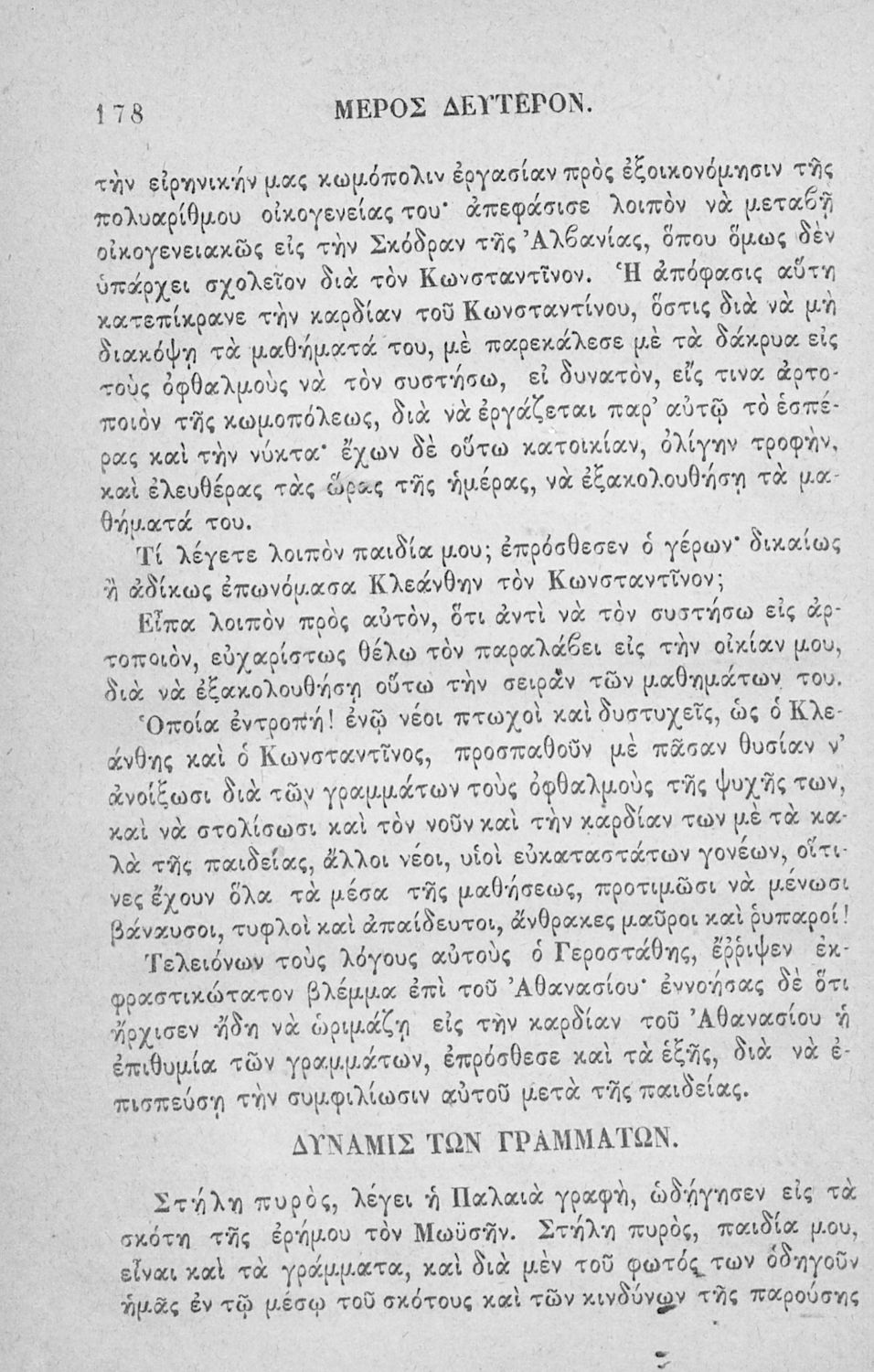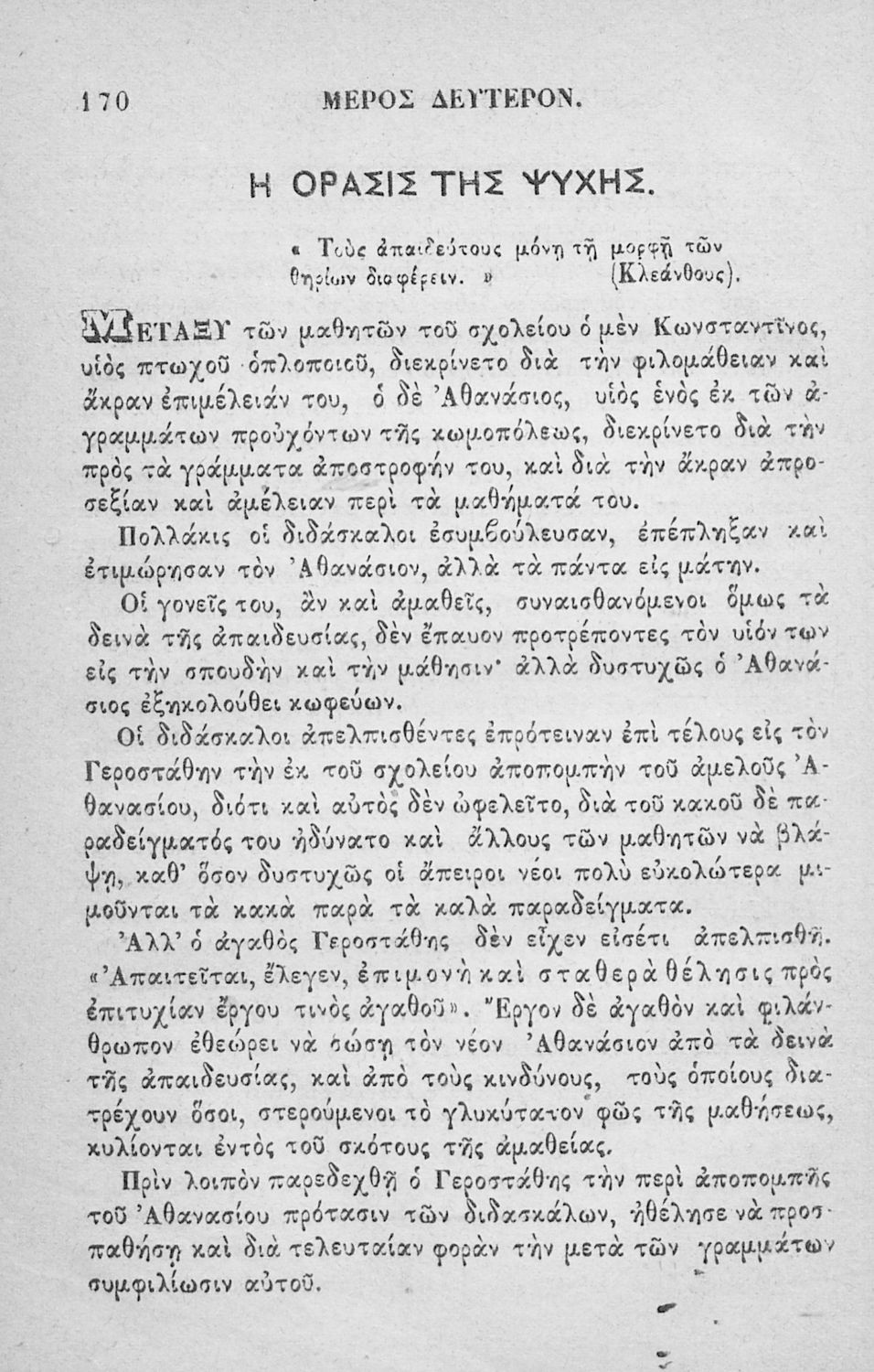 Αναγνωστικό των ανωτέρων τάξεων του Δημοτικού. Το βιβλίο χρησιμοποιήθηκε αρχικά ως ελεύθερο ανάγνωσμα για παιδιά, ενώ στη συνέχεια χρησιμοποιήθηκε ως Αναγνωστικό στο δεύτερο μισό του 19ου αιώνα. Περιέχει αφηγήσεις κυρίως από την αρχαία ελληνική ιστορία και από τη χριστιανική θρησκεία, οι οποίες αποσκοπούν στην εθνική και ηθική καλλιέργεια των μαθητών.