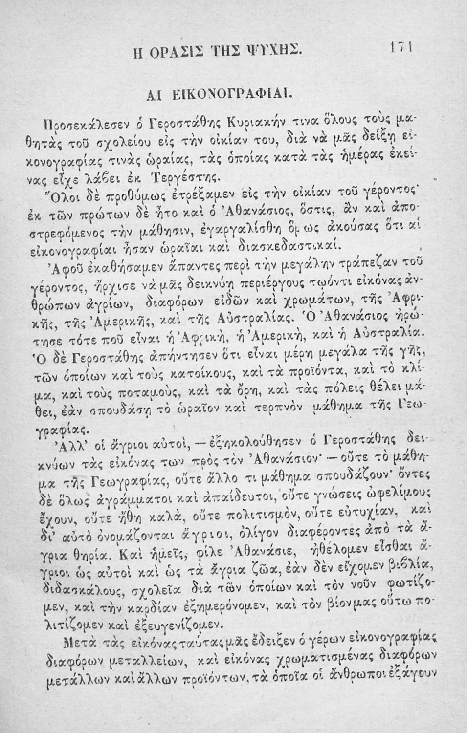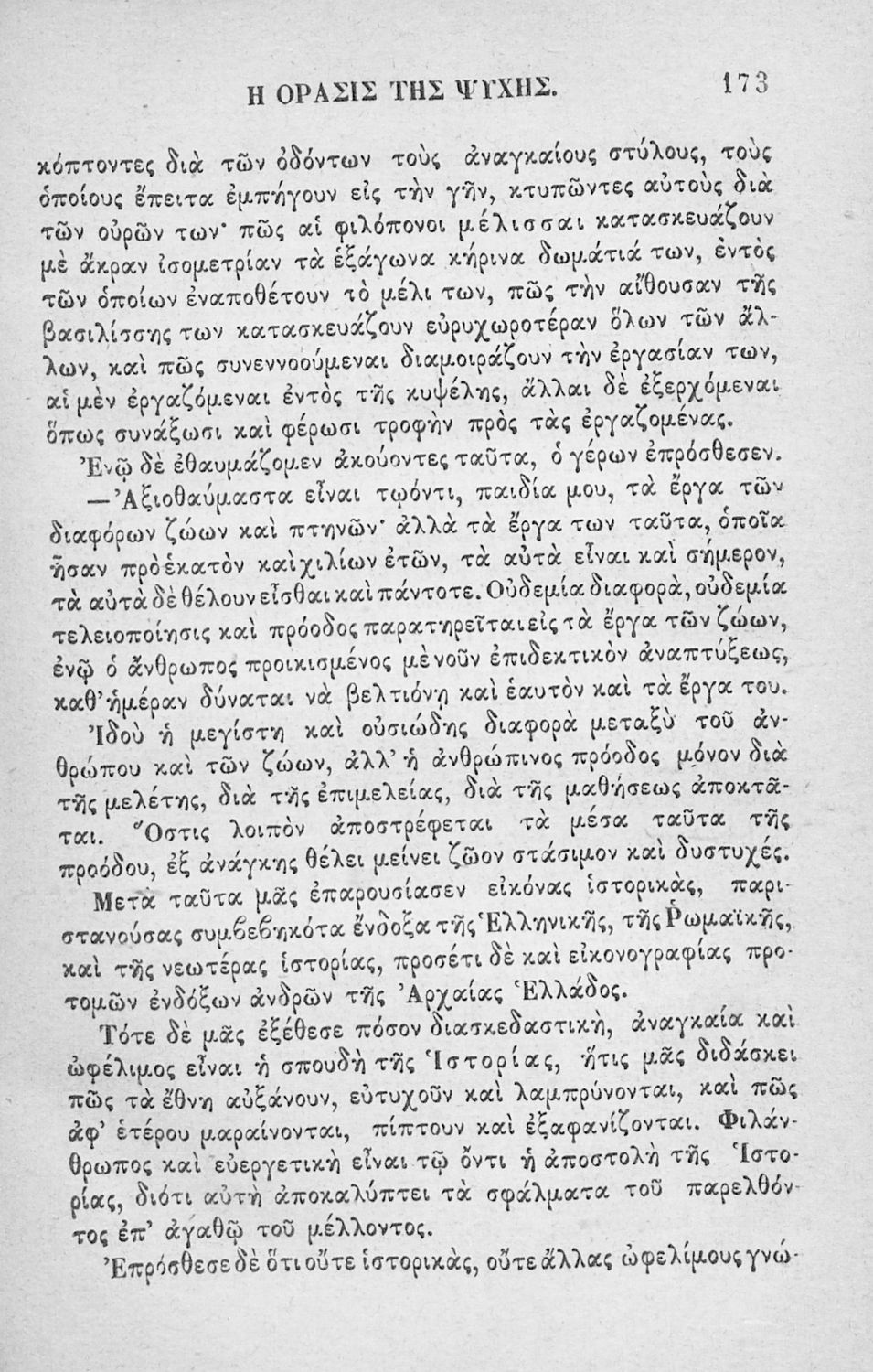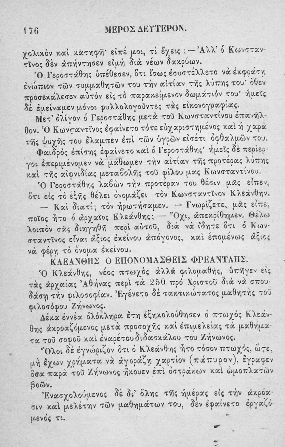 Αναγνωστικό των ανωτέρων τάξεων του Δημοτικού. Το βιβλίο χρησιμοποιήθηκε αρχικά ως ελεύθερο ανάγνωσμα για παιδιά, ενώ στη συνέχεια χρησιμοποιήθηκε ως Αναγνωστικό στο δεύτερο μισό του 19ου αιώνα. Περιέχει αφηγήσεις κυρίως από την αρχαία ελληνική ιστορία και από τη χριστιανική θρησκεία, οι οποίες αποσκοπούν στην εθνική και ηθική καλλιέργεια των μαθητών.