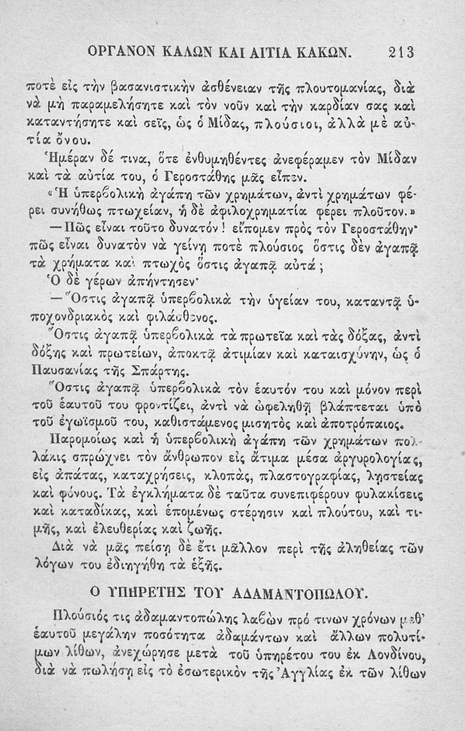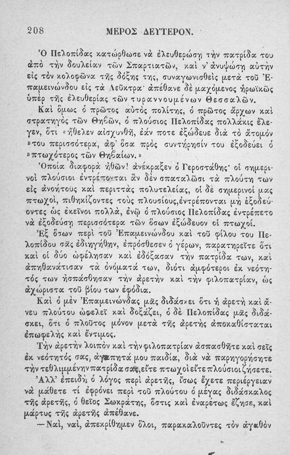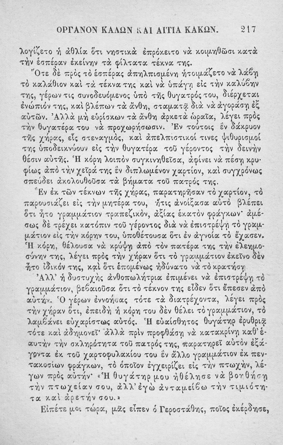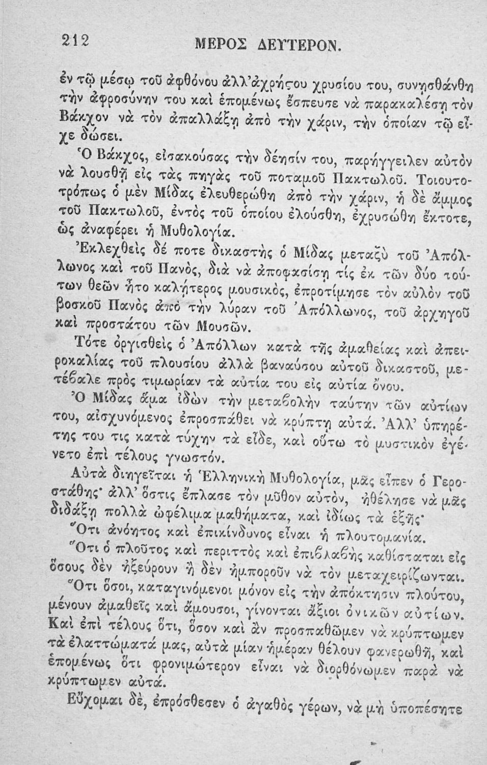 Αναγνωστικό των ανωτέρων τάξεων του Δημοτικού. Το βιβλίο χρησιμοποιήθηκε αρχικά ως ελεύθερο ανάγνωσμα για παιδιά, ενώ στη συνέχεια χρησιμοποιήθηκε ως Αναγνωστικό στο δεύτερο μισό του 19ου αιώνα. Περιέχει αφηγήσεις κυρίως από την αρχαία ελληνική ιστορία και από τη χριστιανική θρησκεία, οι οποίες αποσκοπούν στην εθνική και ηθική καλλιέργεια των μαθητών.