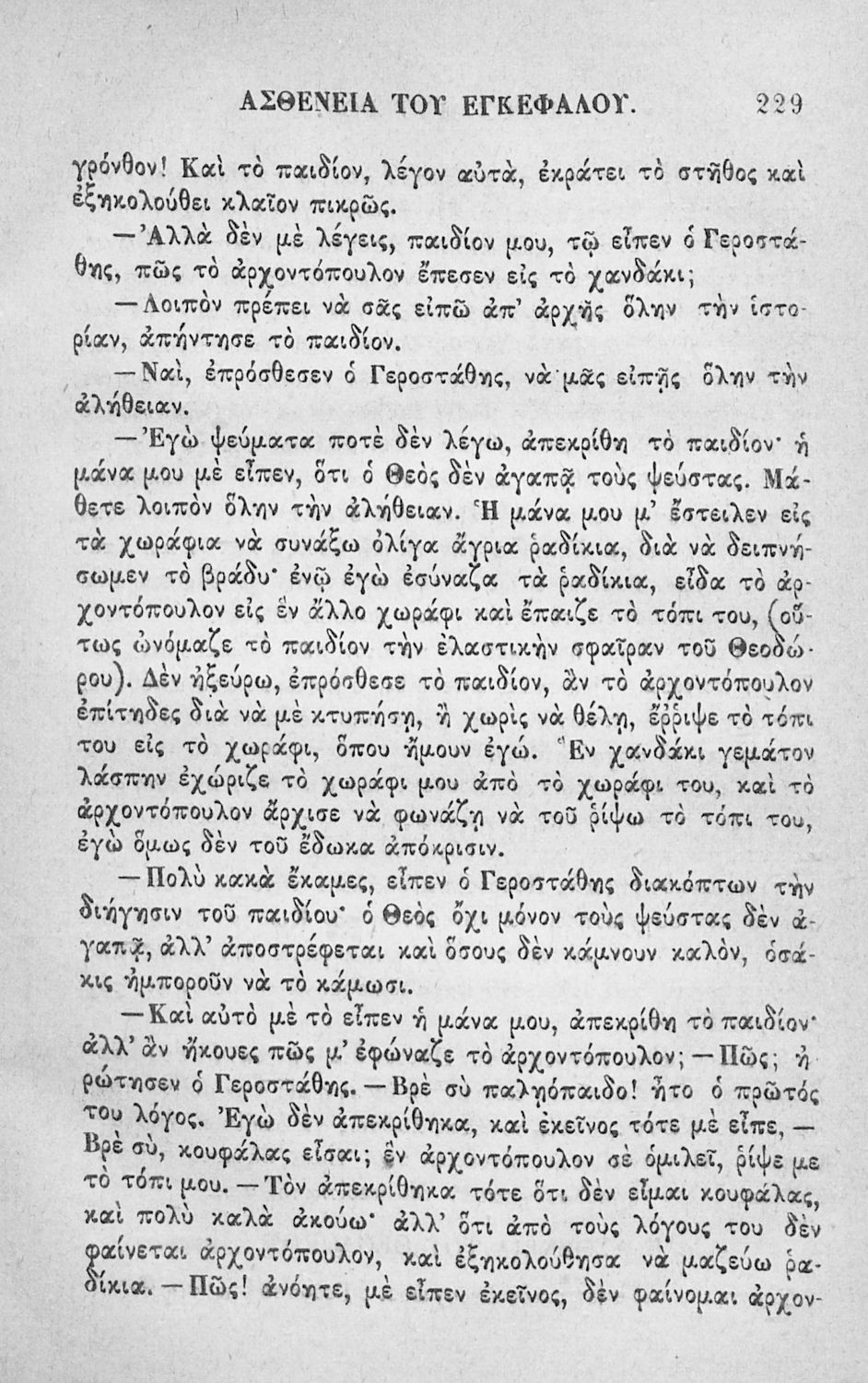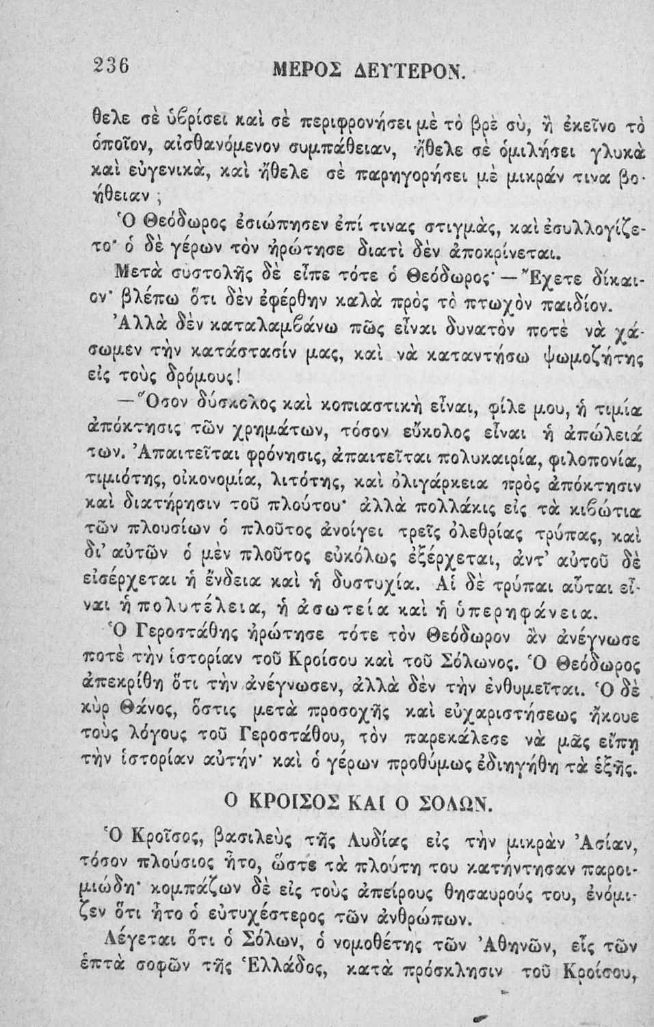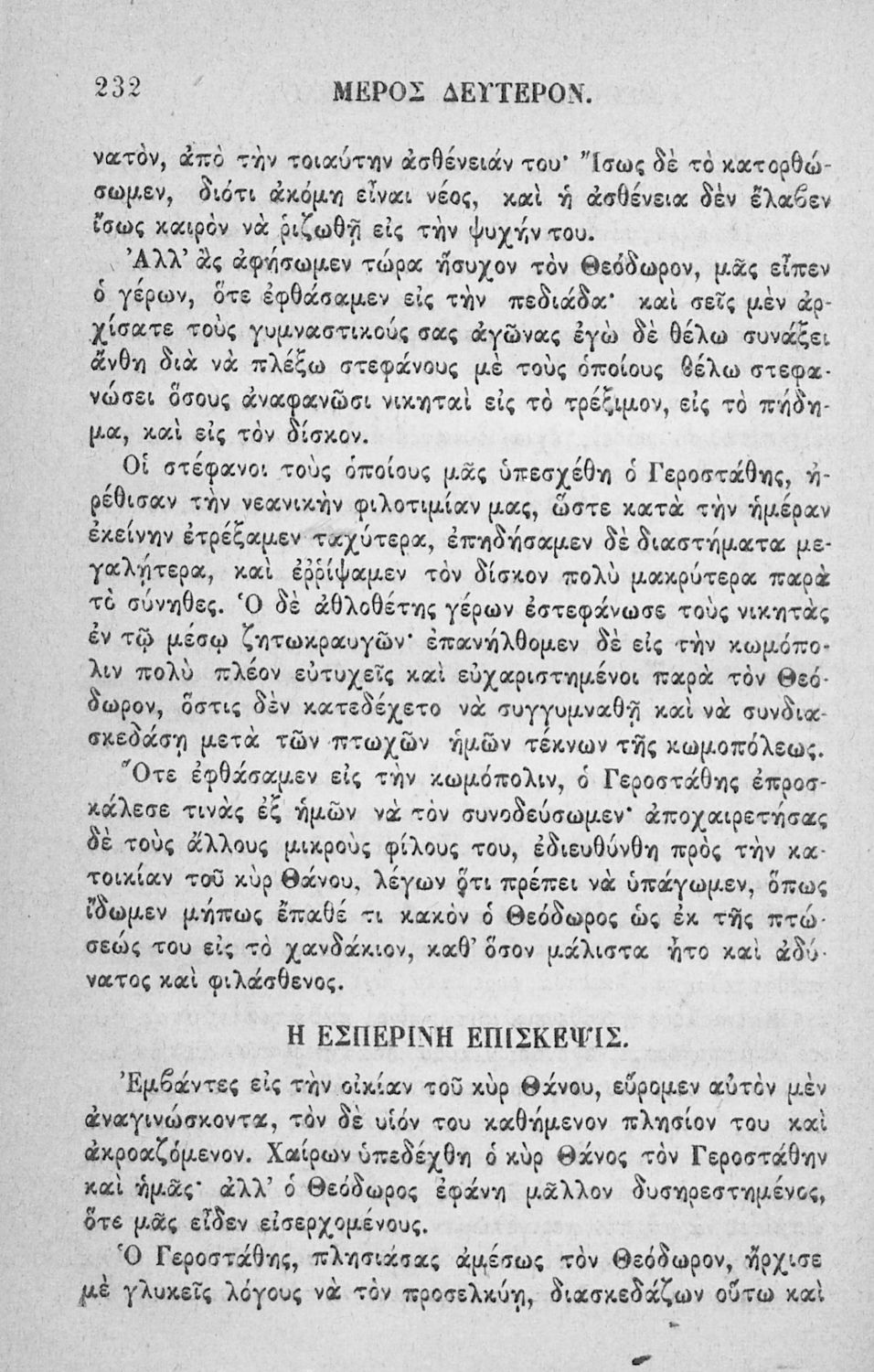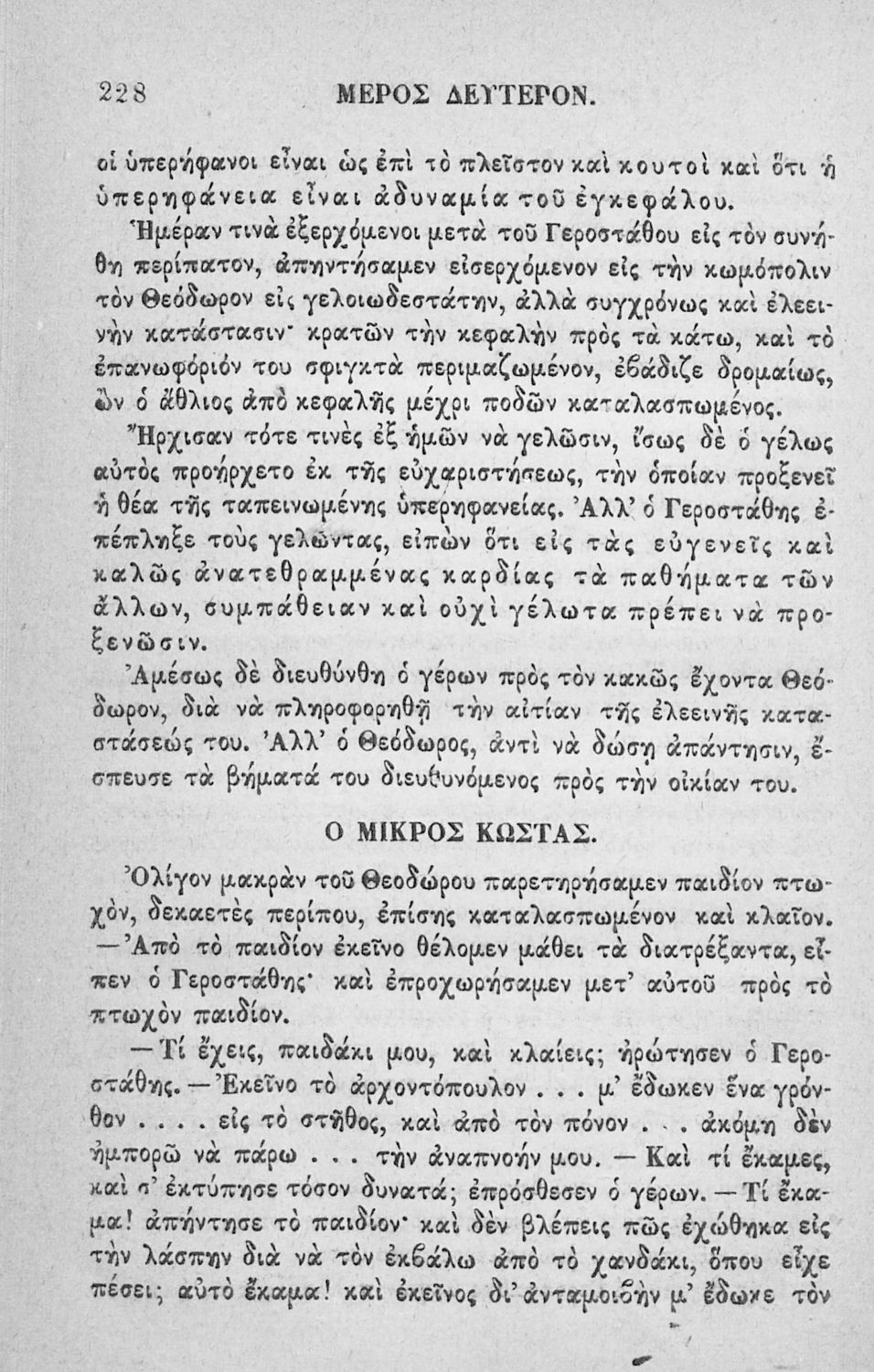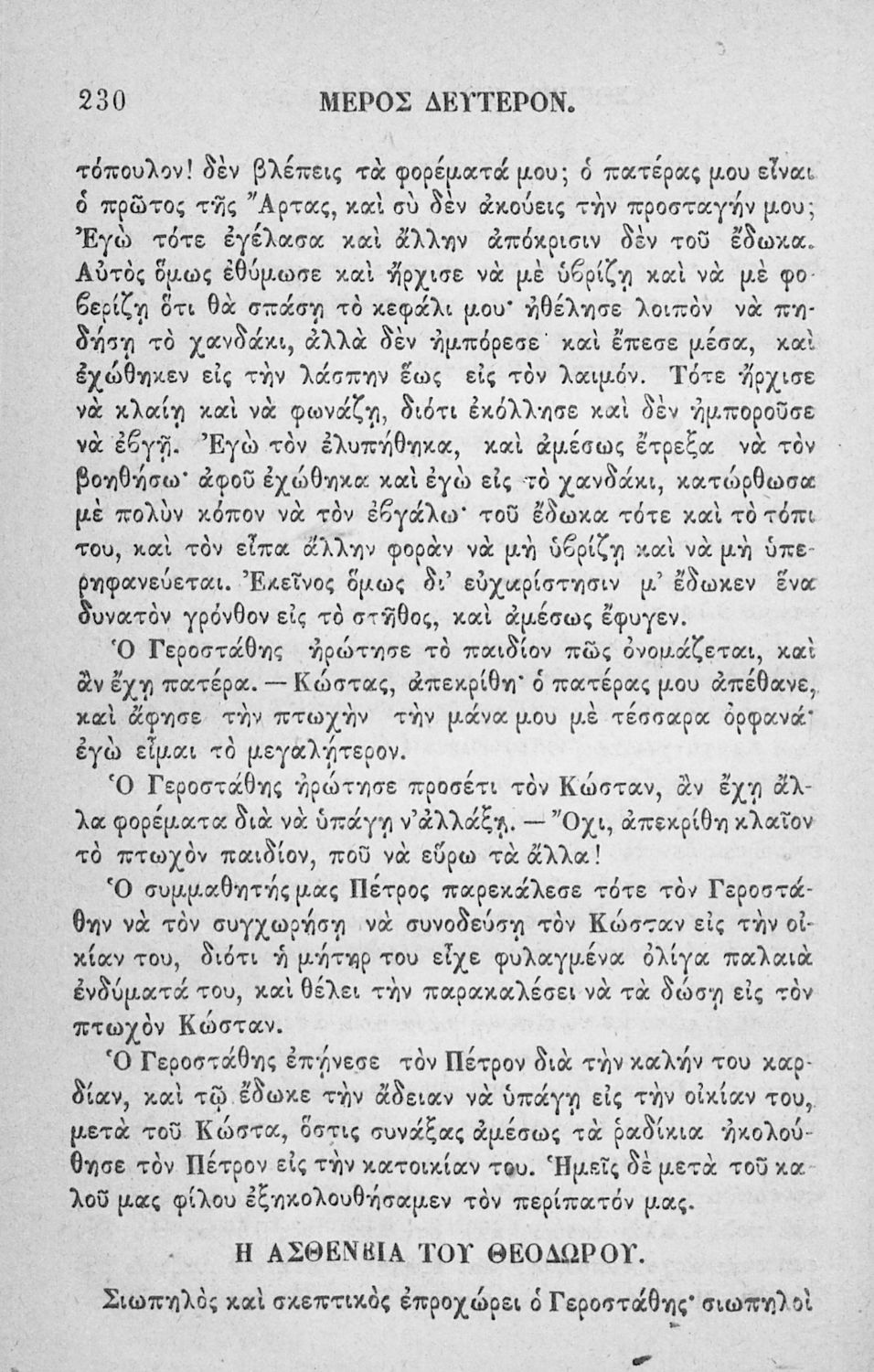 Αναγνωστικό των ανωτέρων τάξεων του Δημοτικού. Το βιβλίο χρησιμοποιήθηκε αρχικά ως ελεύθερο ανάγνωσμα για παιδιά, ενώ στη συνέχεια χρησιμοποιήθηκε ως Αναγνωστικό στο δεύτερο μισό του 19ου αιώνα. Περιέχει αφηγήσεις κυρίως από την αρχαία ελληνική ιστορία και από τη χριστιανική θρησκεία, οι οποίες αποσκοπούν στην εθνική και ηθική καλλιέργεια των μαθητών.