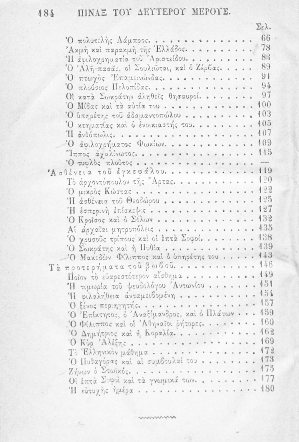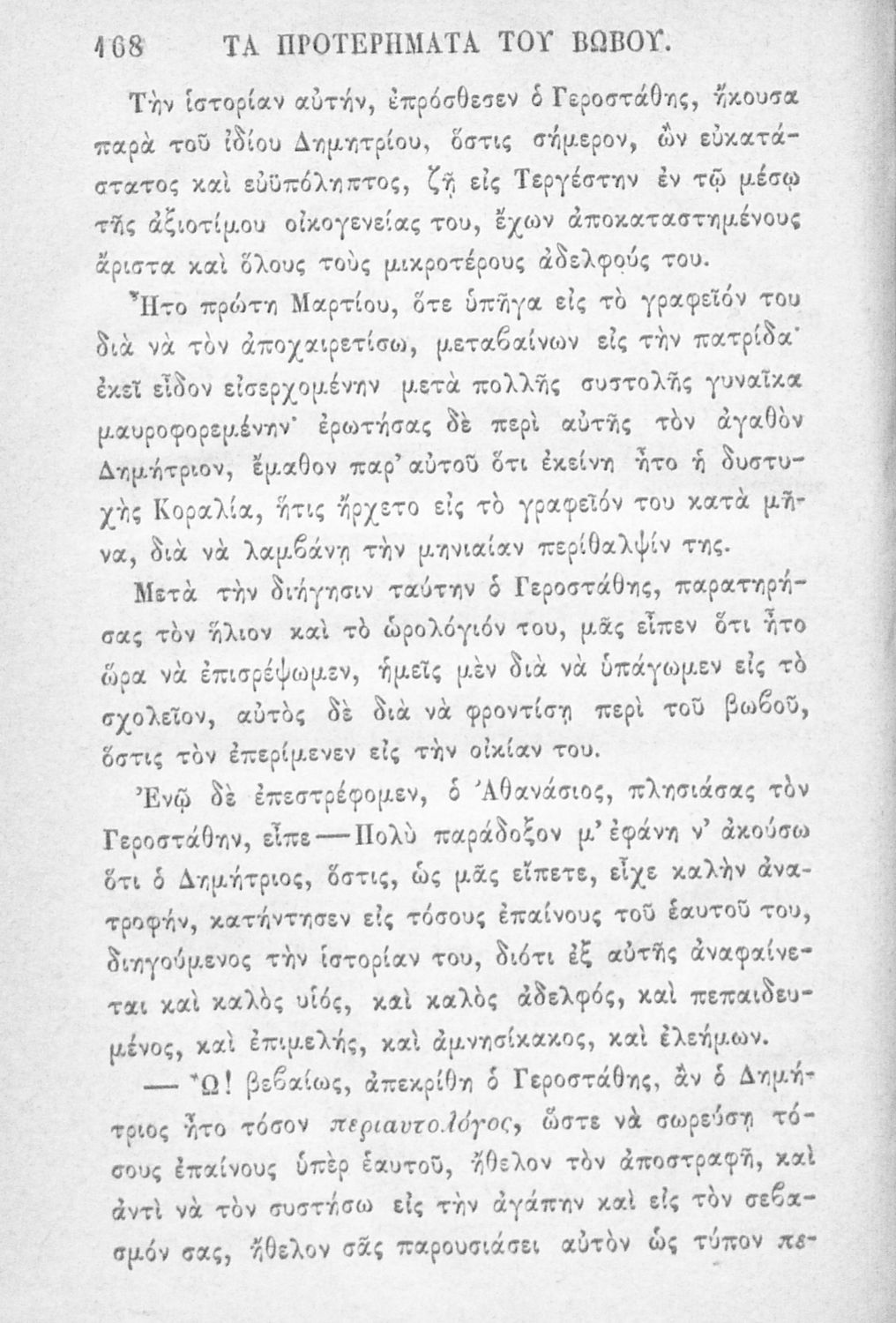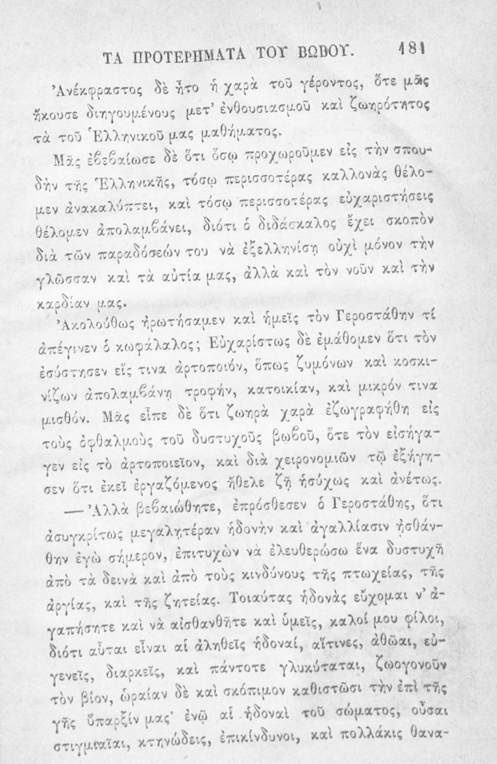 Αναγνωστικό των ανωτέρων τάξεων του Δημοτικού. Το βιβλίο χρησιμοποιήθηκε αρχικά ως ελεύθερο ανάγνωσμα για παιδιά, ενώ στη συνέχεια χρησιμοποιήθηκε ως Αναγνωστικό στο δεύτερο μισό του 19ου αιώνα. Περιέχει αφηγήσεις κυρίως από την αρχαία ελληνική ιστορία και από τη χριστιανική θρησκεία, οι οποίες αποσκοπούν στην εθνική και ηθική καλλιέργεια των μαθητών.