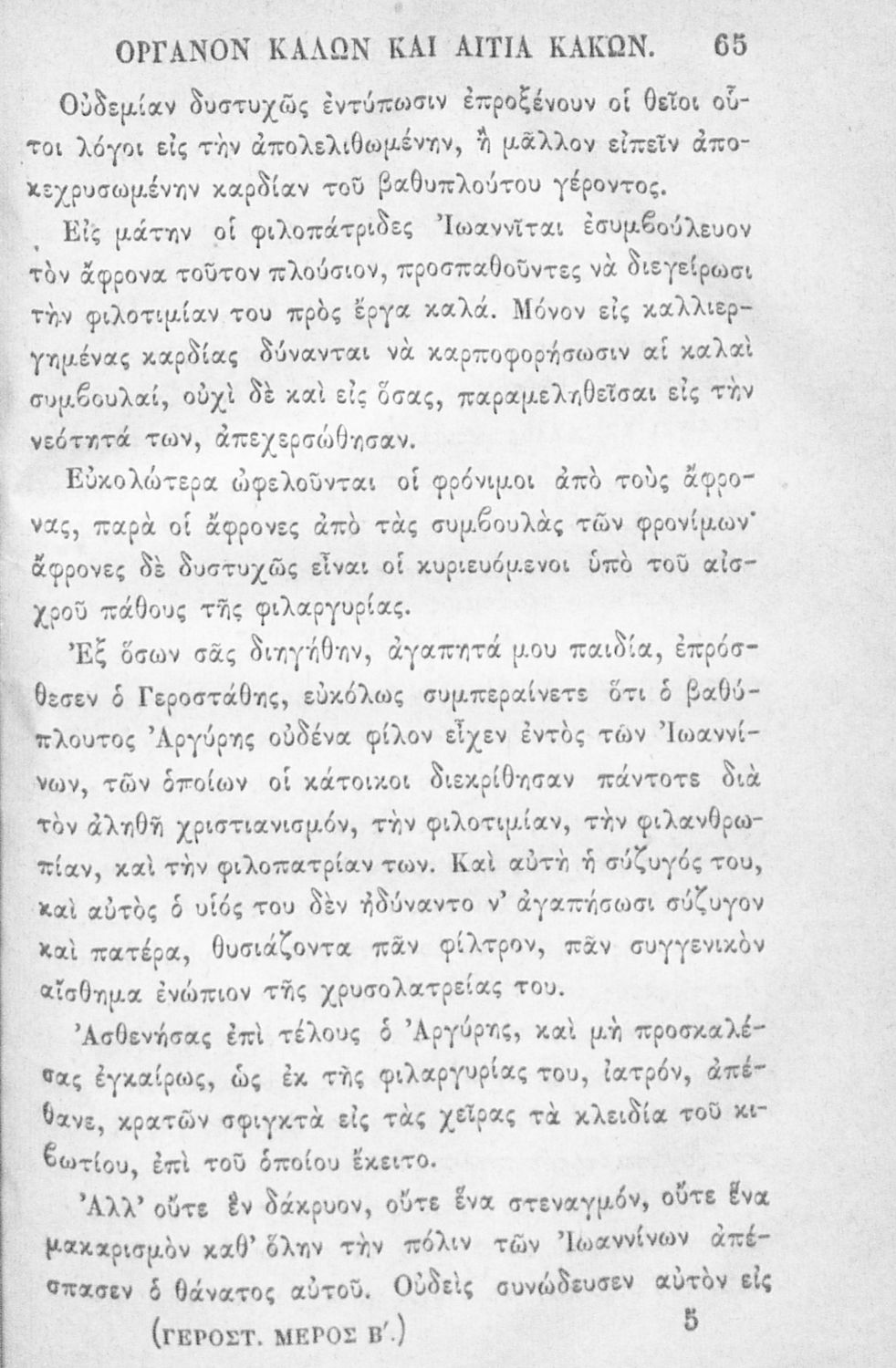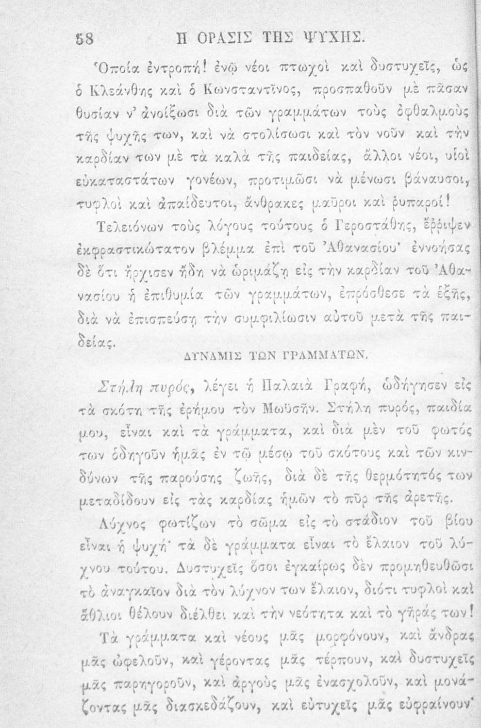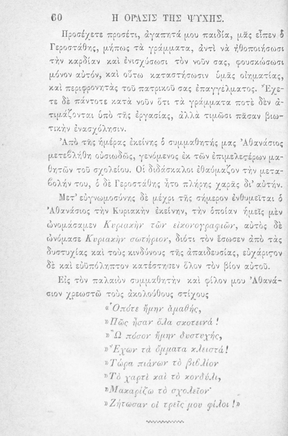 Αναγνωστικό των ανωτέρων τάξεων του Δημοτικού. Το βιβλίο χρησιμοποιήθηκε αρχικά ως ελεύθερο ανάγνωσμα για παιδιά, ενώ στη συνέχεια χρησιμοποιήθηκε ως Αναγνωστικό στο δεύτερο μισό του 19ου αιώνα. Περιέχει αφηγήσεις κυρίως από την αρχαία ελληνική ιστορία και από τη χριστιανική θρησκεία, οι οποίες αποσκοπούν στην εθνική και ηθική καλλιέργεια των μαθητών.