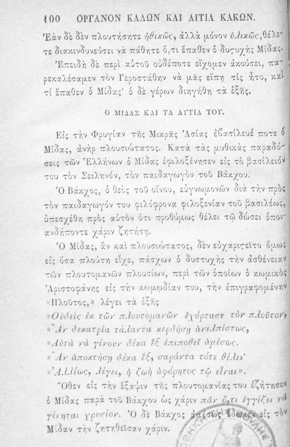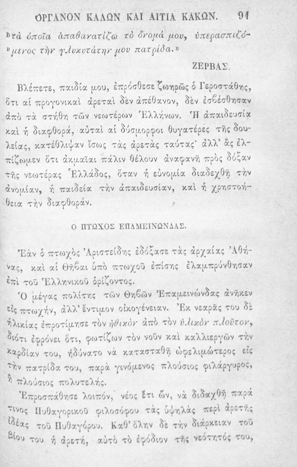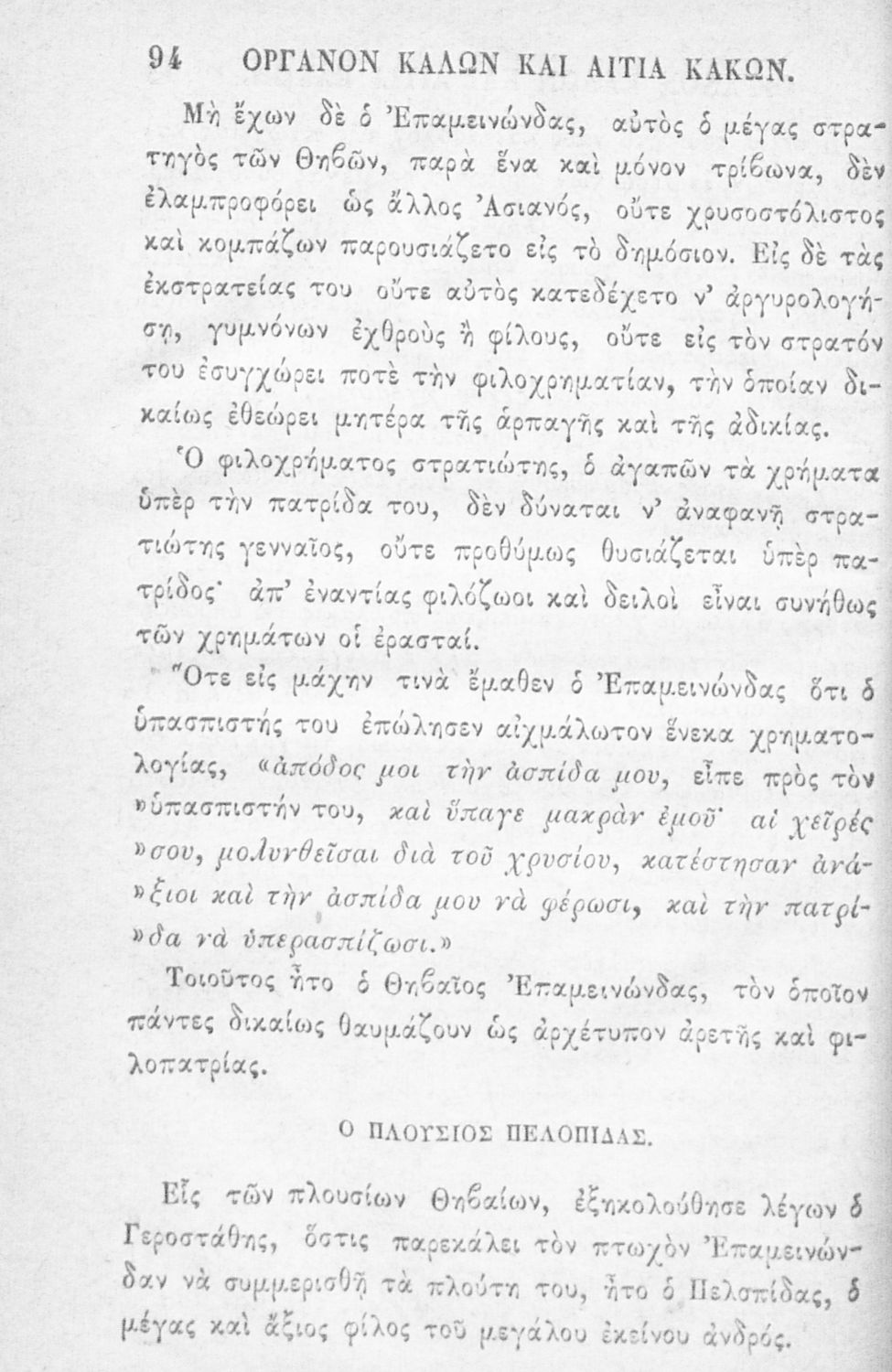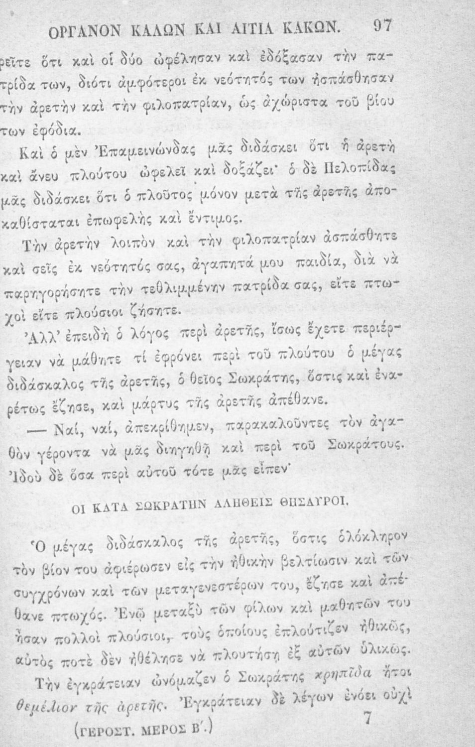 Αναγνωστικό των ανωτέρων τάξεων του Δημοτικού. Το βιβλίο χρησιμοποιήθηκε αρχικά ως ελεύθερο ανάγνωσμα για παιδιά, ενώ στη συνέχεια χρησιμοποιήθηκε ως Αναγνωστικό στο δεύτερο μισό του 19ου αιώνα. Περιέχει αφηγήσεις κυρίως από την αρχαία ελληνική ιστορία και από τη χριστιανική θρησκεία, οι οποίες αποσκοπούν στην εθνική και ηθική καλλιέργεια των μαθητών.