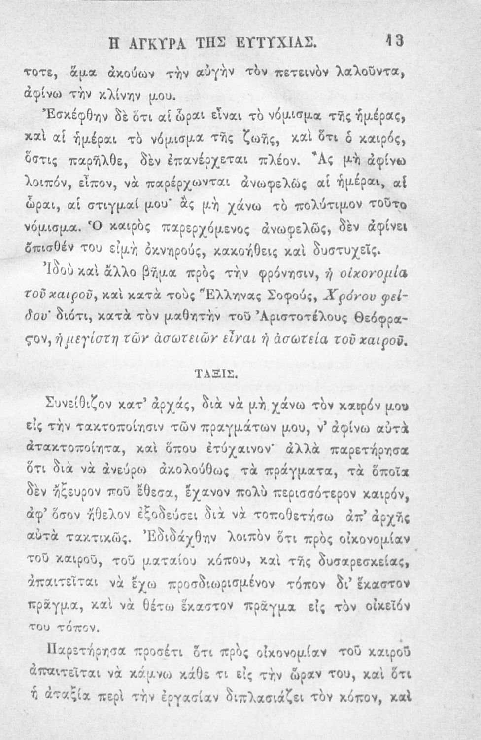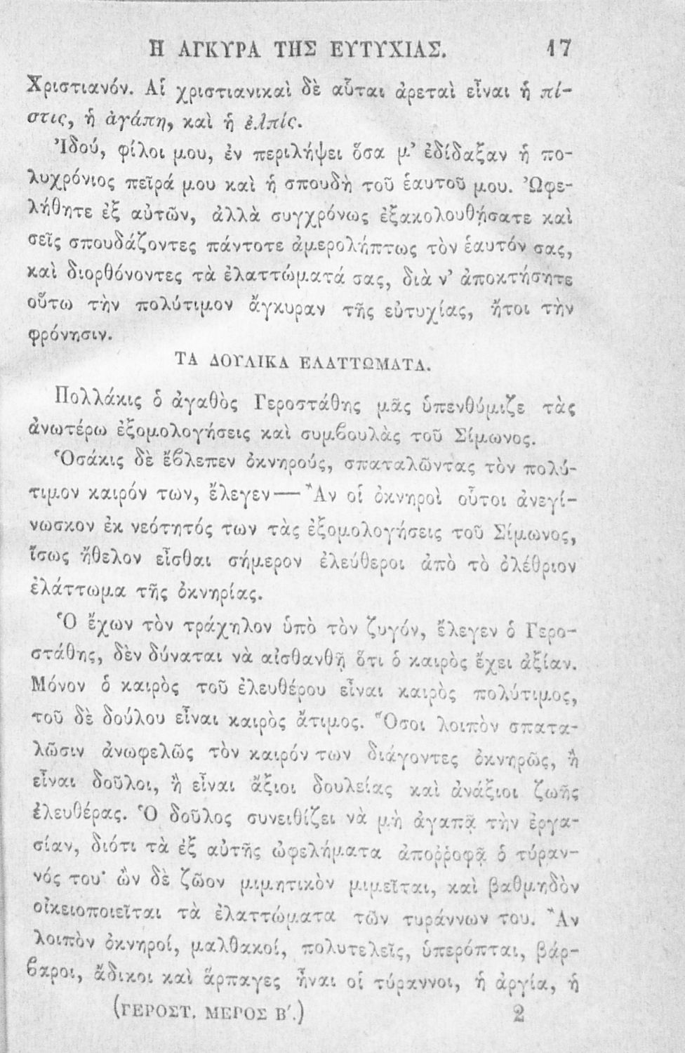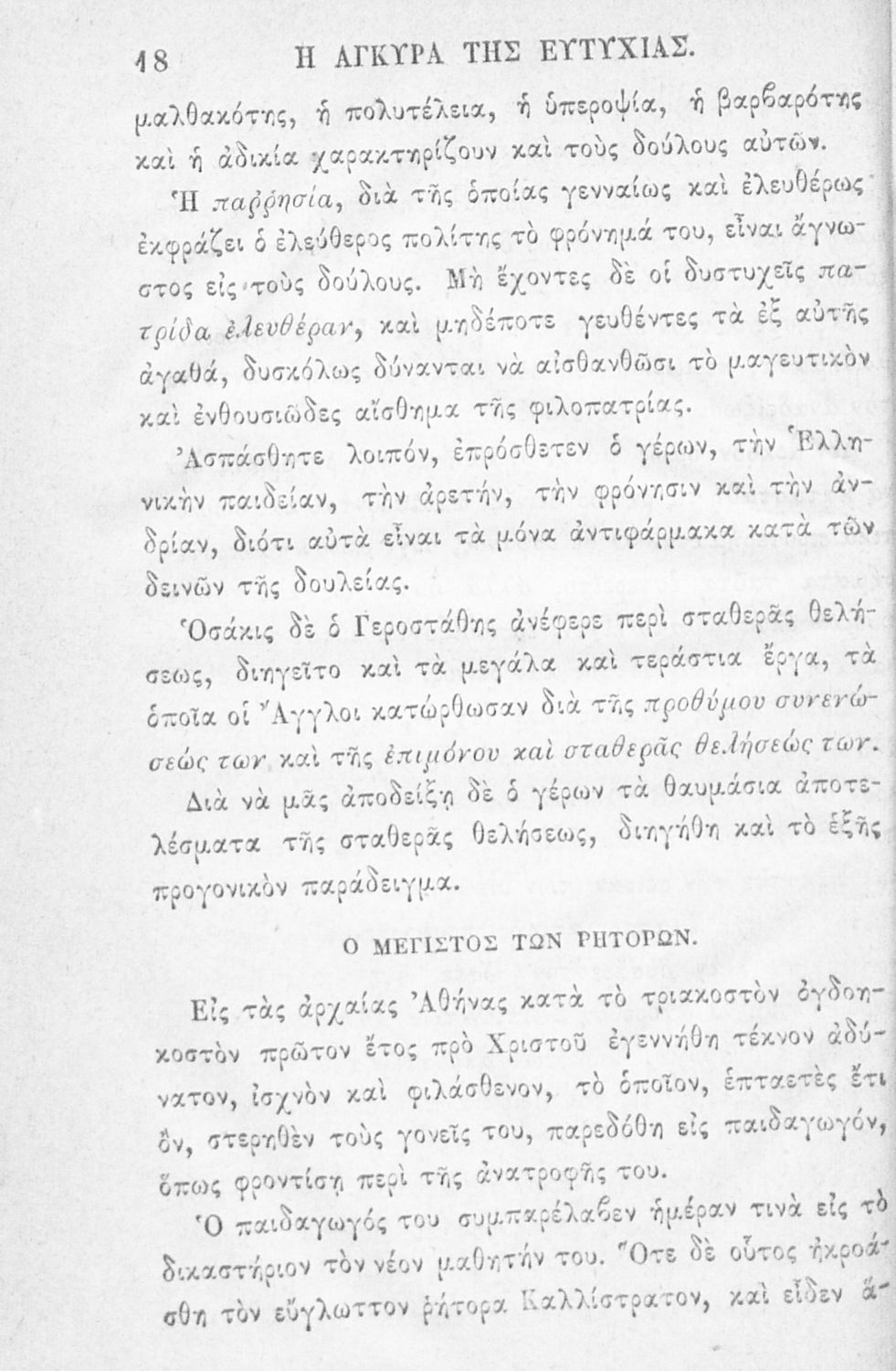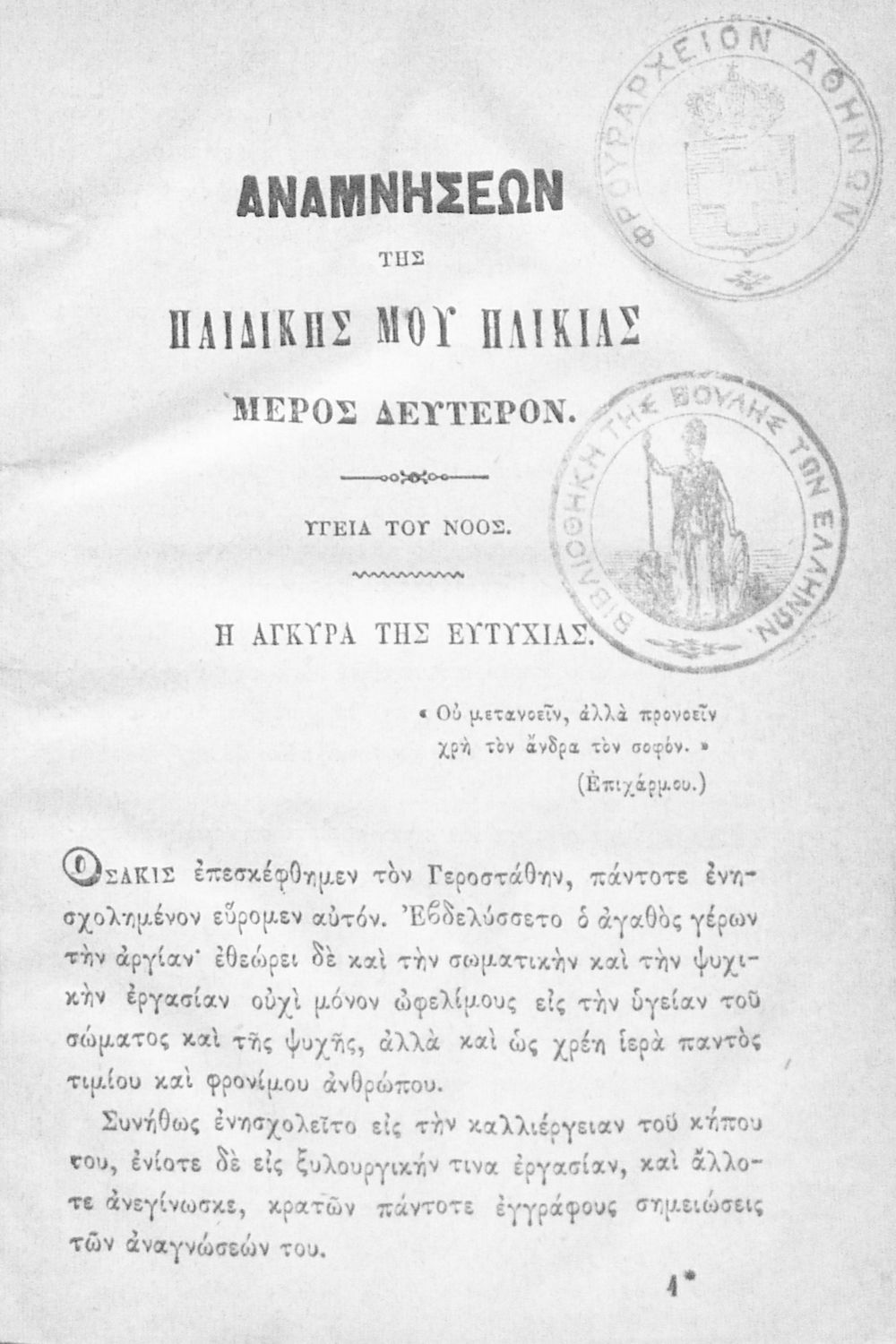 Αναγνωστικό των ανωτέρων τάξεων του Δημοτικού. Το βιβλίο χρησιμοποιήθηκε αρχικά ως ελεύθερο ανάγνωσμα για παιδιά, ενώ στη συνέχεια χρησιμοποιήθηκε ως Αναγνωστικό στο δεύτερο μισό του 19ου αιώνα. Περιέχει αφηγήσεις κυρίως από την αρχαία ελληνική ιστορία και από τη χριστιανική θρησκεία, οι οποίες αποσκοπούν στην εθνική και ηθική καλλιέργεια των μαθητών.