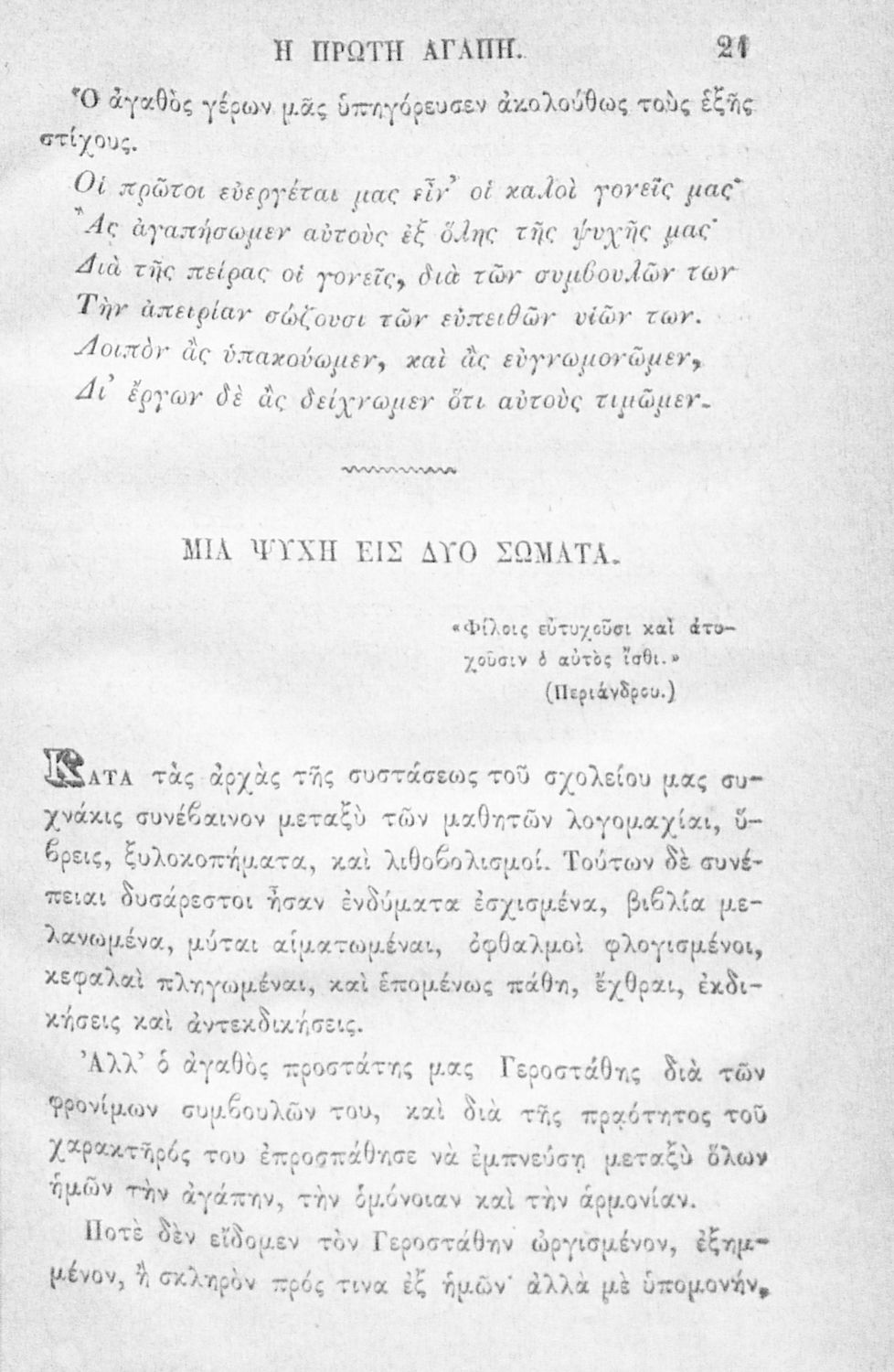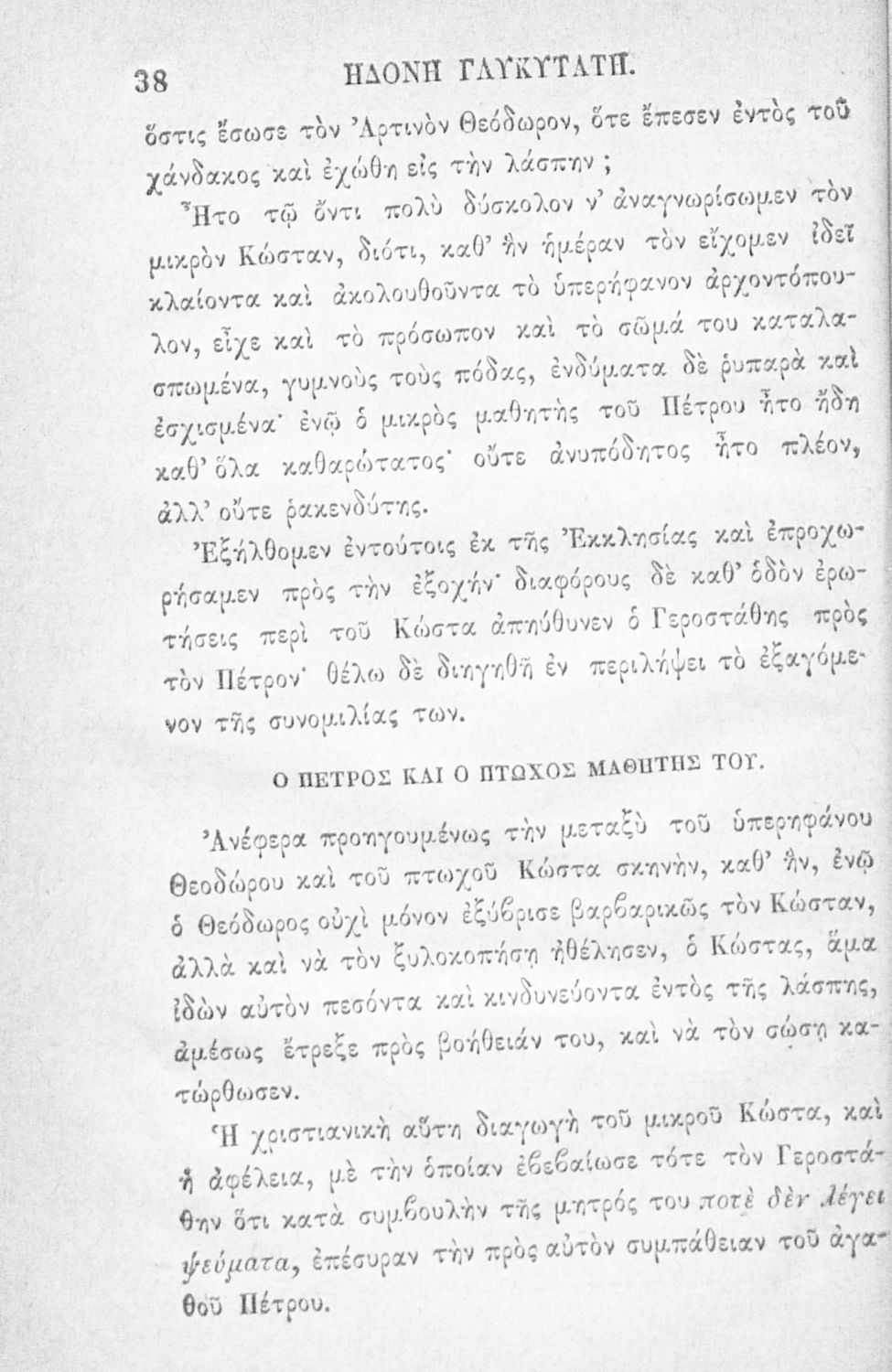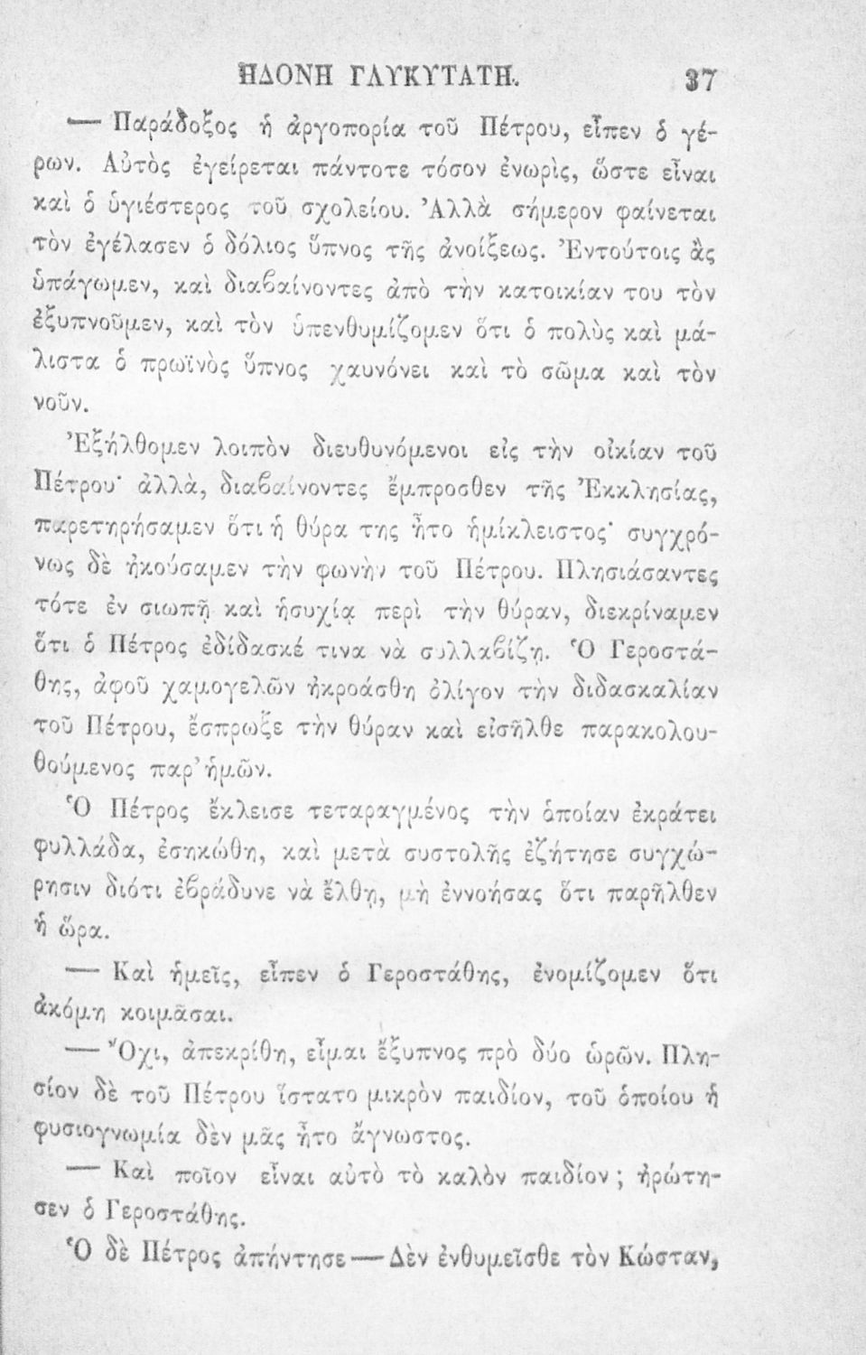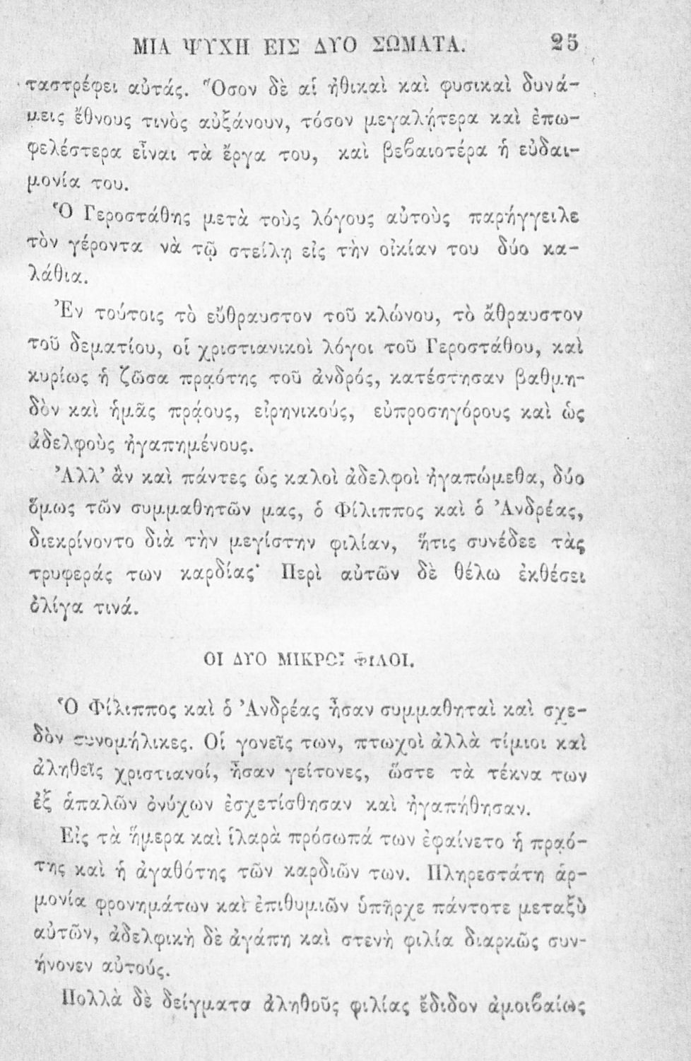 520 ## _aΑναγνωστικό των ανωτέρων τάξεων του Δημοτικού. Το βιβλίο χρησιμοποιήθηκε αρχικά ως ελεύθερο ανάγνωσμα για παιδιά, ενώ στη συνέχεια χρησιμοποιήθηκε ως Αναγνωστικό στο δεύτερο μισό του 19ου αιώνα. Περιέχει αφηγήσεις κυρίως από την αρχαία ελληνική ιστορία και από τη χριστιανική θρησκεία, οι οποίες αποσκοπούν στην εθνική και ηθική καλλιέργεια των μαθητών.