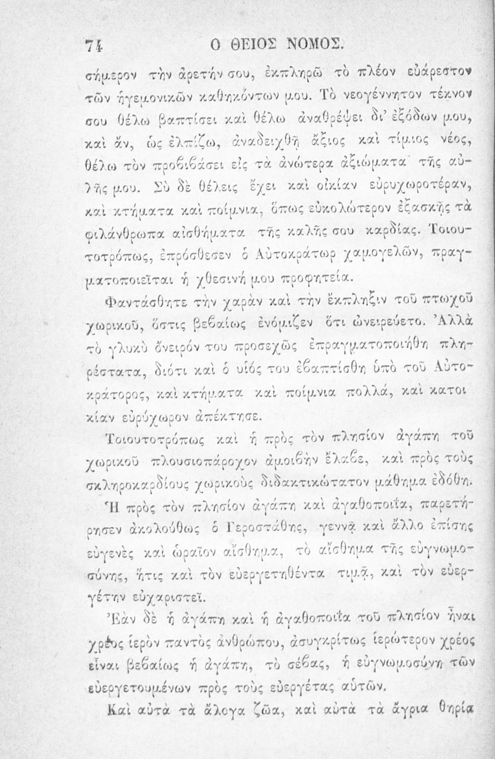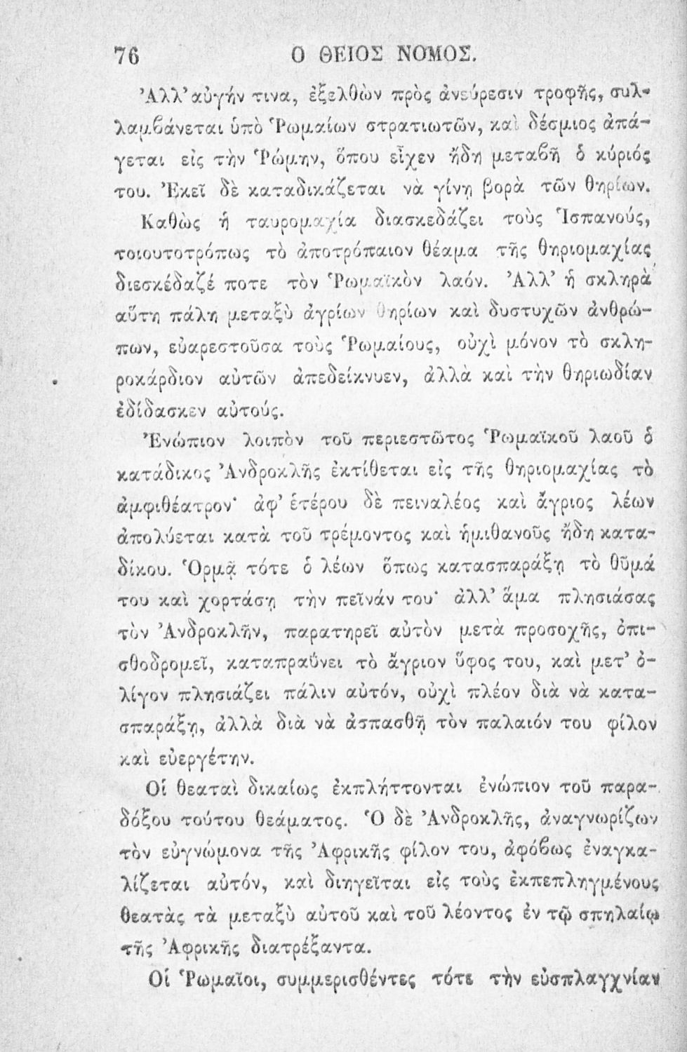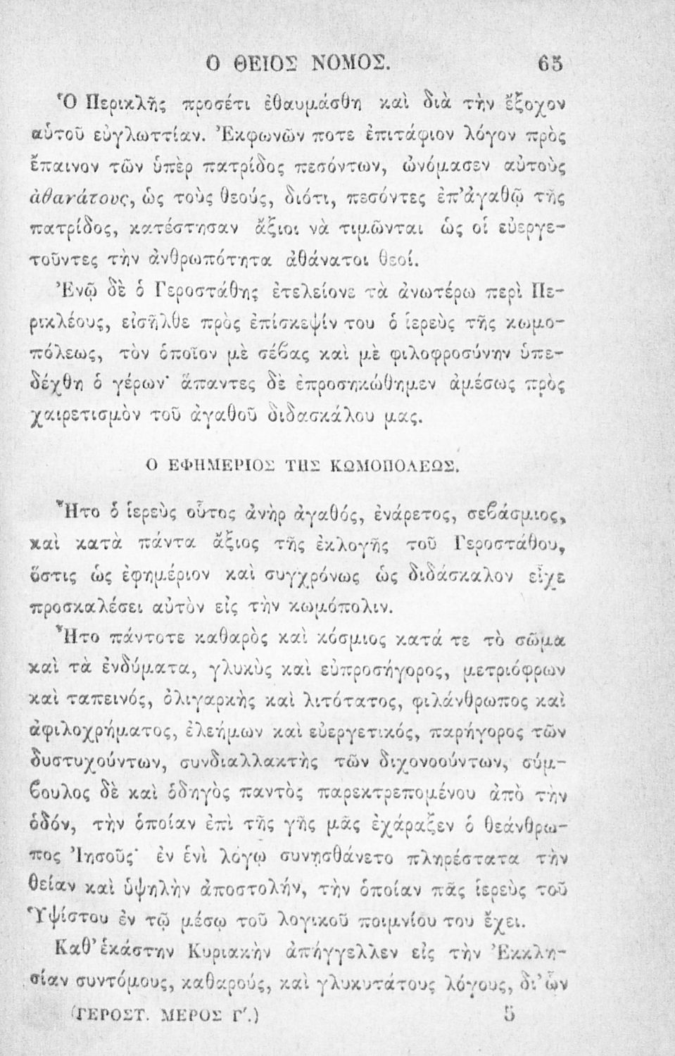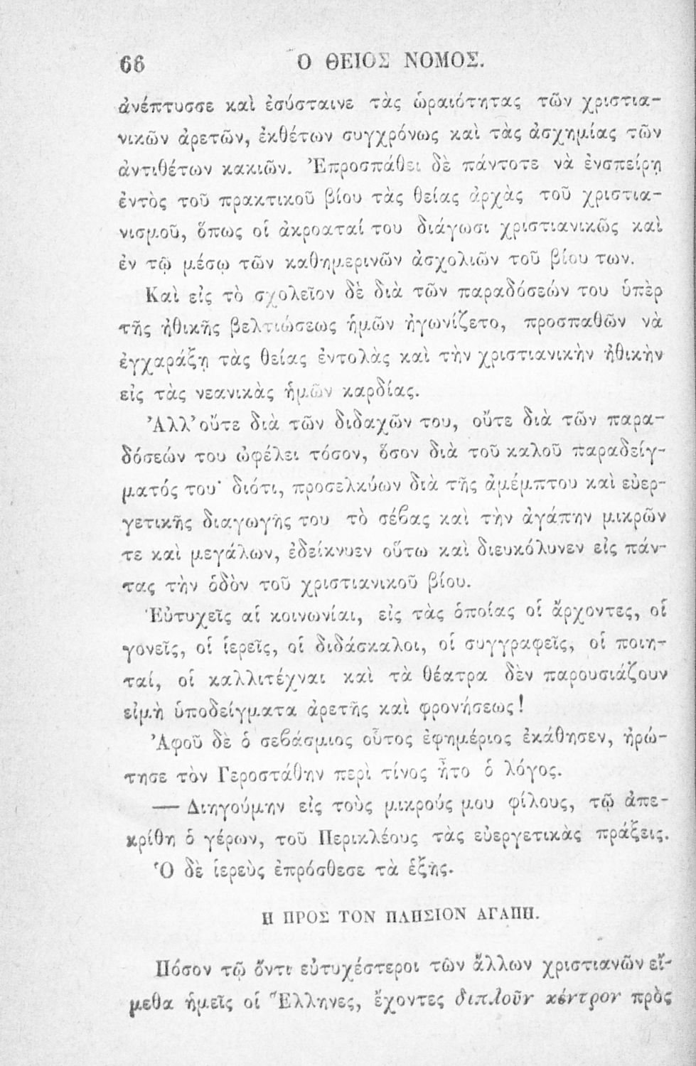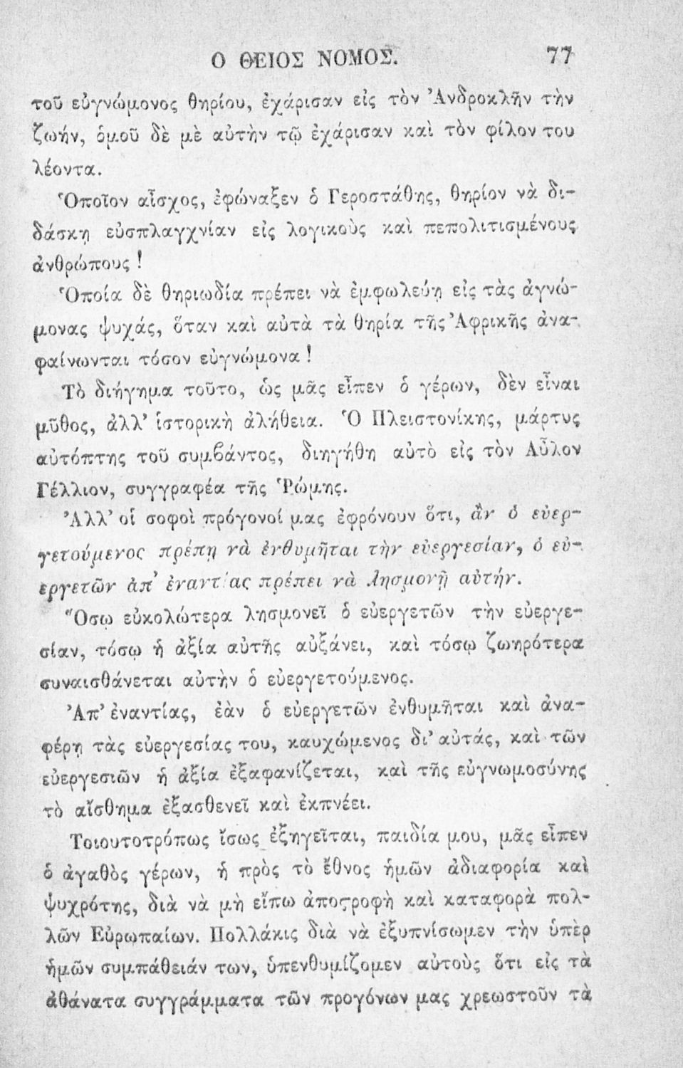 520 ## _aΑναγνωστικό των ανωτέρων τάξεων του Δημοτικού. Το βιβλίο χρησιμοποιήθηκε αρχικά ως ελεύθερο ανάγνωσμα για παιδιά, ενώ στη συνέχεια χρησιμοποιήθηκε ως Αναγνωστικό στο δεύτερο μισό του 19ου αιώνα. Περιέχει αφηγήσεις κυρίως από την αρχαία ελληνική ιστορία και από τη χριστιανική θρησκεία, οι οποίες αποσκοπούν στην εθνική και ηθική καλλιέργεια των μαθητών.