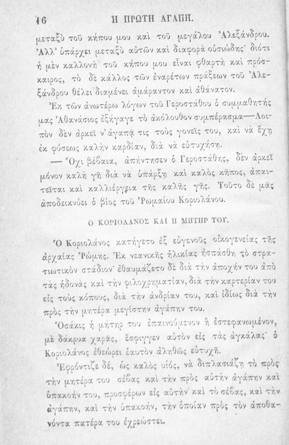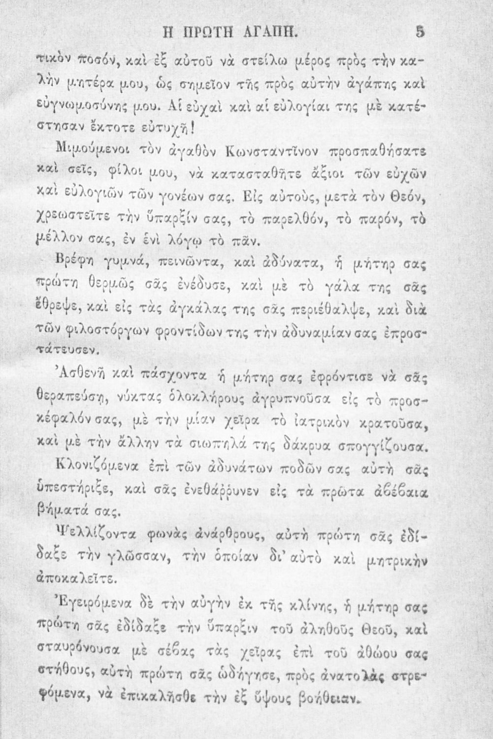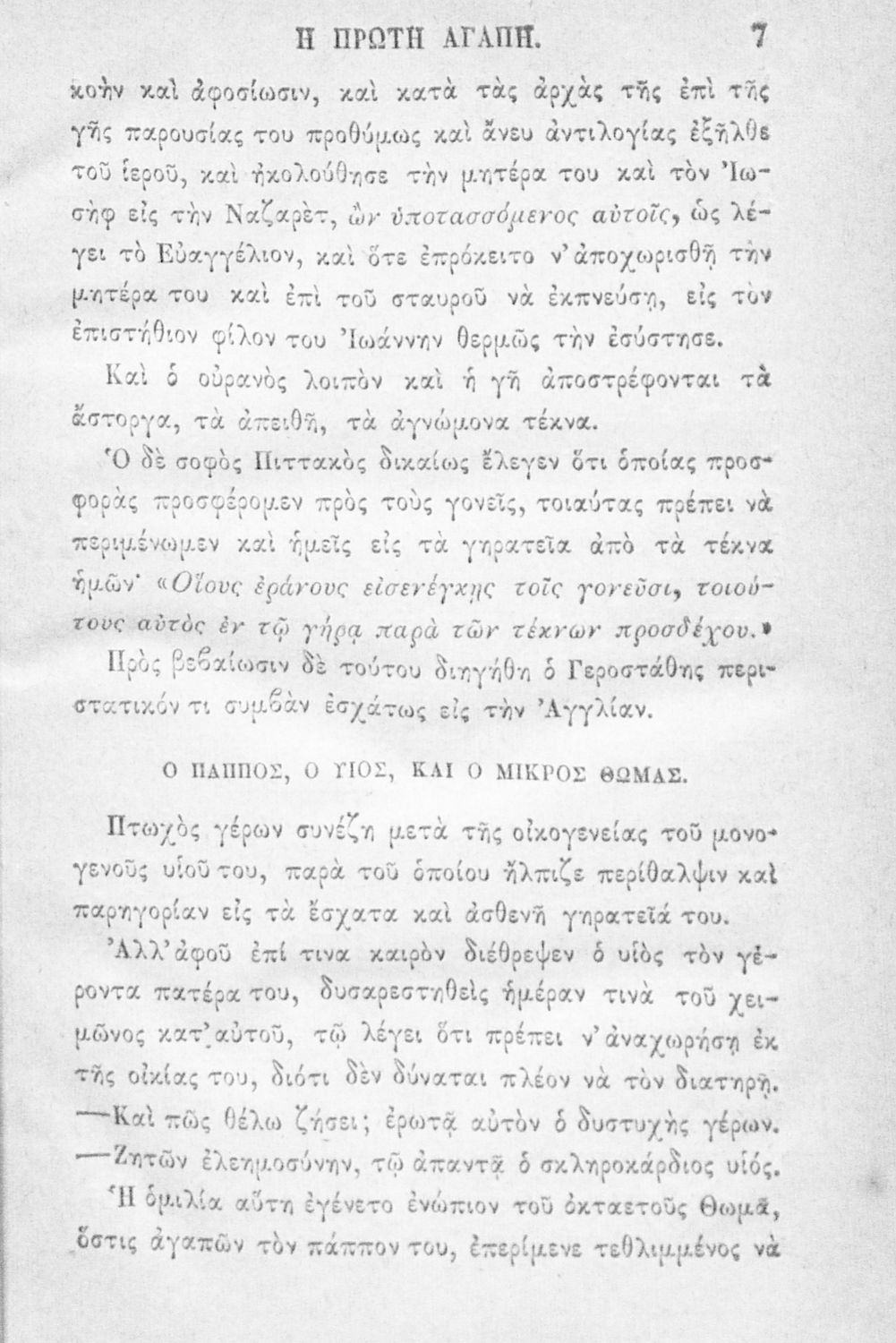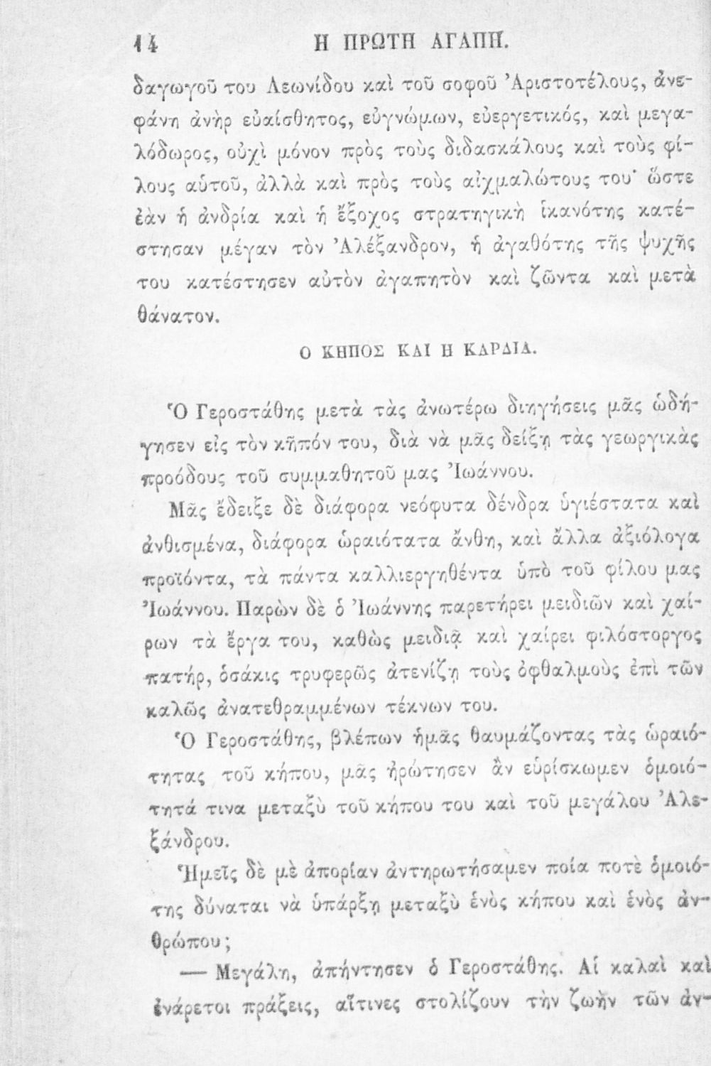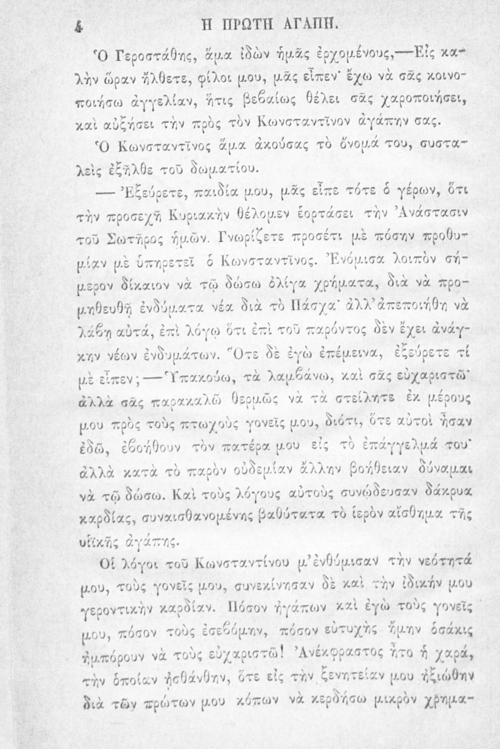 Αναγνωστικό των ανωτέρων τάξεων του Δημοτικού. Το βιβλίο χρησιμοποιήθηκε αρχικά ως ελεύθερο ανάγνωσμα για παιδιά, ενώ στη συνέχεια χρησιμοποιήθηκε ως Αναγνωστικό στο δεύτερο μισό του 19ου αιώνα. Περιέχει αφηγήσεις κυρίως από την αρχαία ελληνική ιστορία και από τη χριστιανική θρησκεία, οι οποίες αποσκοπούν στην εθνική και ηθική καλλιέργεια των μαθητών.