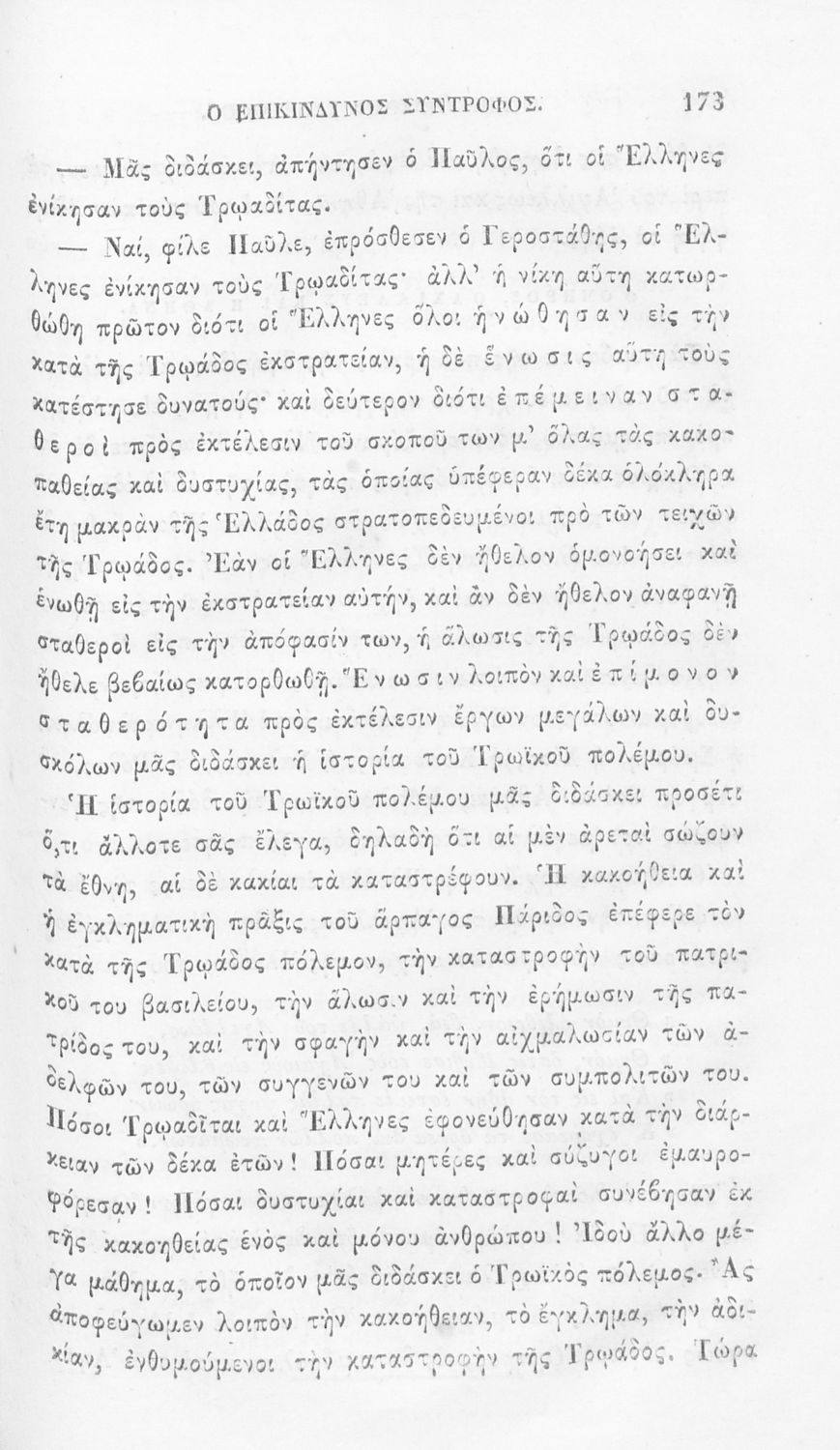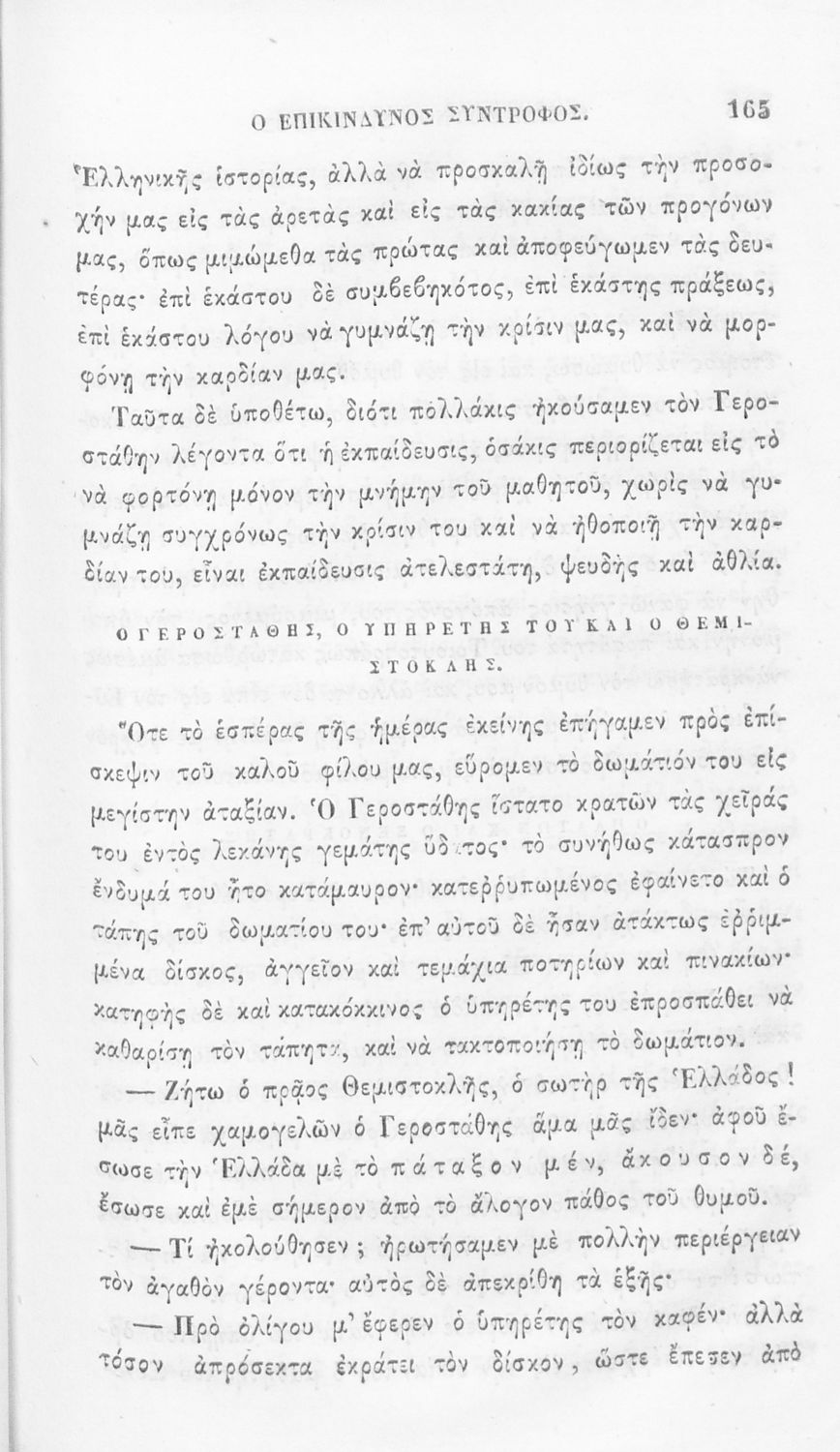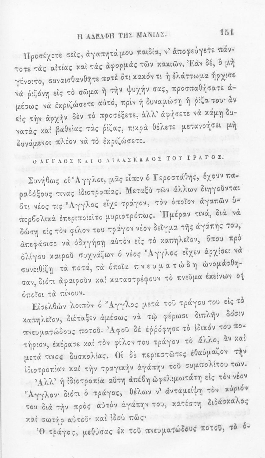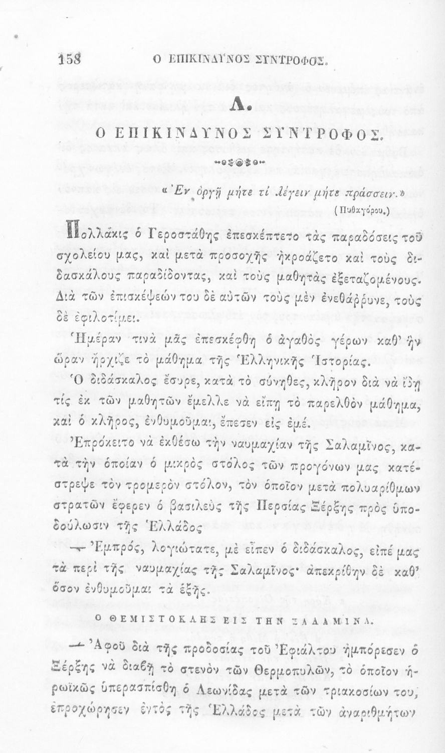 Αναγνωστικό των ανωτέρων τάξεων του Δημοτικού. Το βιβλίο χρησιμοποιήθηκε αρχικά ως ελεύθερο ανάγνωσμα για παιδιά, ενώ στη συνέχεια χρησιμοποιήθηκε ως Αναγνωστικό στο δεύτερο μισό του 19ου αιώνα. Περιέχει αφηγήσεις κυρίως από την αρχαία ελληνική ιστορία και από τη χριστιανική θρησκεία, οι οποίες αποσκοπούν στην εθνική και ηθική καλλιέργεια των μαθητών.
