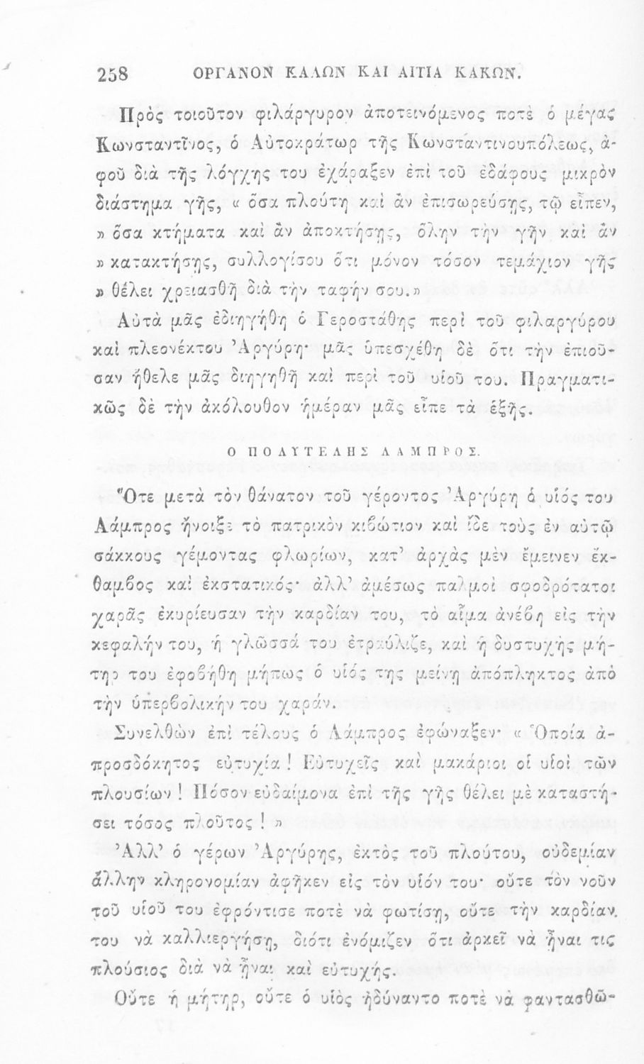 Αναγνωστικό των ανωτέρων τάξεων του Δημοτικού. Το βιβλίο χρησιμοποιήθηκε αρχικά ως ελεύθερο ανάγνωσμα για παιδιά, ενώ στη συνέχεια χρησιμοποιήθηκε ως Αναγνωστικό στο δεύτερο μισό του 19ου αιώνα. Περιέχει αφηγήσεις κυρίως από την αρχαία ελληνική ιστορία και από τη χριστιανική θρησκεία, οι οποίες αποσκοπούν στην εθνική και ηθική καλλιέργεια των μαθητών.