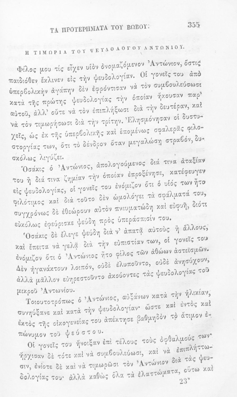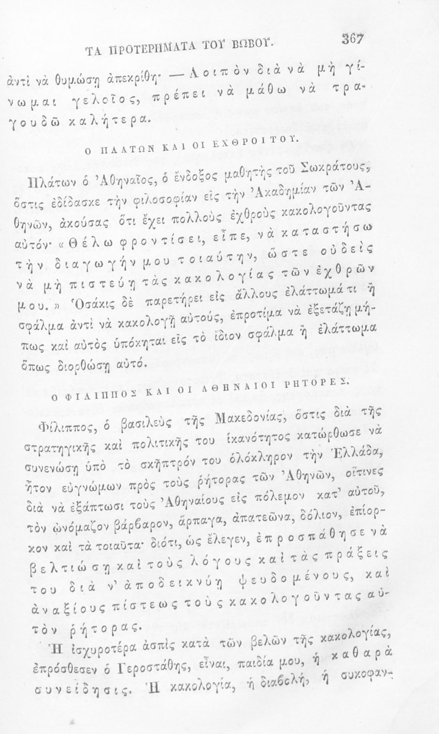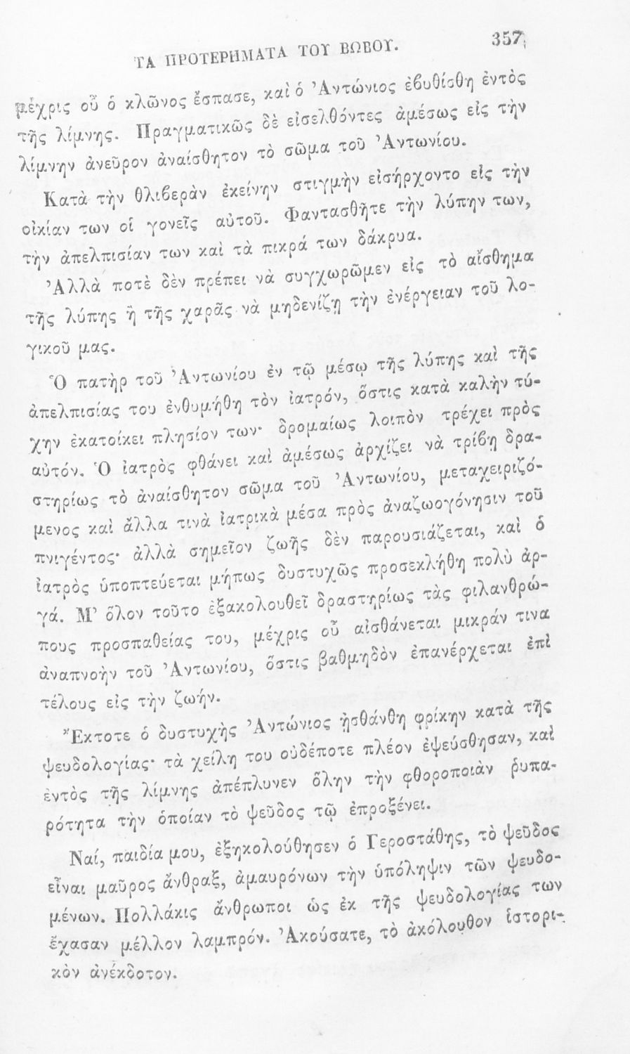 Αναγνωστικό των ανωτέρων τάξεων του Δημοτικού. Το βιβλίο χρησιμοποιήθηκε αρχικά ως ελεύθερο ανάγνωσμα για παιδιά, ενώ στη συνέχεια χρησιμοποιήθηκε ως Αναγνωστικό στο δεύτερο μισό του 19ου αιώνα. Περιέχει αφηγήσεις κυρίως από την αρχαία ελληνική ιστορία και από τη χριστιανική θρησκεία, οι οποίες αποσκοπούν στην εθνική και ηθική καλλιέργεια των μαθητών.