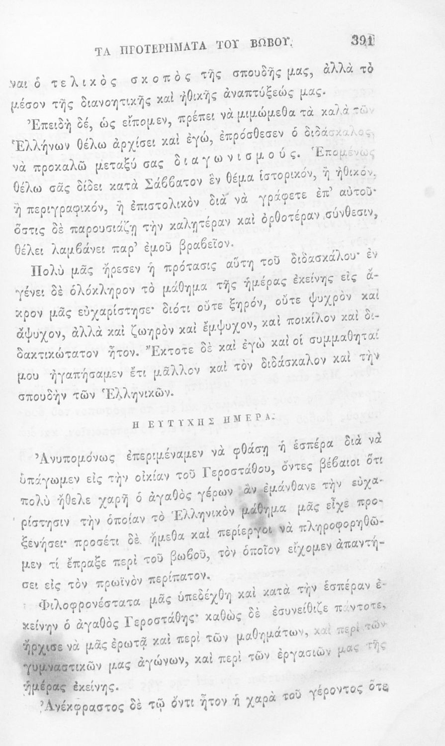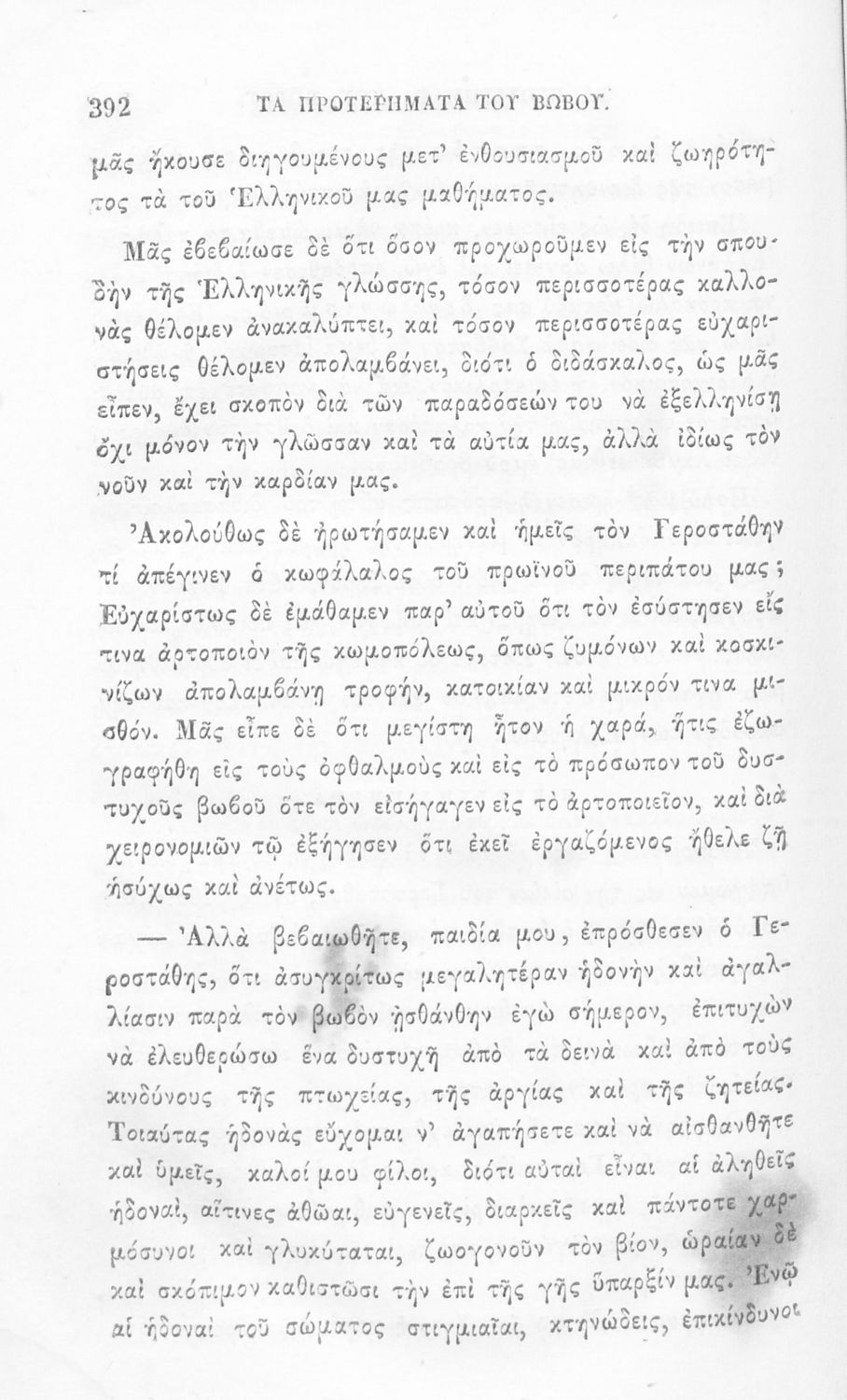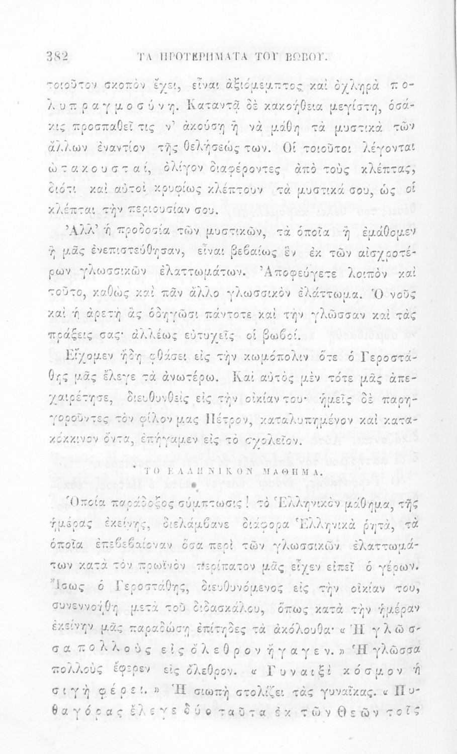 Αναγνωστικό των ανωτέρων τάξεων του Δημοτικού. Το βιβλίο χρησιμοποιήθηκε αρχικά ως ελεύθερο ανάγνωσμα για παιδιά, ενώ στη συνέχεια χρησιμοποιήθηκε ως Αναγνωστικό στο δεύτερο μισό του 19ου αιώνα. Περιέχει αφηγήσεις κυρίως από την αρχαία ελληνική ιστορία και από τη χριστιανική θρησκεία, οι οποίες αποσκοπούν στην εθνική και ηθική καλλιέργεια των μαθητών.