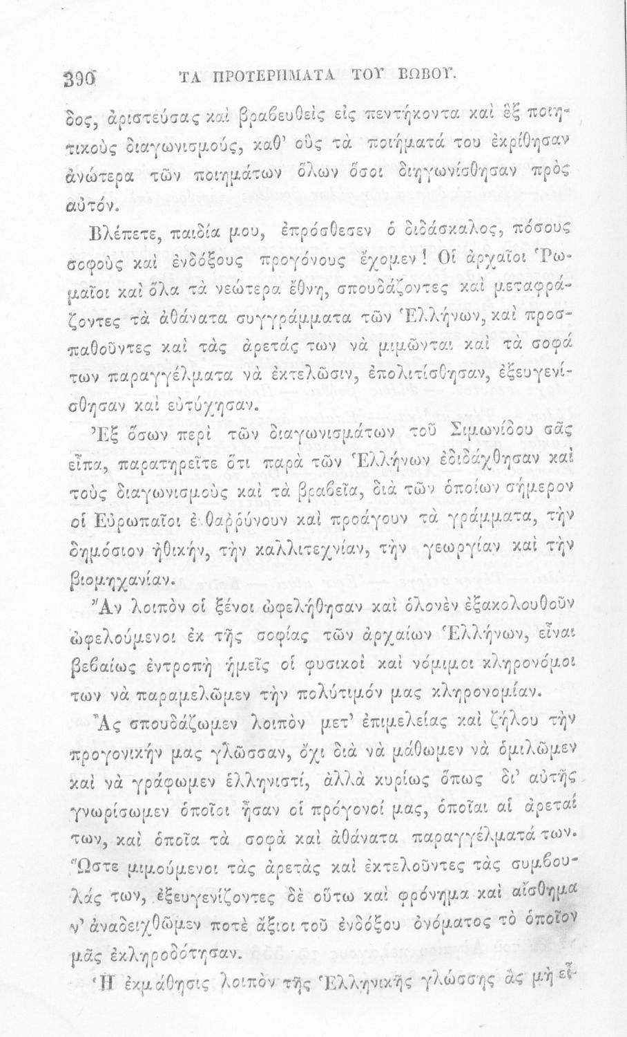 Βαθμίδα εκπαίδευσης: Πρωτοβάθμια Μάθημα: Νέα Ελληνικά Γλώσσα: Καθαρεύουσα Παρουσίαση περιεχομένου: Αναγνωστικό των ανωτέρων τάξεων του Δημοτικού. Το βιβλίο χρησιμοποιήθηκε αρχικά ως ελεύθερο ανάγνωσμα για παιδιά, ενώ στη συνέχεια χρησιμοποιήθηκε ως Αναγνωστικό στο δεύτερο μισό του 19ου αιώνα. Περιέχει αφηγήσεις κυρίως από την αρχαία ελληνική ιστορία και από τη χριστιανική θρησκεία, οι οποίες αποσκοπούν στην εθνική και ηθική καλλιέργεια των μαθητών. |