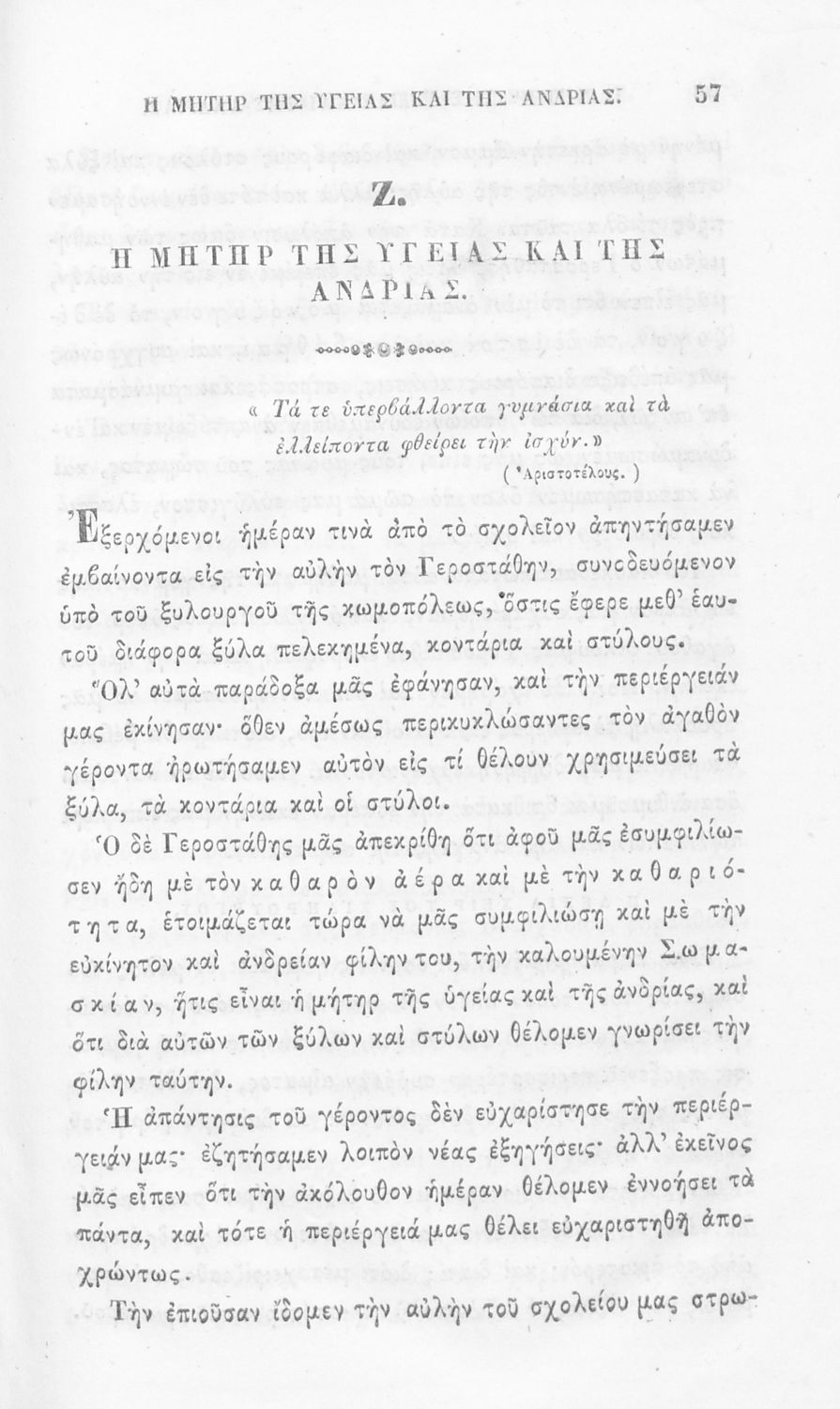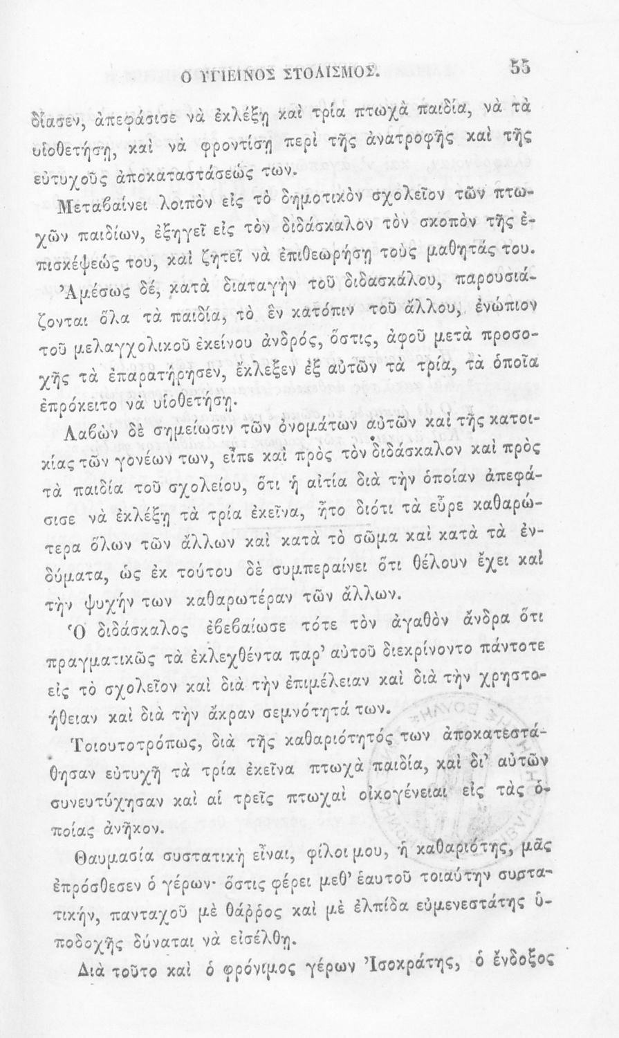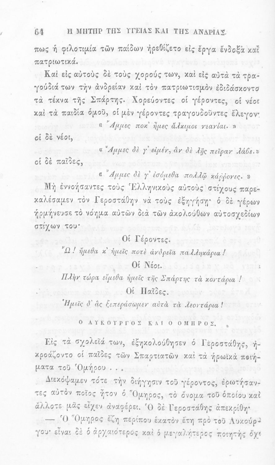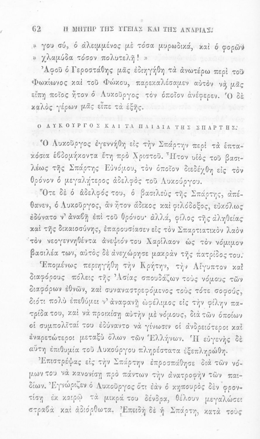 Αναγνωστικό των ανωτέρων τάξεων του Δημοτικού. Το βιβλίο χρησιμοποιήθηκε αρχικά ως ελεύθερο ανάγνωσμα για παιδιά, ενώ στη συνέχεια χρησιμοποιήθηκε ως Αναγνωστικό στο δεύτερο μισό του 19ου αιώνα. Περιέχει αφηγήσεις κυρίως από την αρχαία ελληνική ιστορία και από τη χριστιανική θρησκεία, οι οποίες αποσκοπούν στην εθνική και ηθική καλλιέργεια των μαθητών.