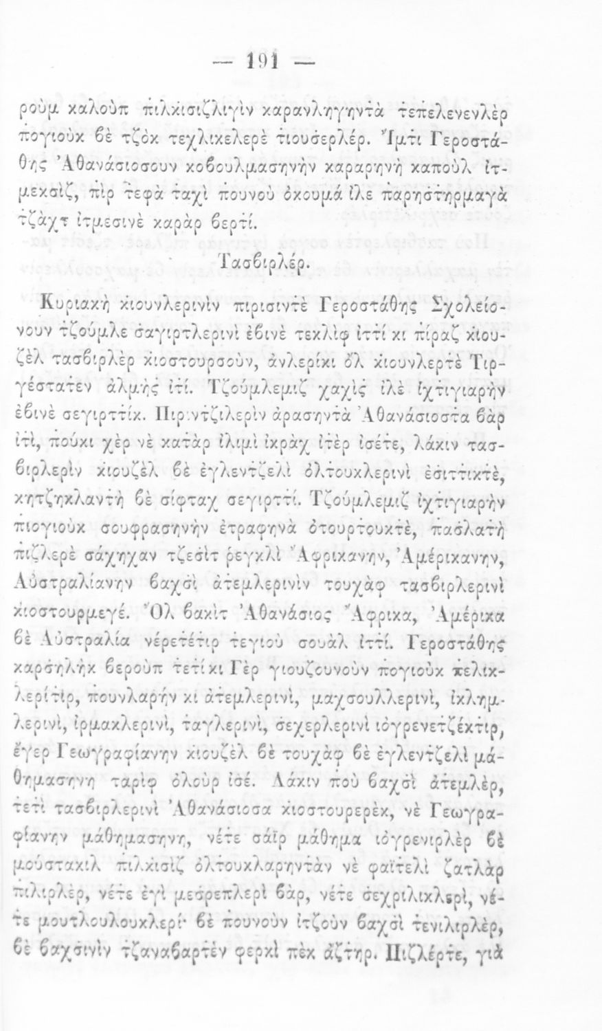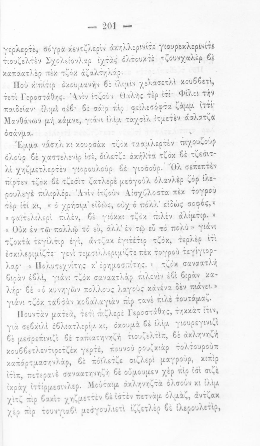 Βαθμίδα εκπαίδευσης: Πρωτοβάθμια Μάθημα: Νέα Ελληνικά Γλώσσα: Καραμανλίδικα Παρουσίαση περιεχομένου: Αναγνωστικό Δημοτικού που χρησιμοποιήθηκε αρχικά ως ελεύθερο ανάγνωσμα και στη συνέχεια ως σχολικό εγχειρίδιο. Μακράν το μακροβιότερο αναγνωστικό Δημοτικού και το μόνο που μεταφράστηκε για να καλύψει τις ανάγκες των ελληνικών κοινοτήτων της Οθωμανικής Αυτοκρατορίας. Εκφράζει τις αξίες της φιλελεύθερης αστικής τάξης και κυρίως την ευνομία, τον αλληλοσεβασμό, την παιδεία, την κοινωνική αλληλεγγύη, την καθαριότητα, την υγεία, τη φιλία και τη φιλανθρωπία. |